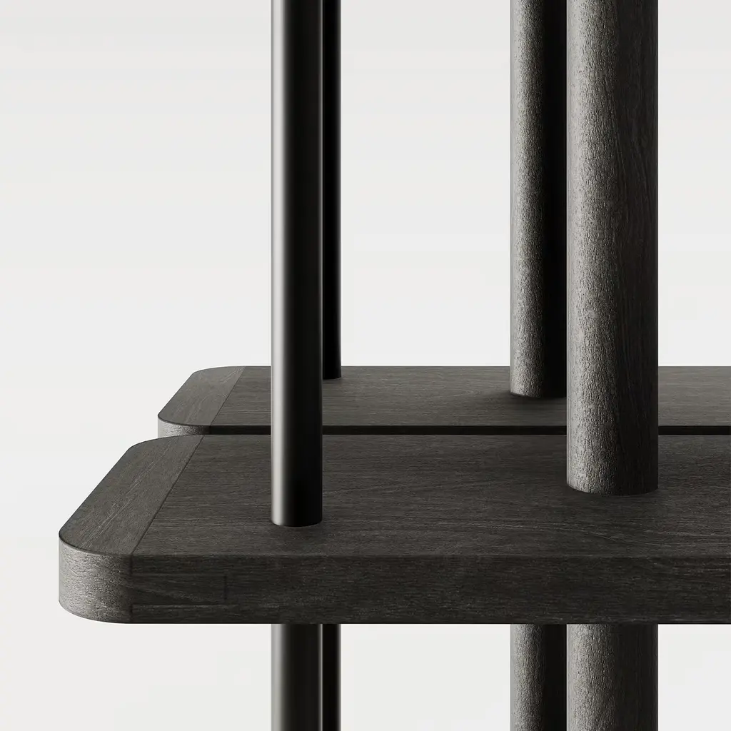 Zenobia comes from the name of the city mentioned in Italo Calvino's work "Invisible Cities". A black bookcase with double-frame struts. A sense of movement and depth is added by their different diameters. Wood and metal absorb and reflect light. Maple shelves run along the entire bookcase, splitting into two sections, and bestowing permeability and lightness upon the bookcase. The latter is crisscrossed by metal cables anchored to the large plate as its base.