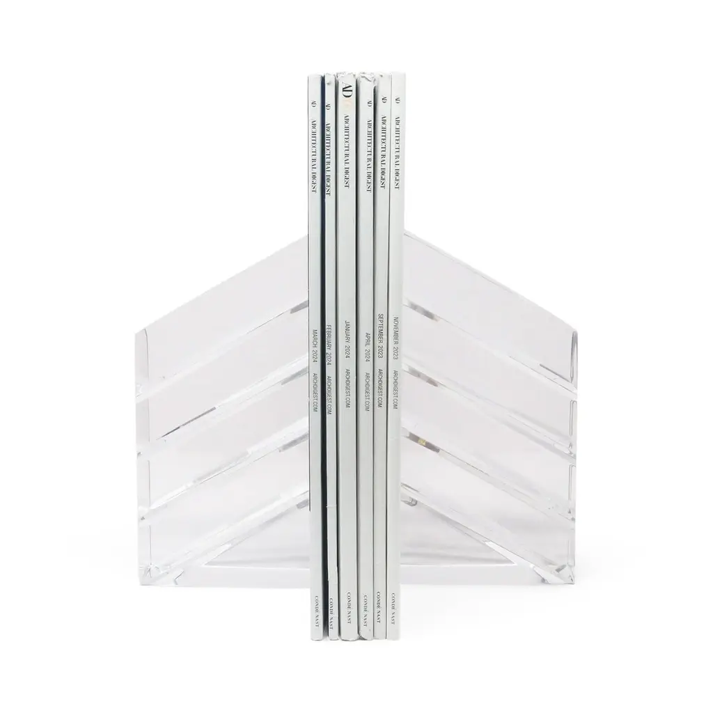 A pair of mid-century modern "Astrolite" lucite bookends by the Ritts Company of Los Angeles that are strikingly etched and polished, which catches and refract lights beautifully. The Ritts Company was owned by Herbert and Shirley Ritts, parents of famed photographer Herb Ritts.In very good vintage condition with very few visible marks. Original sticker on one of the pair.4" x 2.25" x 8" each