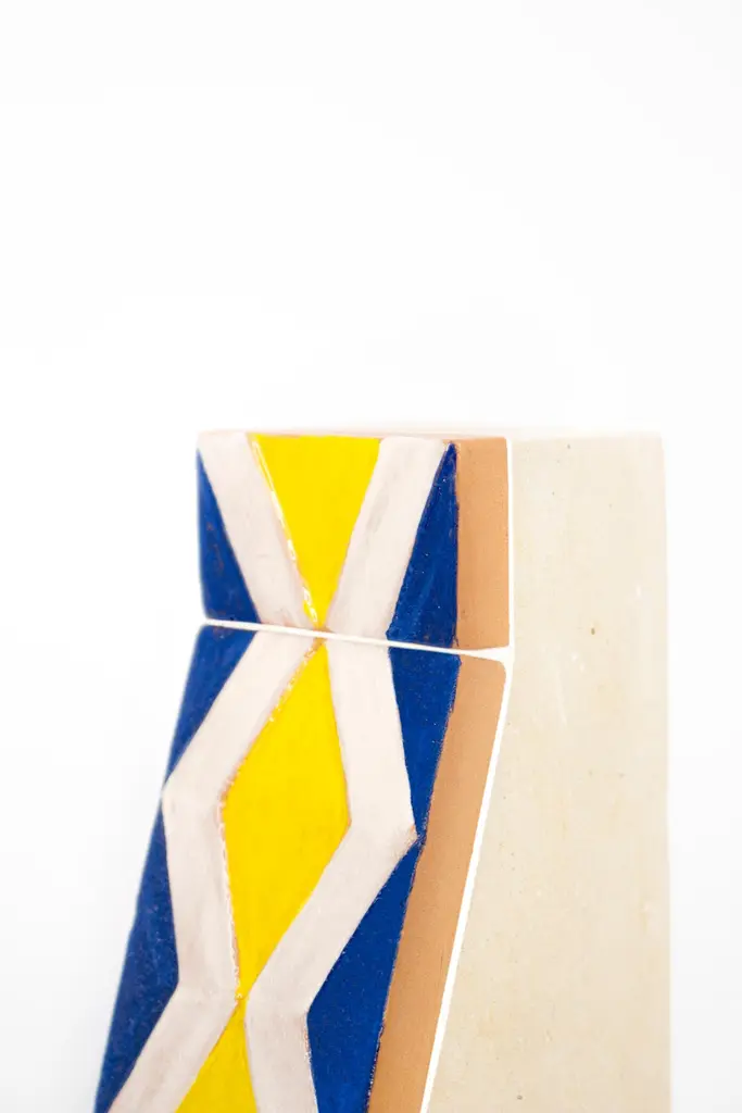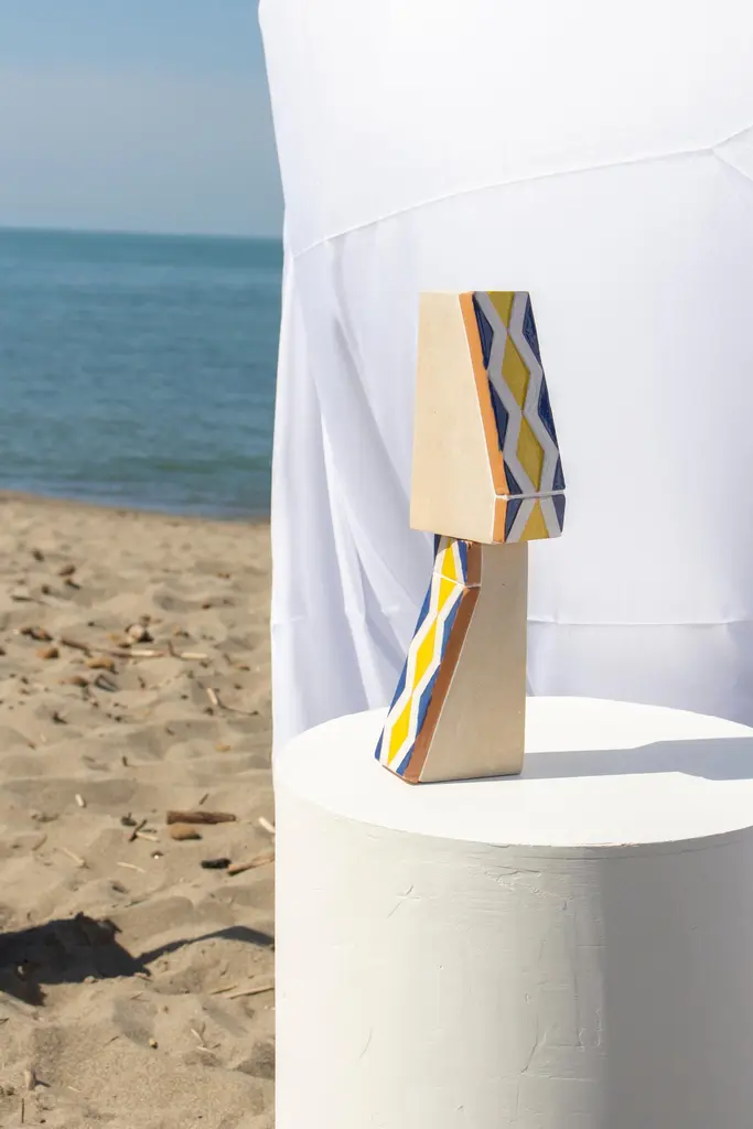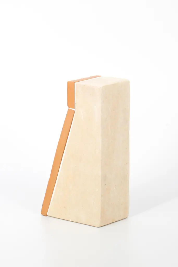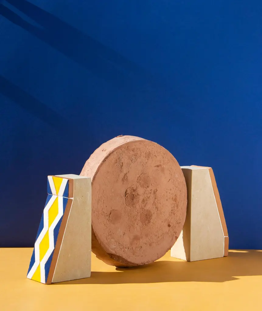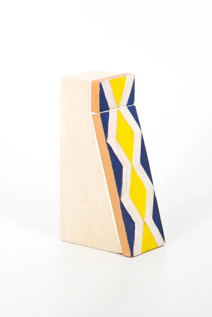 The Apollineo collection mergs classical and contemporary elements to define a unique aesthetic inspired by Mediterranean architecture and vibes. Sun-blessed pure volumes, shapes marked by time, corroded by water and wind. Their colors are warm as the Southern Sun and their surfaces decorated by hand with bright majolica tiles with geometric patterns create an original play of reflections, lights and shadows, grooves and three-dimensional facets. Starting from a quarry ashlar of Leccese stone, a fossiliferous limestone found only in very few quarries in the Salento area near Lecce, all the products are first machine-carved to obtain straight edges and then finished by hand. Stone and clay, basic elements of the architecture of the Mediterranean basin, give rise to miniature architectures.The Apollineo bookend inspired by the buttress is available in two shapes. The decor RIFLESSI is inspired by the play lights and shadows on the water at sunset.NOTE:As handmade and crafted products, each pieces present slight differences from one another due to the process adopted. These make each of them unique, with charming details that render it distinctive and unrepeatable. ADDITIONAL INFO:The wooden box is included in the price.