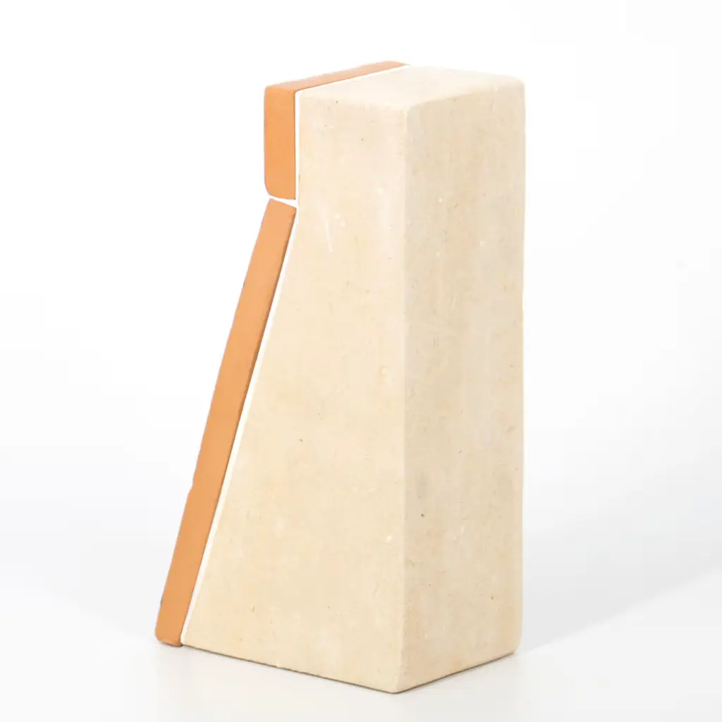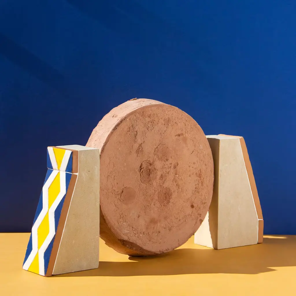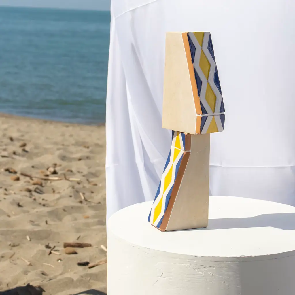 Part of the Apollineo Collection of home decor miniature architectures, this bookend has a stark geometric shape clearly inspired by a buttress, the architectural structure used to support or reinforce walls in ancient Roman buildings. Cut using CNC technology, the soft, pale yellow Lecce stone is hand-finished to enhance the look of an ancient stone marked by time, corroded by water and wind. The front is decorated with small glazed majolica tiles decorated by hand with a diamond pattern in bright colors.