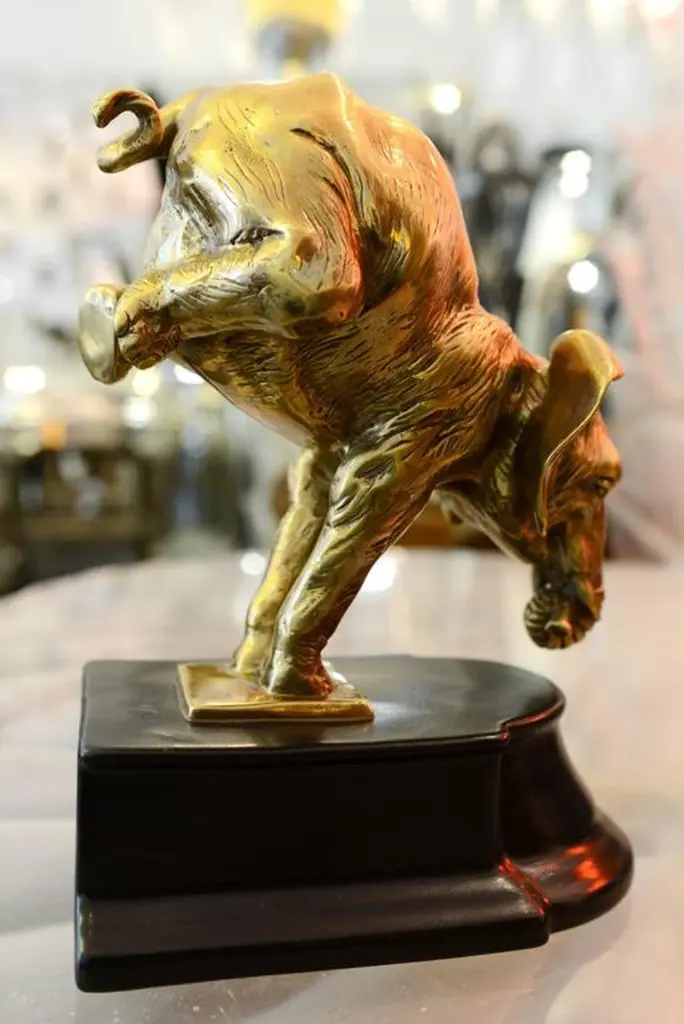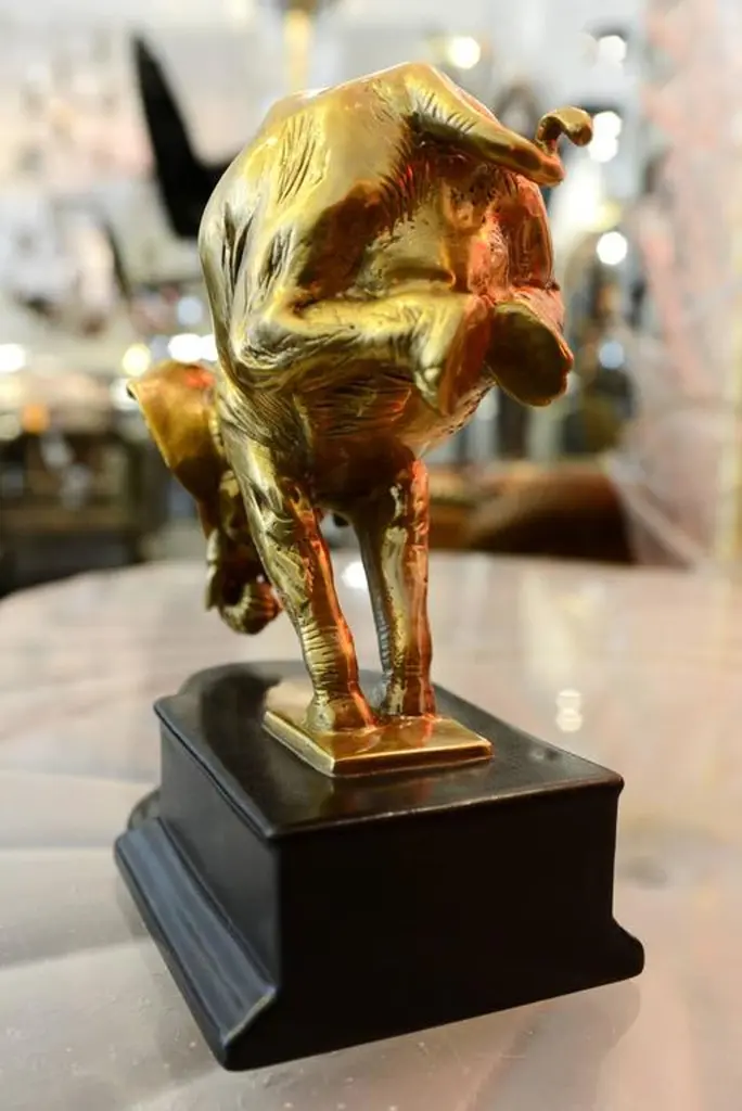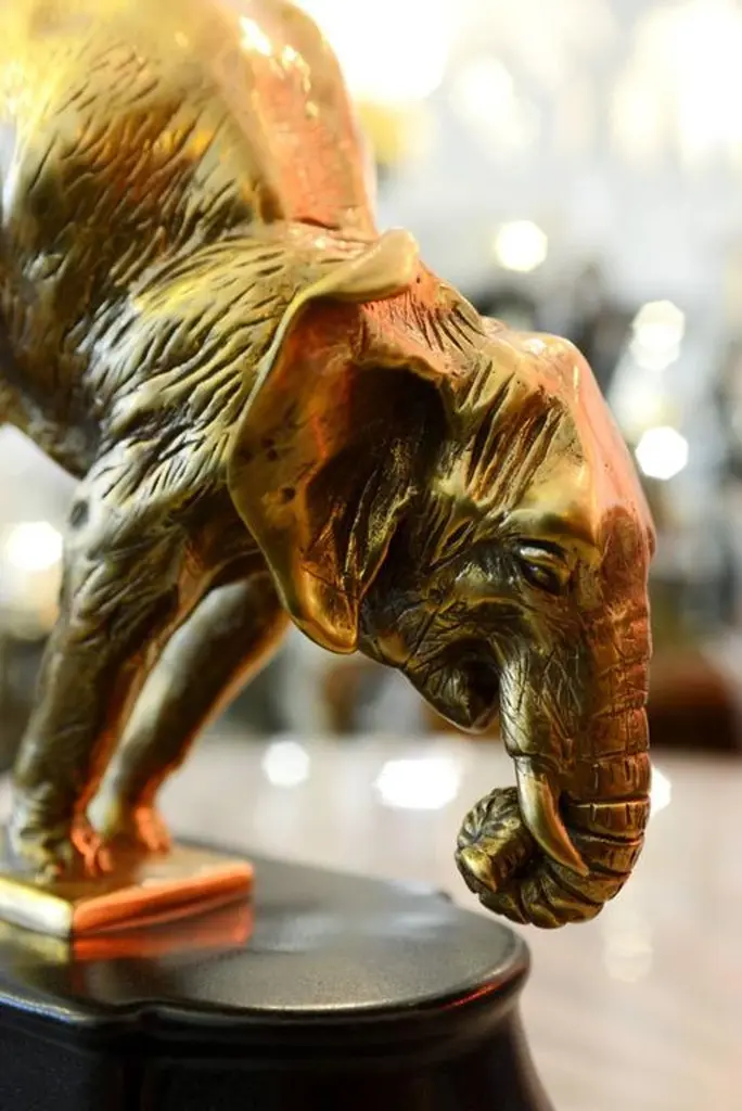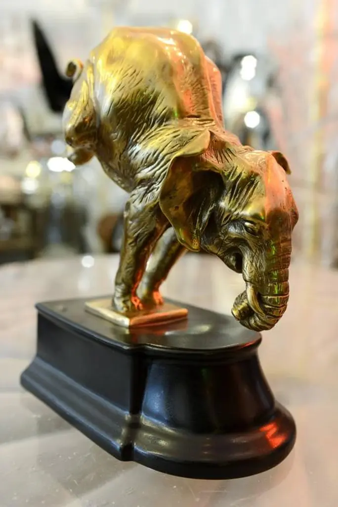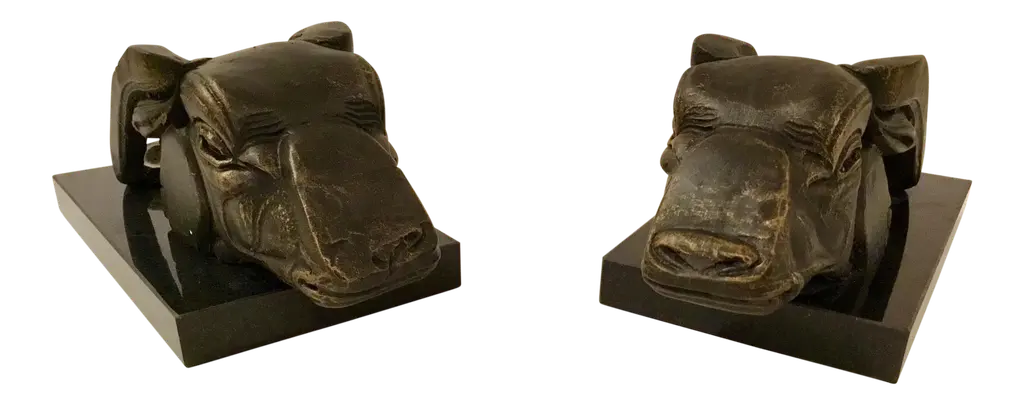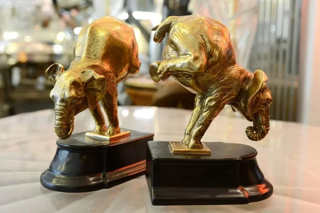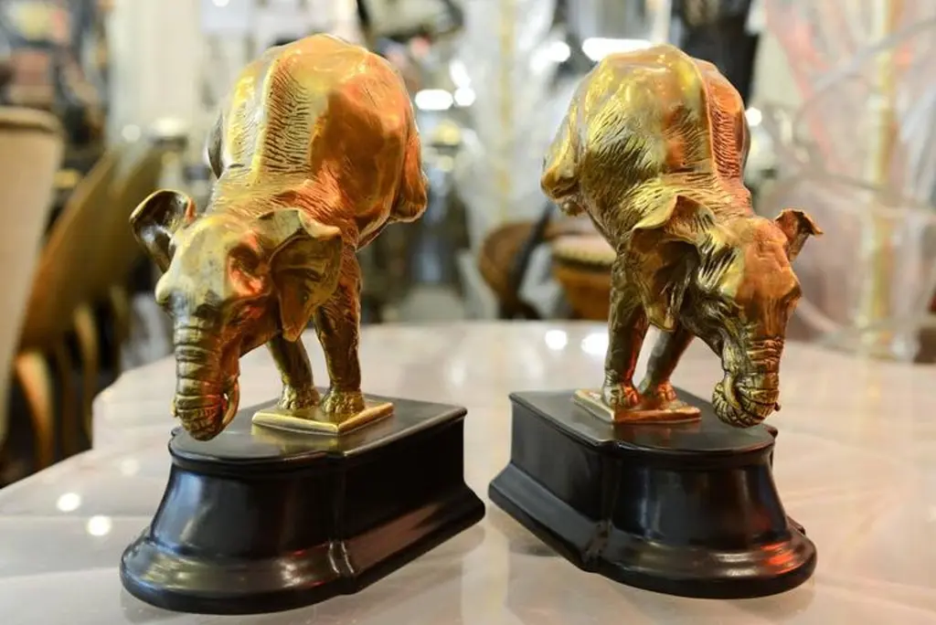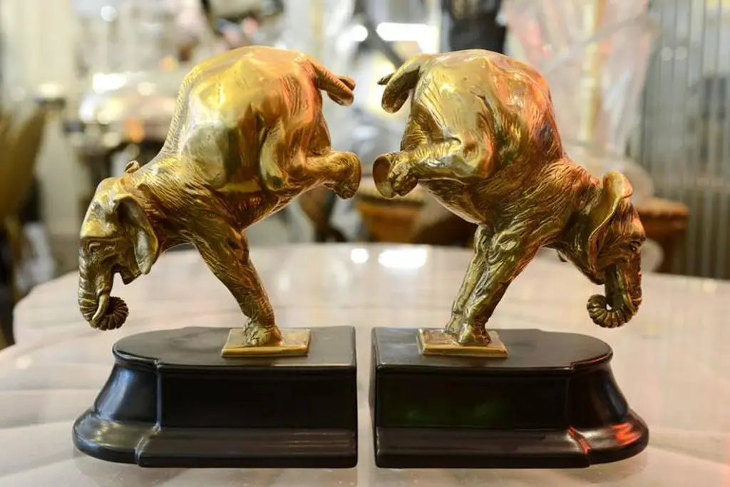 Bookends set of two acrobat elephants inhand-carved solid bronze on black porcelain base.Each piece: L 15.5 x D 10.5 x H 21cm.