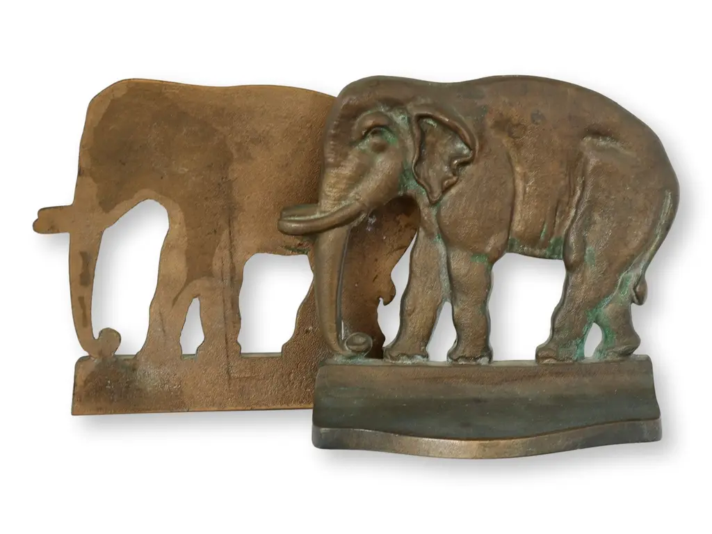 Pair of early- to mid-20th-century bronze bookends depicting facing elephants with gracefully curved trunks. Crafted with fine detail, their textured hides and realistic forms capture the gentle strength of these majestic animals. Verdigris accents in the patina add depth and character. Ideal for animal lovers, safari-themed decor, or collectors of vintage bronze accessories, these sturdy pieces bring both function and artistic charm to a bookshelf or desk.