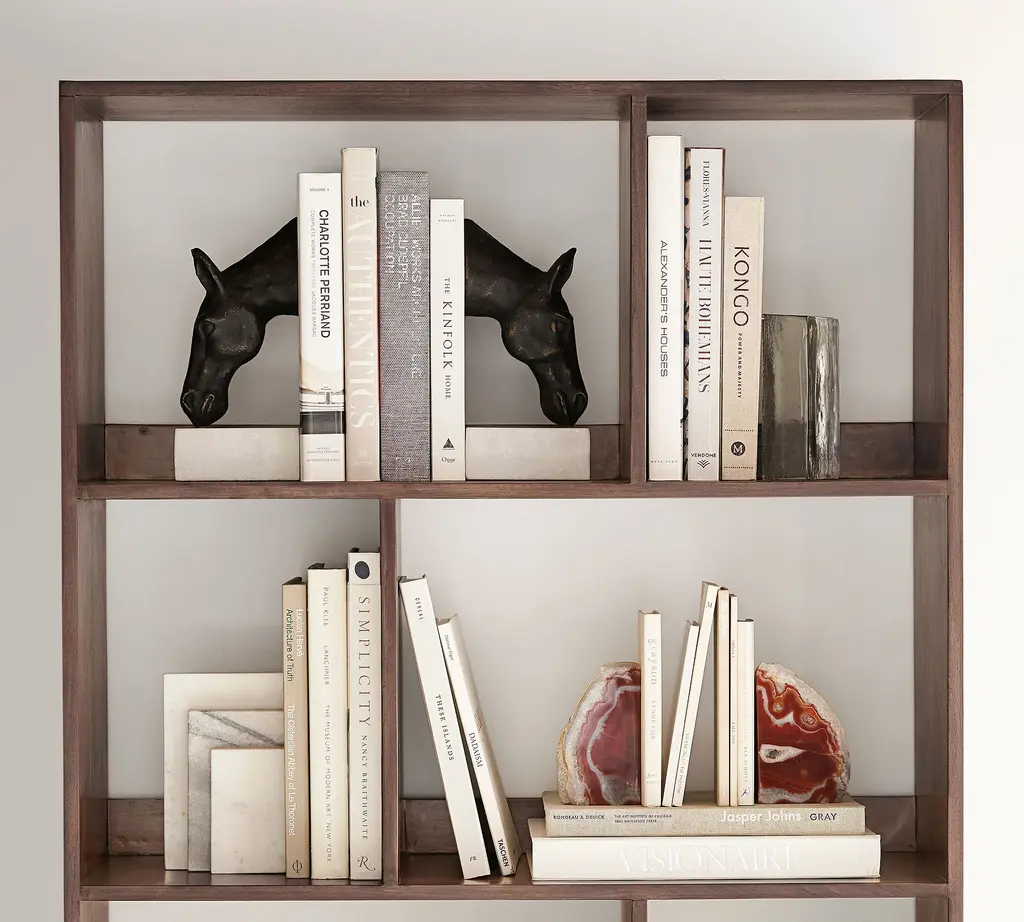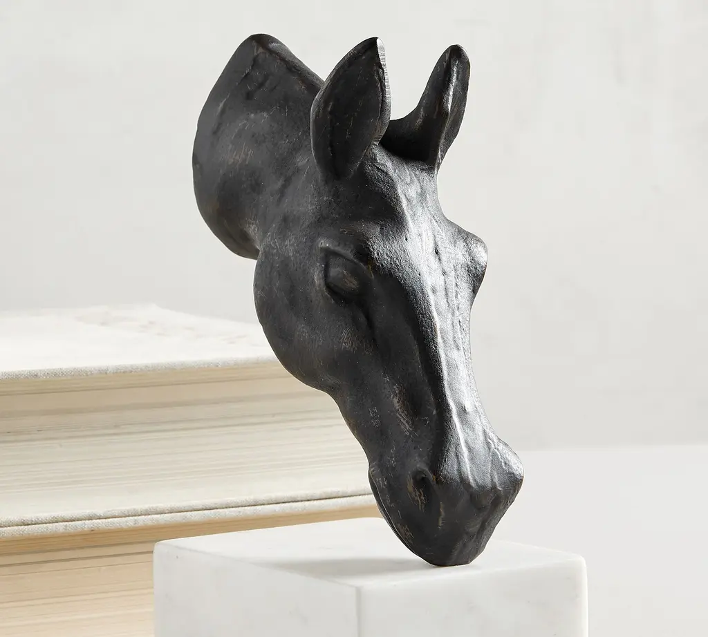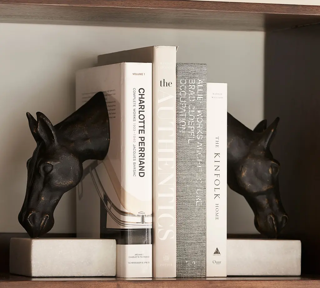 Bring a touch of the English countryside to your reading room with these sculptural horse head bookends, which are cast of bronze and set upon white marble. Decorative and functional, they securely hold favorite tomes while exuding equestrian style.