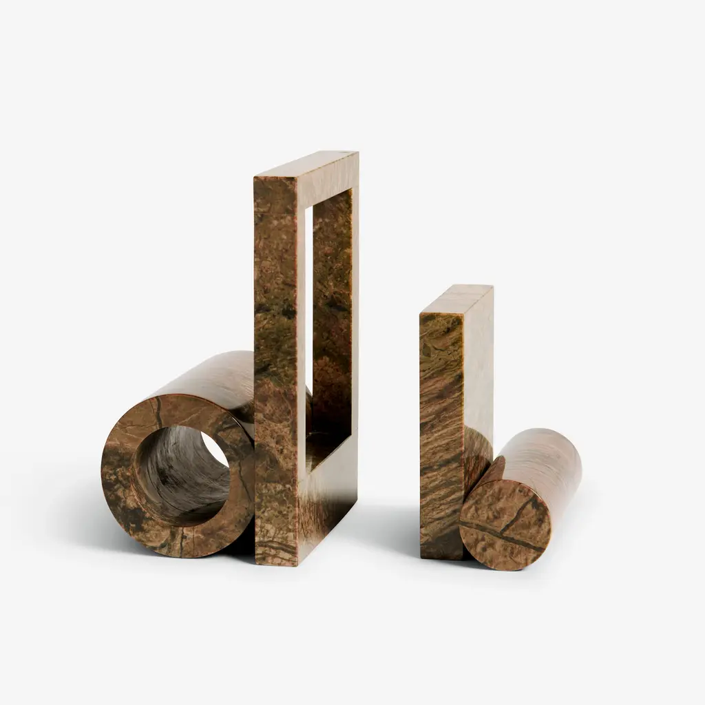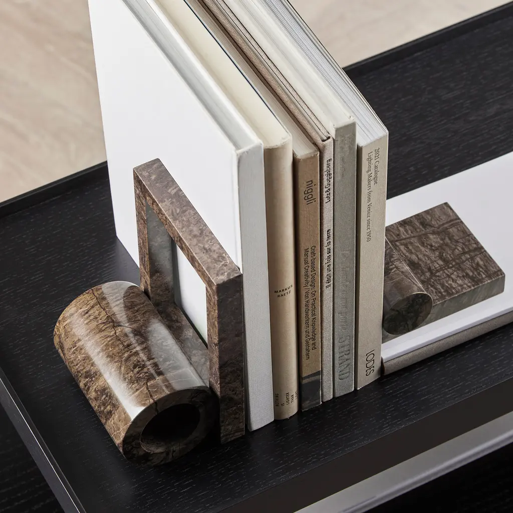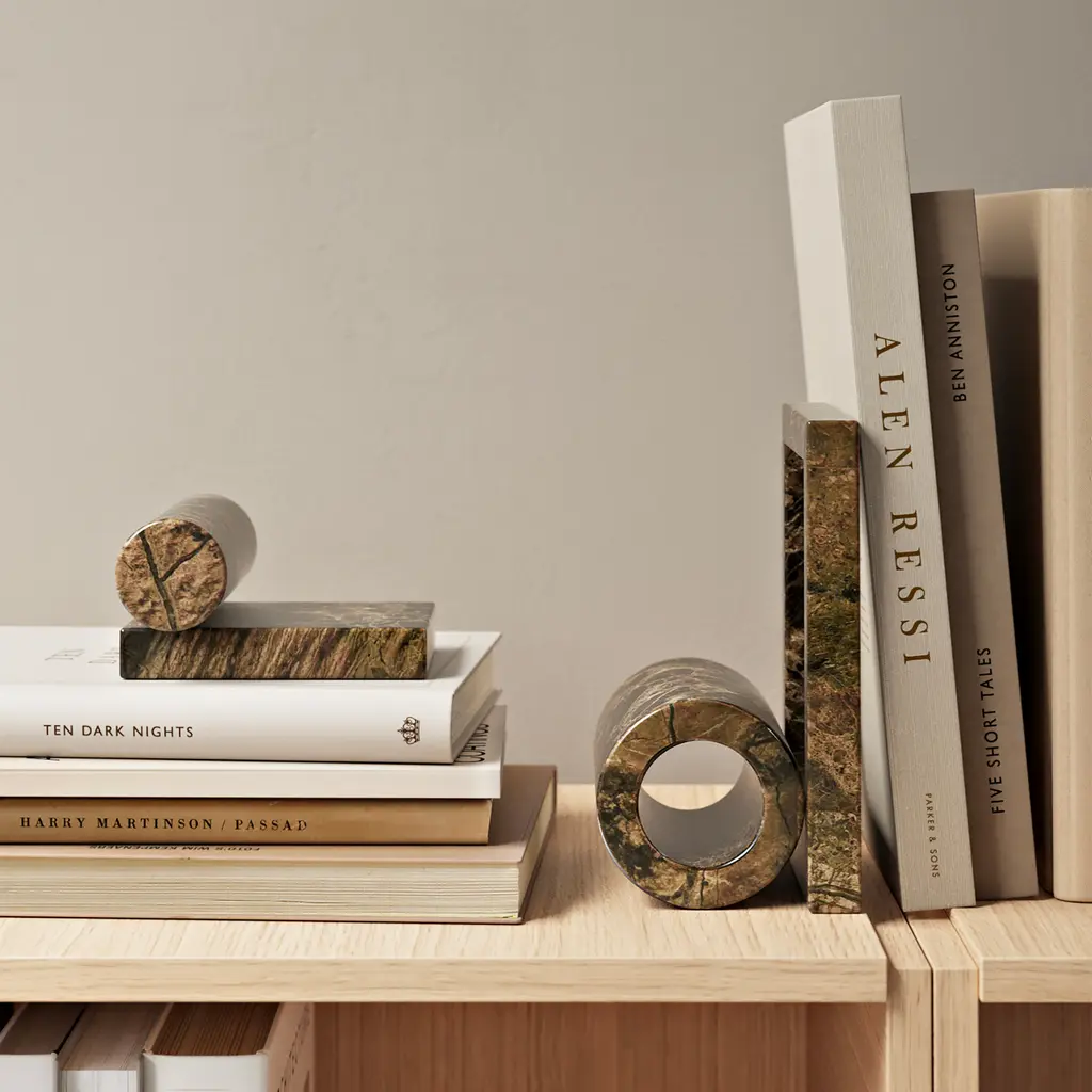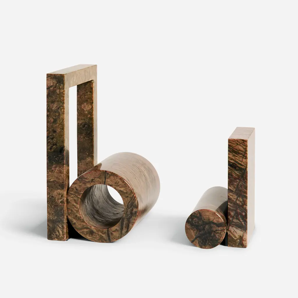 Perfect cylindrical and rectangular forms finished with a polished surface make these marble bookends look like works of art rather than just functional objects. Created by Belgian designer Roel Vandebeek for Danish brand Woud, the Booknd series explores the beauty of minimalist design and of solid marble. This version is crafted from brown marble with pronounced textures and color variations that give a distinctive character to each bookend. Made with clean forms, these stone bookends have slightly different designs; one has solid elements while the other boasts carved-out centers. Additionally, they have different sizes, offering a creative way to support books, keep them organized and ensure they don’t fall flat on a shelf.
