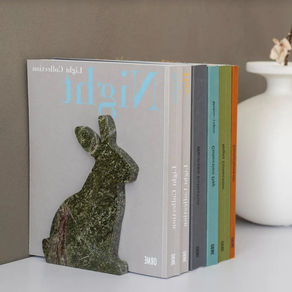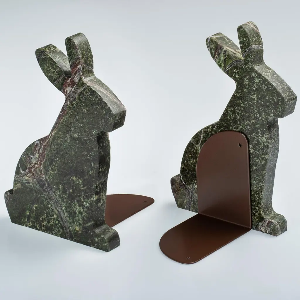"Bunny" bookends in Picasso Green marble with left-hand positioning; an original way to beautify your bookcase. Designed by designer Alessandra Grasso, it allows people to approach their favorite readings with a smile thanks to the tenderness of its shapes. A bookend made of marble with a brushed finish and pole-painted iron, with the graceful shape of a cute rabbit. A perfect gift idea for book and animal lovers.