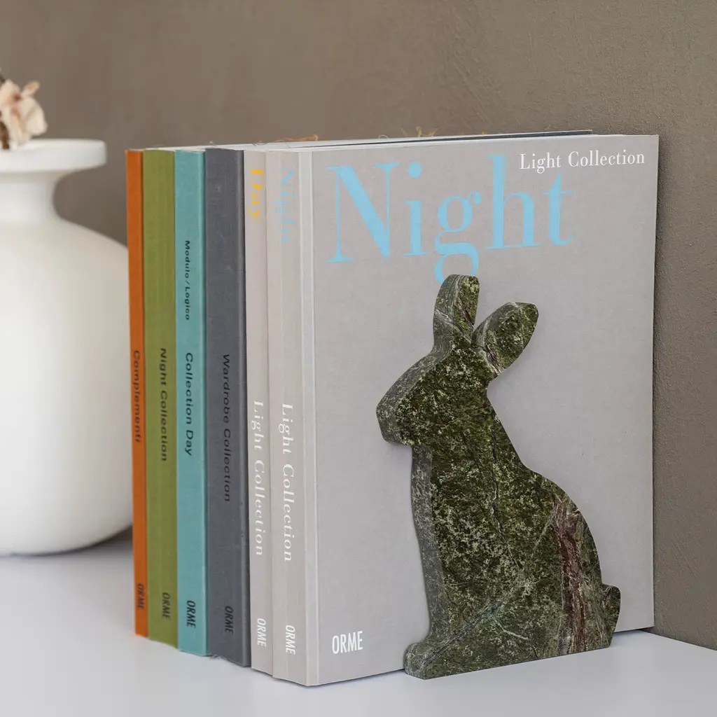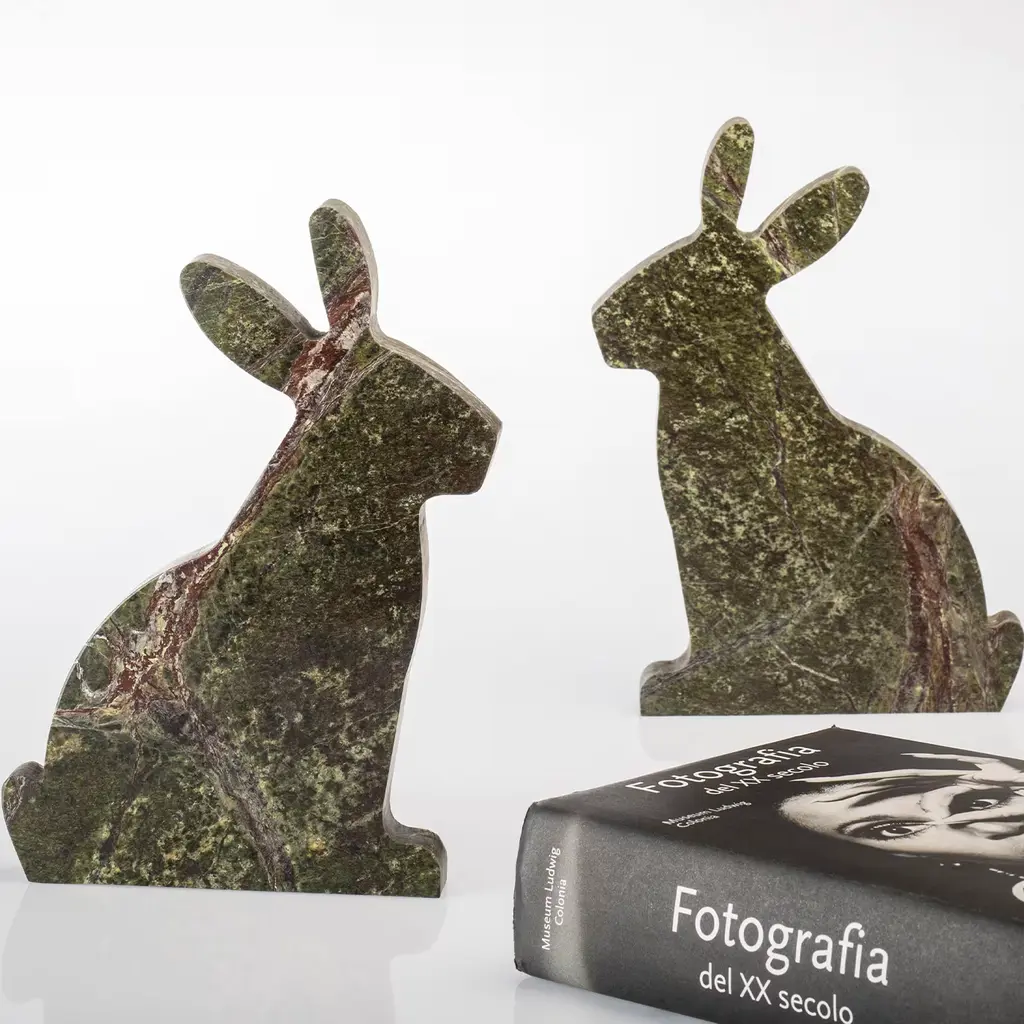 This artful bookend makes for the ideal gift for people with a passion for bunnies and unique interior design pieces. Here offered in its left version, it is fashioned of prized green Picasso marble, carefully hand-shaped to outline the sweet profile of a rabbit that will lend shelves a dash of tenderness. An angular steel plate is fitted to the piece to efficiently play its function. A right-sided version and other color variants are available, please contact the Concierge for details.