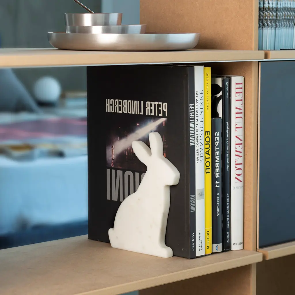 Picking the next book to read in between two bunny-shaped bookends in white Carrara marble will lend a tender tone to exclusive contemporary bookcases. An angular steel plate fitted to the bunny guarantees efficient support, element standing in neat contrast with the luminous aesthetic of the design. Also available in a right-sided version, this bookend also comes in Picasso Green and black-and-gold marble variants, please check the Artemest catalog.