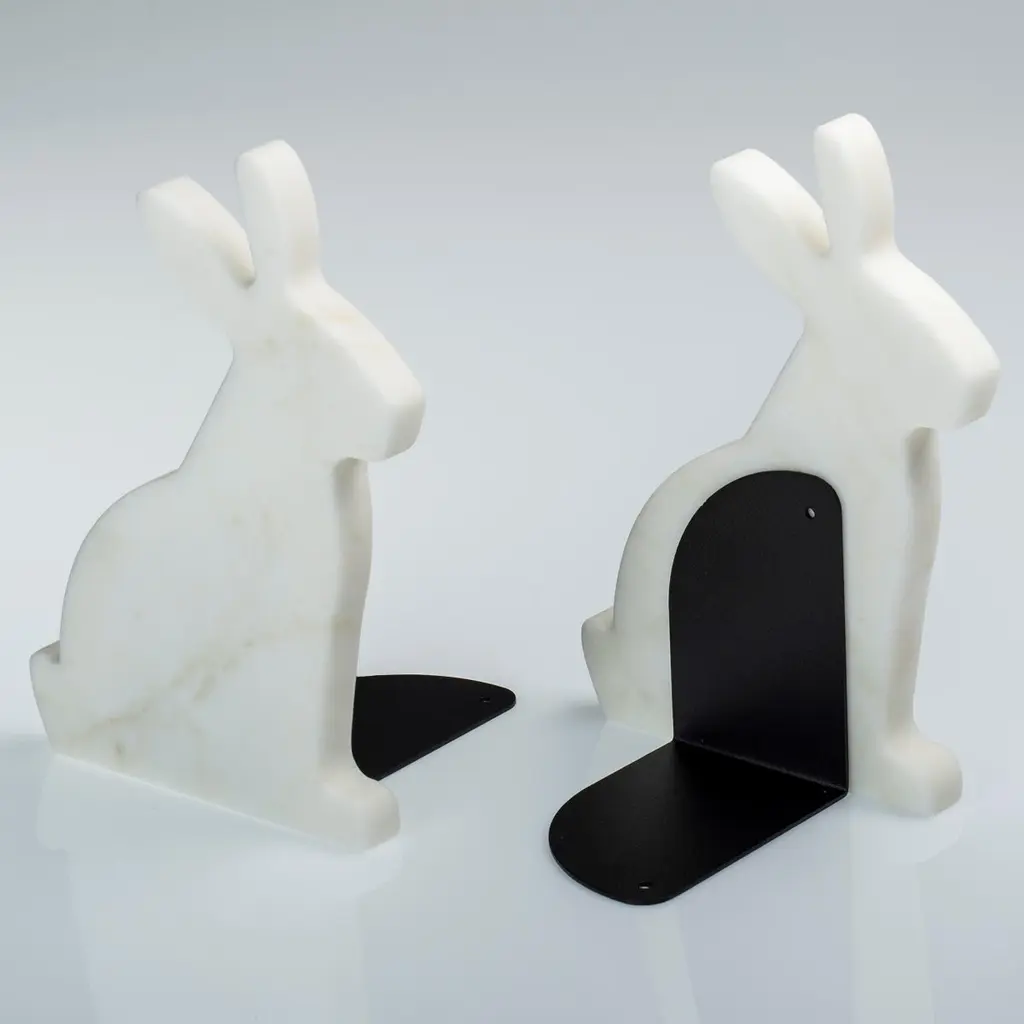 Carrara marble Bainco "Bunny" bookends are a pair of cute little animals with left and right positioning; an original way to beautify your bookshelf. Designed by designer Alessandra Grasso, they allow people to approach their favorite readings with a smile thanks to the tenderness of its shapes. A pair of bookends made of marble with a brushed finish and pole-painted iron, with the graceful shape of a cute rabbit. A perfect gift idea for book and animal lovers.