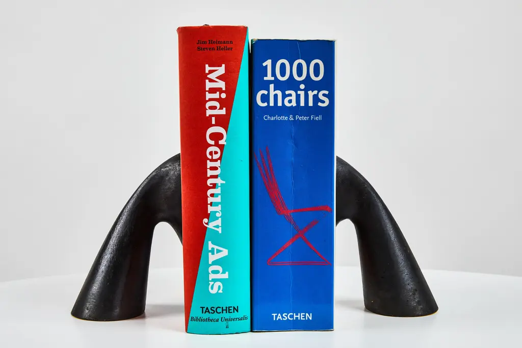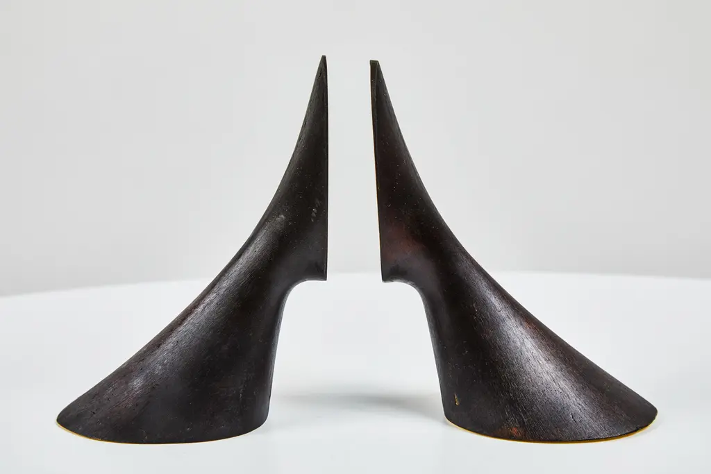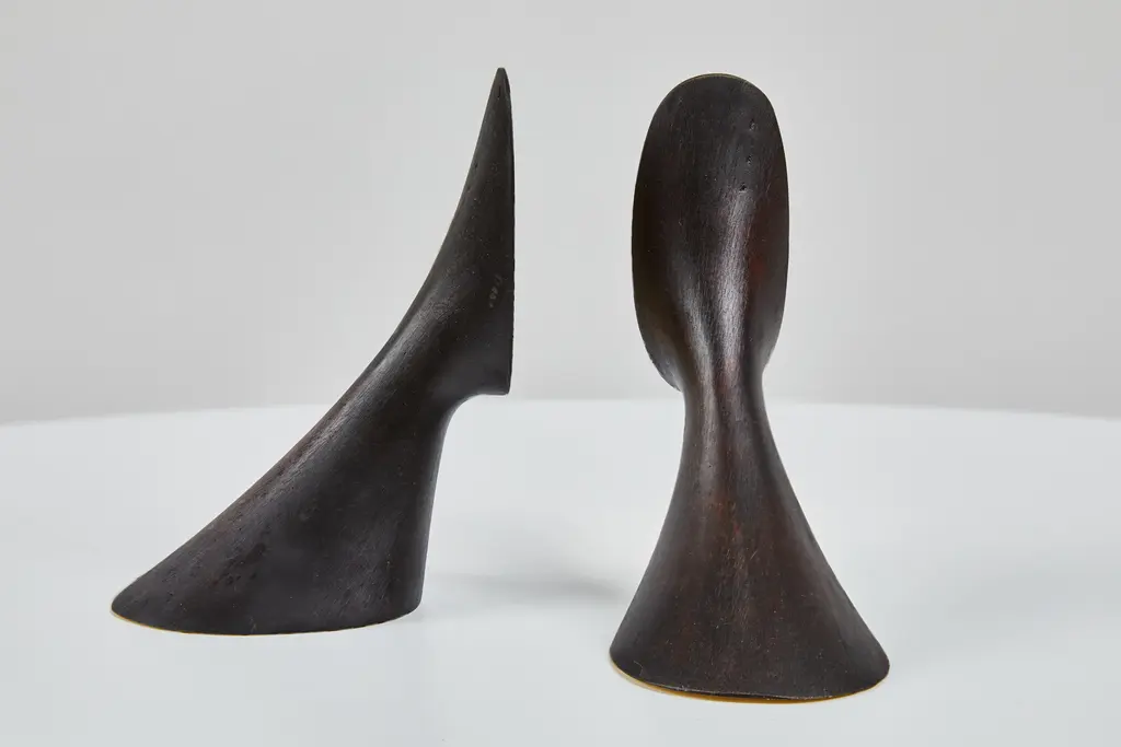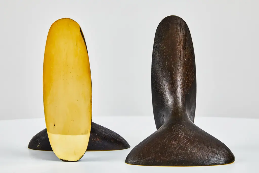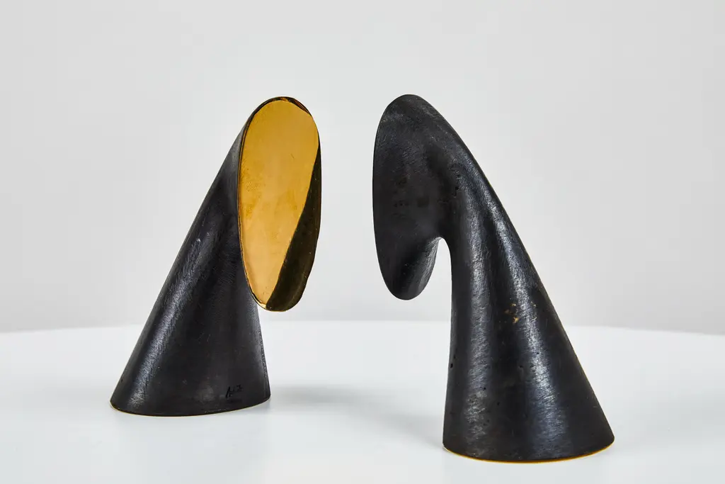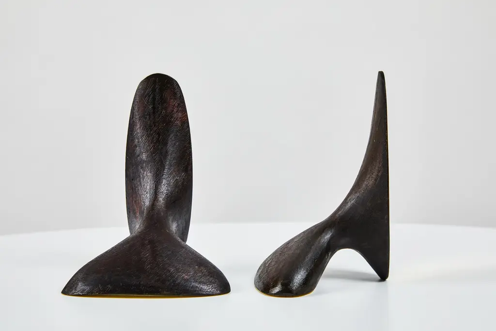 Grouping of eight Carl Auböck brass bookends. Includes one pair each of Models #3651, #3652, #3653 & #3654. Designed in the 1950s, these incredibly refined and sculptural bookends are executed in patinated and polished brass. Price is for the set of 8 bookends. One set in stock and ready to ship. Available in unlimited quantities. Can take up to 8 weeks. Produced by Carl Auböck IV in the original Auböck Werkstätte in the 7th district of Vienna using the same exacting standers, high-quality materials, original molds and techniques of his legendary grandfather. Auböck's design career was long and varied, reaching its pinnacle of prestige at the Triennale di Milano in 1954, where he received four gold medals in recognition of his iconic work. Please note that only one representative example of each item is shown in the images. Finish varies from item to item due to the handmade nature of their fabrication and due to the unique chemical patination process, which is meant to simulate 80-100 years of exposure of brass to sunlight. Made to order.