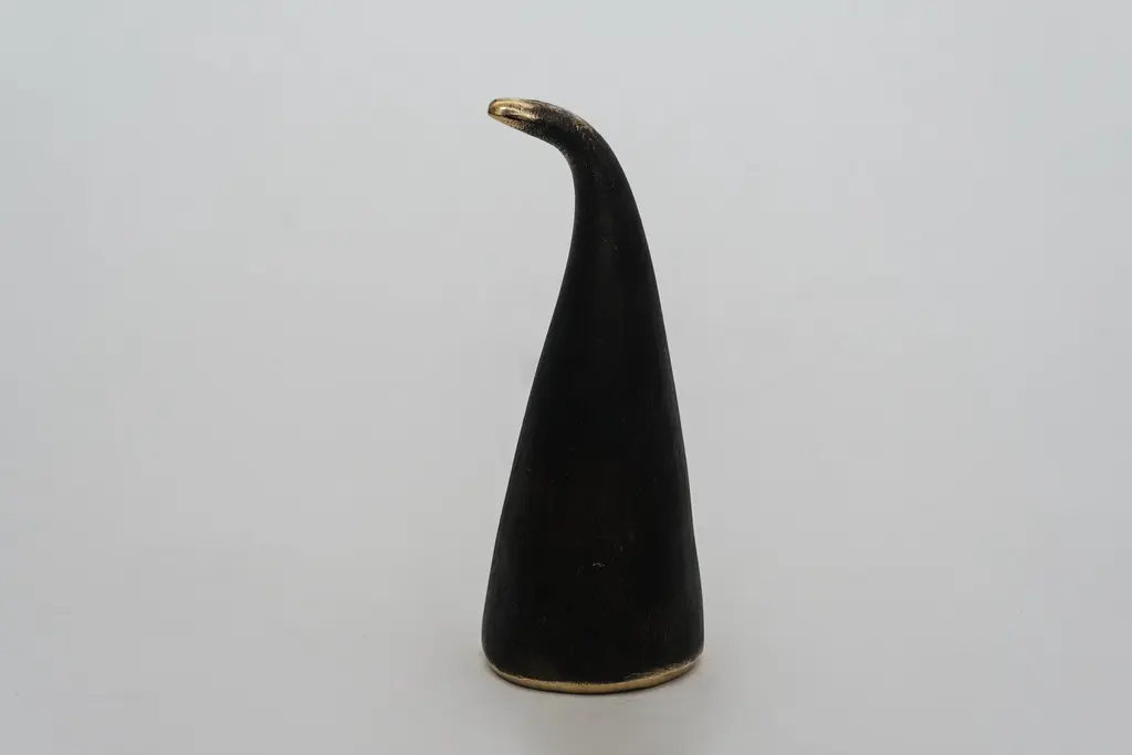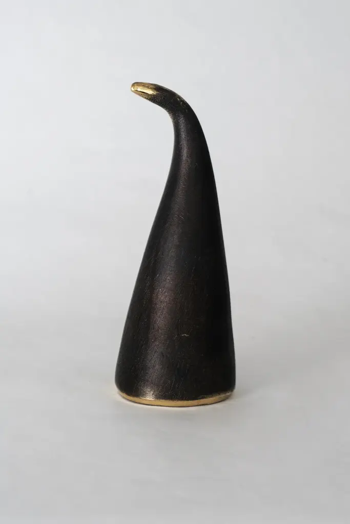 Pair of Carl Auböck model #4102 brass bookends. Designed in the 1950s, this incredibly refined and sculptural pair of bookends are executed in patinated and polished brass. Produced by Carl Auböck IV in the original Auböck Werkstätte in the 7th district of Vienna using the same exacting standers, high-quality materials, original molds and techniques of his legendary grandfather. Auböck's design career was long and varied, reaching its pinnacle of prestige at the Triennale di Milano in 1954, where he received four gold medals in recognition of his iconic work. Price is per pair. Available in unlimited quantities. One pair in stock and ready to ship. Lead time 2-3 weeks or more. Please note that only one representative example of each item is shown in the images. Finish varies from item to item due to the handmade nature of their fabrication and due to the unique chemical patination process, which is meant to simulate 80-100 years of exposure of brass to sunlight. Made to order.
