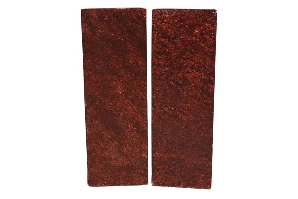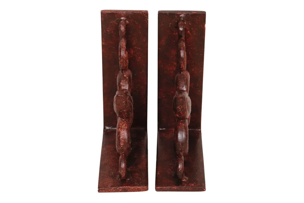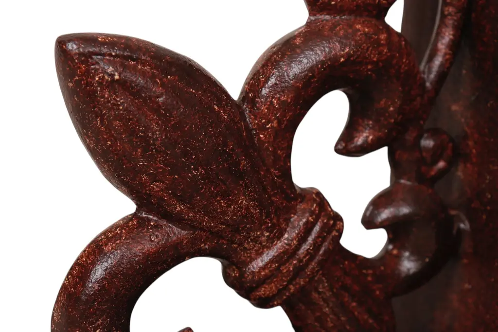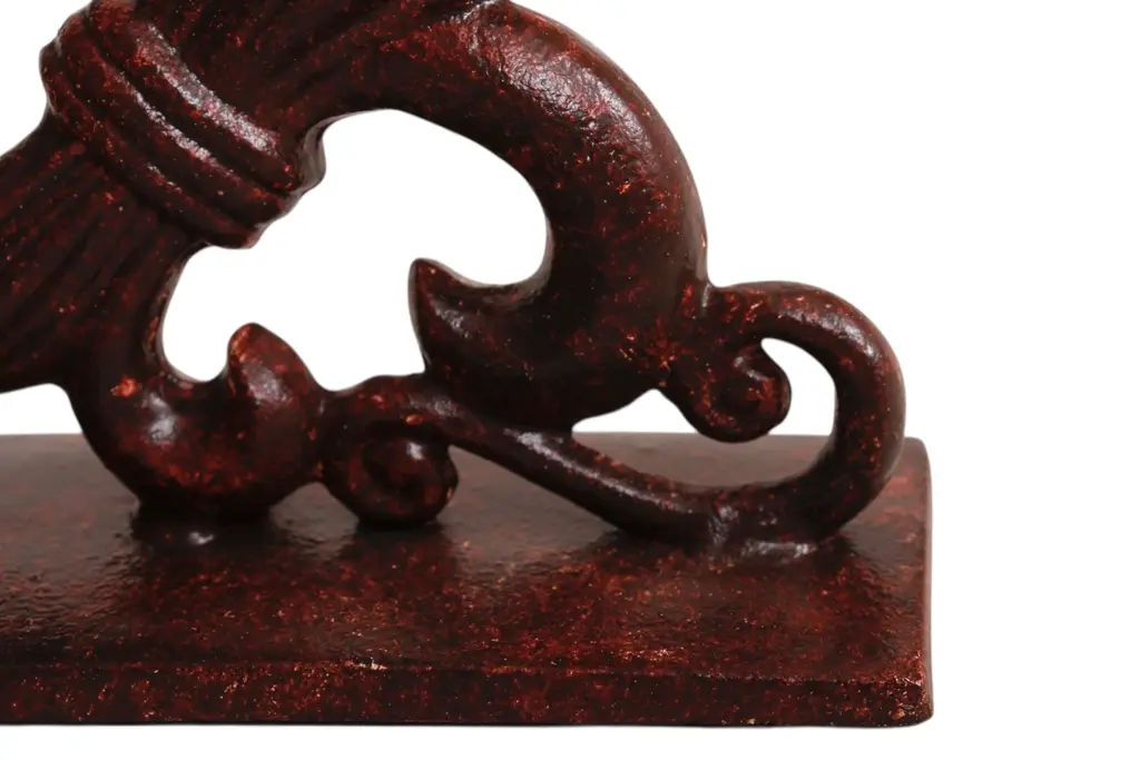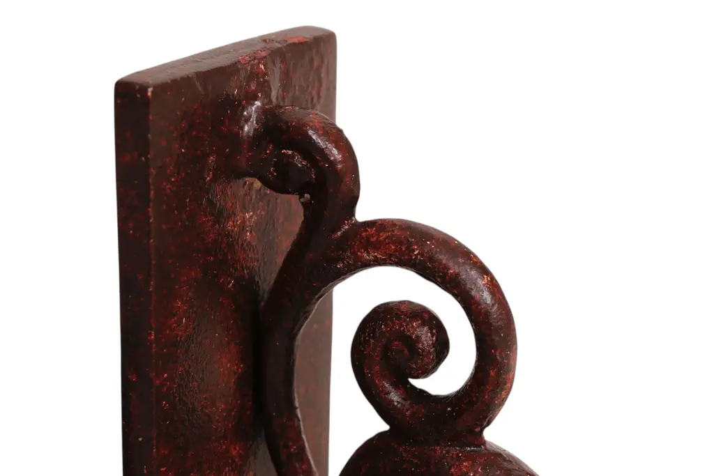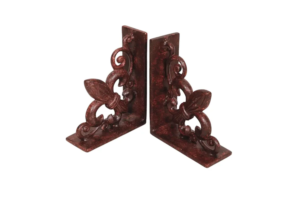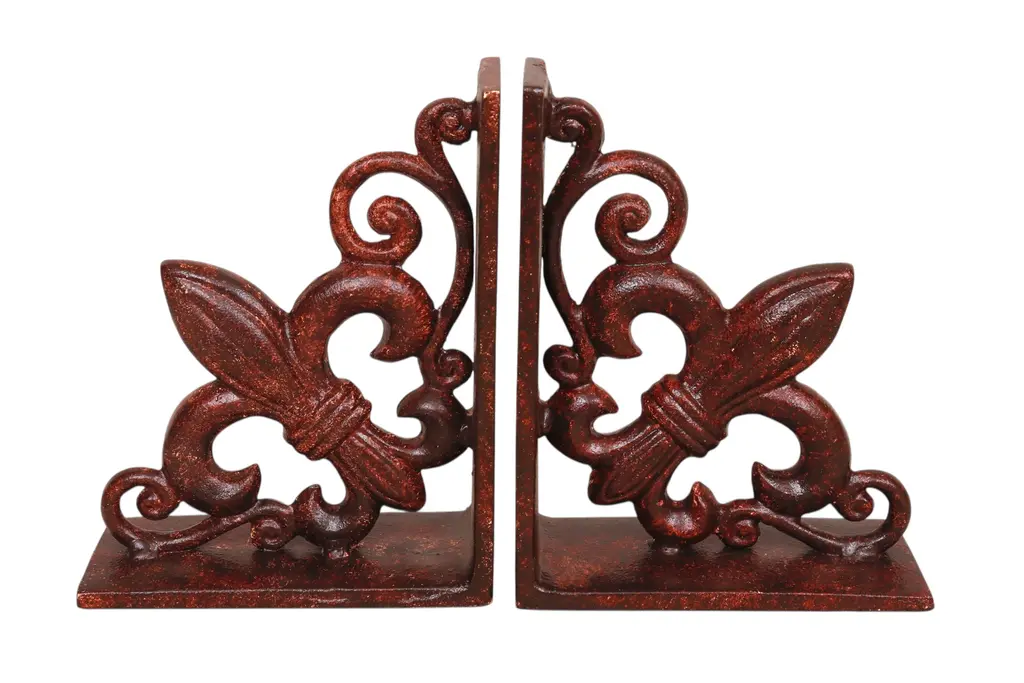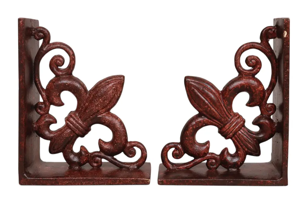 A pair of heavy cast iron bookends. L shapes are decorated with a Fleur De Lis set in scrolls, angled to give the look of French wall brackets. Finished in a mottled maroon color. Dimensions per bookend.