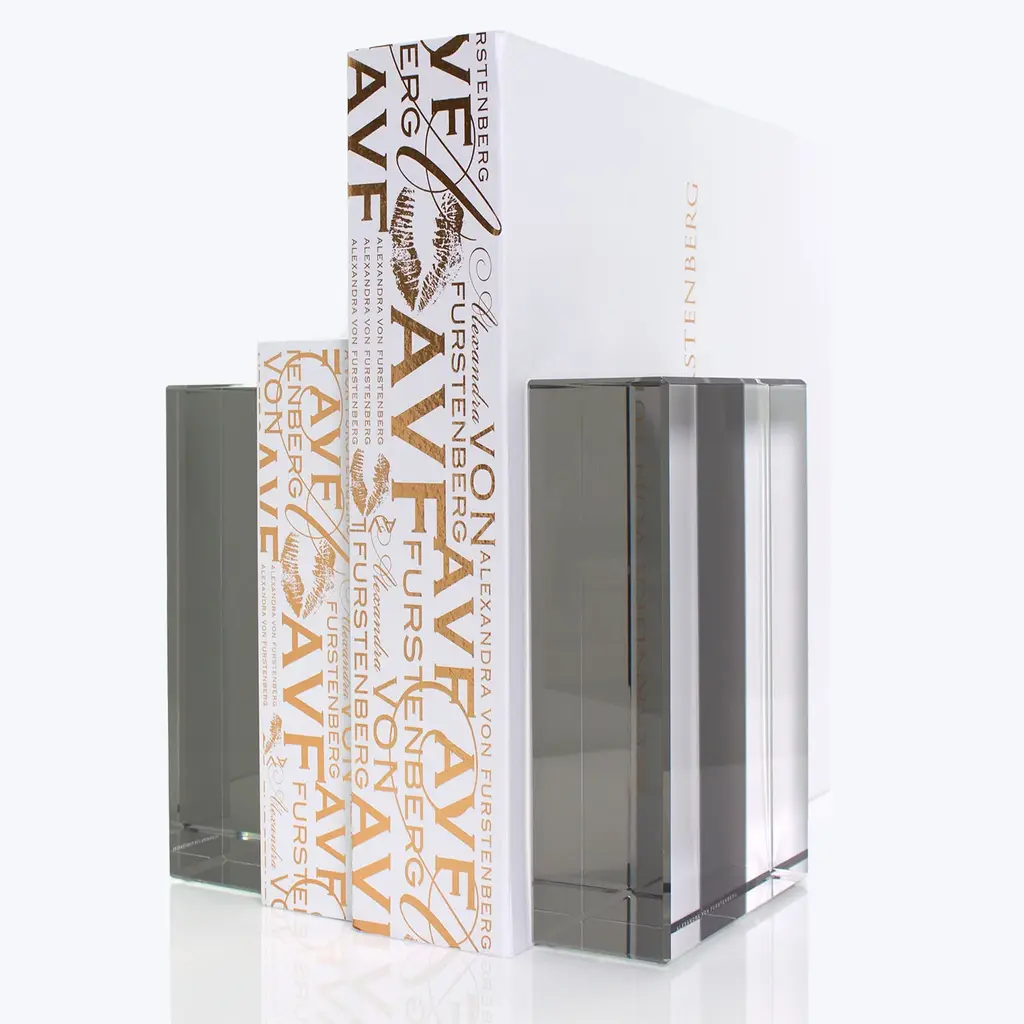 The Chapter Bookends, sold in pairs, are made from solid 2-1/2" thick blocks of acrylic for added stability and weight to make them heavy enough to hold up larger sized books. The simple and elegant design was inspired by a book itself, and the color application floats in the center of the block like the spine of a book. The color reflects throughout the piece and you can turn them different ways for different looks.