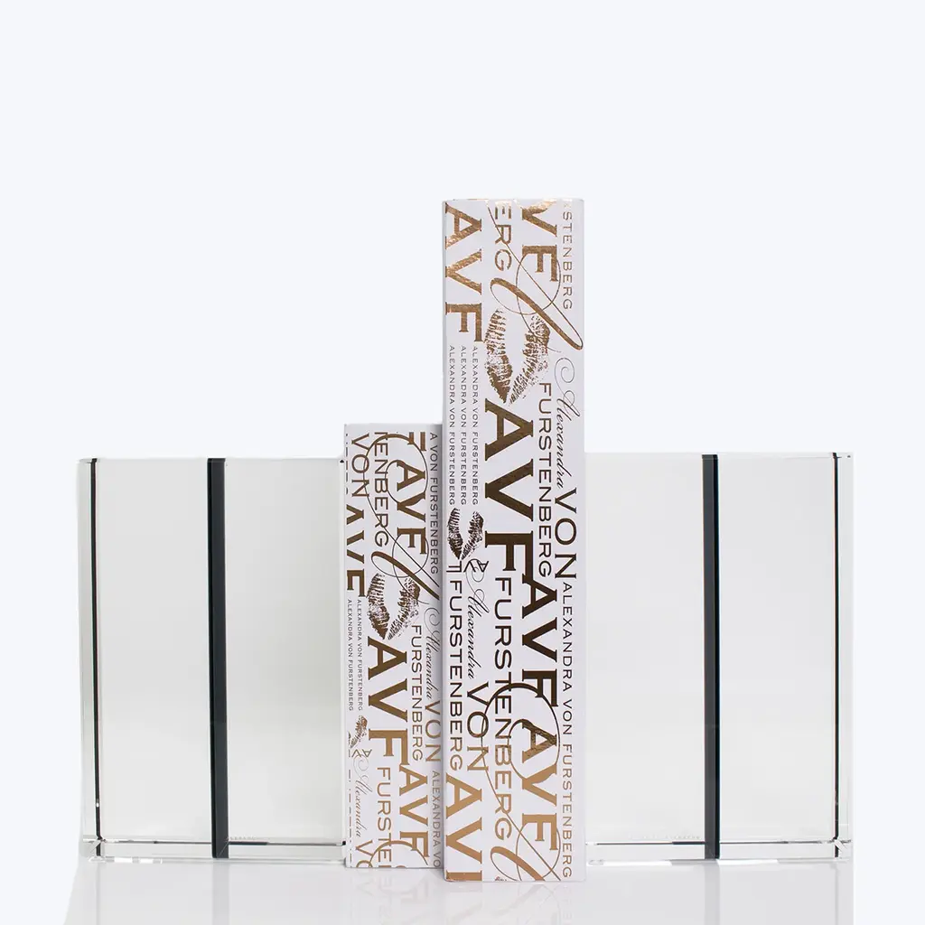 The Chapter Bookends, sold in pairs, are made from solid 2-1/2" thick blocks of acrylic for added stability and weight to make them heavy enough to hold up larger sized books. The simple and elegant design was inspired by a book itself, and the color application floats in the center of the block like the spine of a book. The color reflects throughout the piece and you can turn them different ways for different looks.