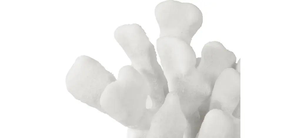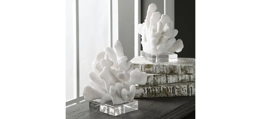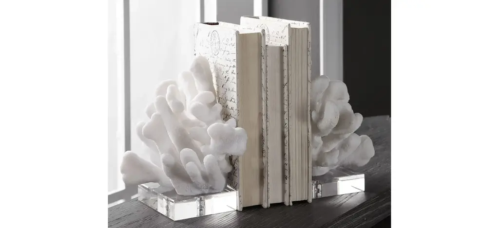 Set of two bookends featuring textured faux white coral on crystal bases. Sizes: Small-5x9x8, Large-6x9x8