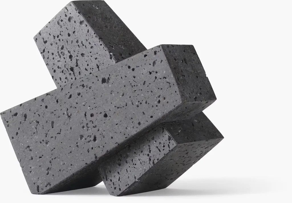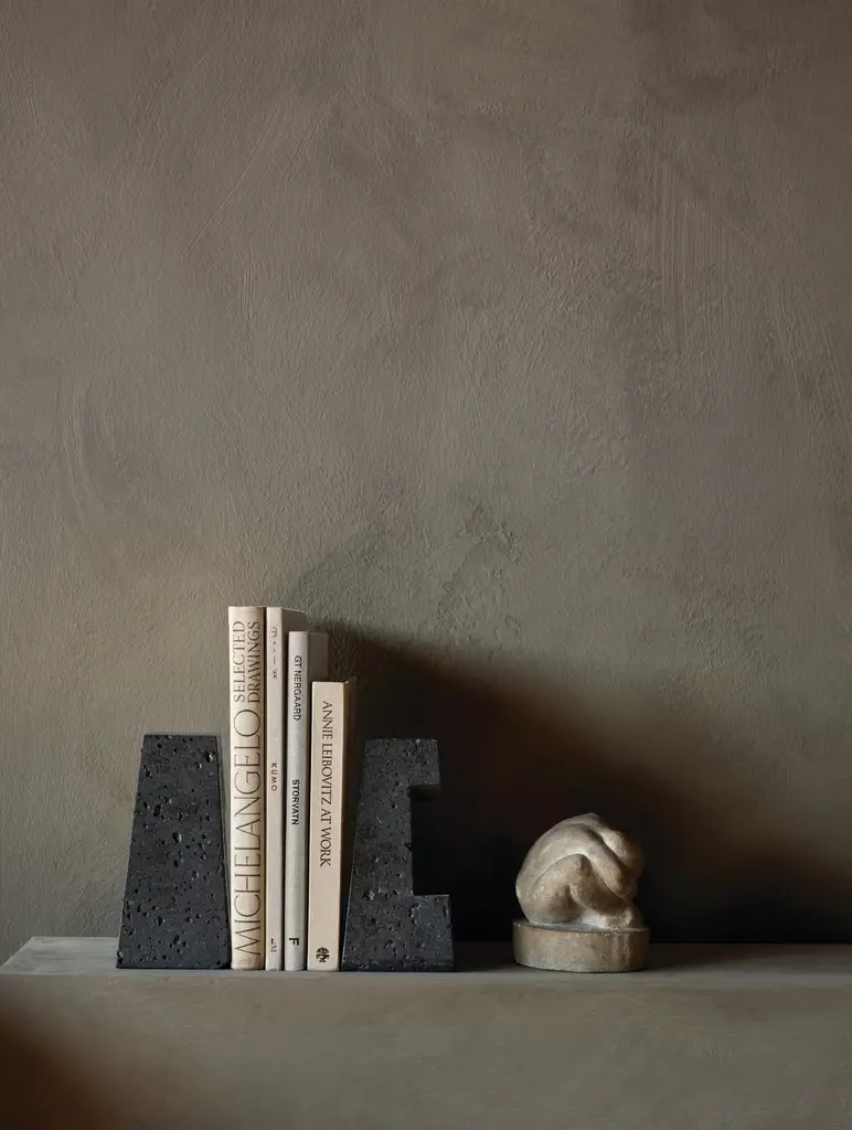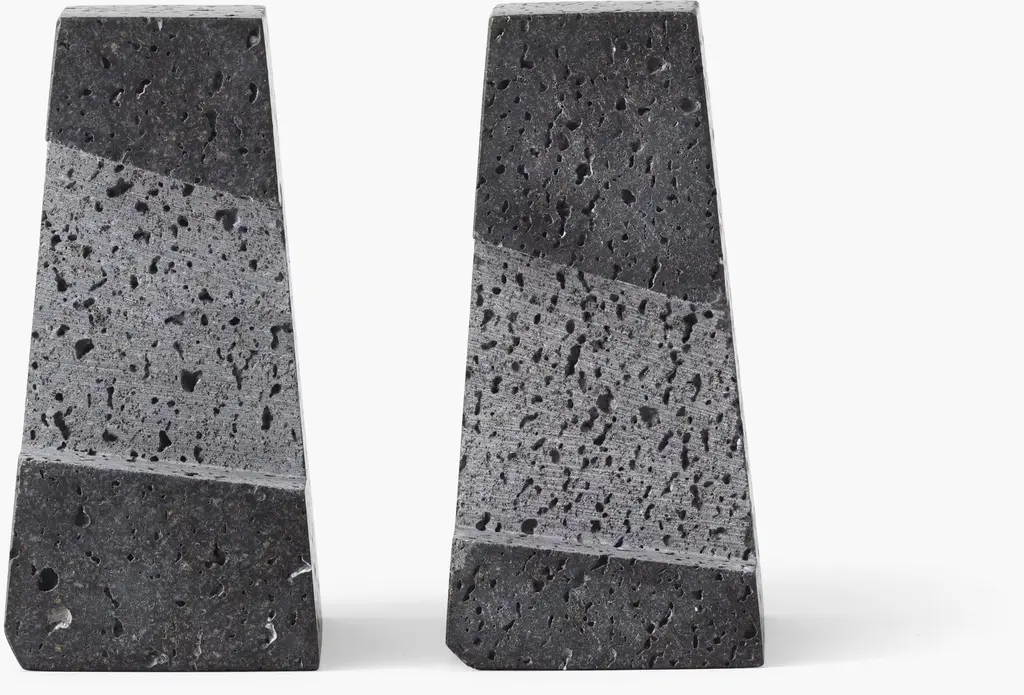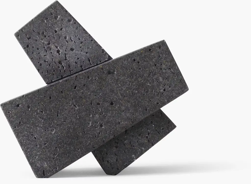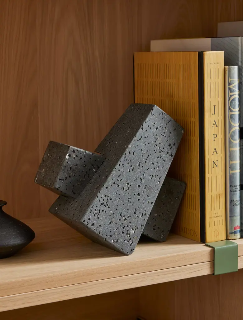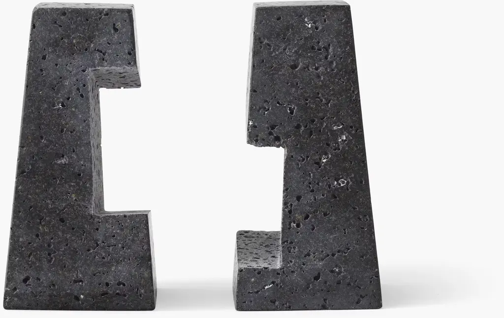 Organize your books with the Converge Bookends (2021), designed by Colin King. Shaped from lava stone - a dark and porous material with a textured surface - these abstract forms are both sculptural and functional. Use one at either end of a row of books, or interlock them to create a sculpture with an intriguing shape and feel. Made in China.