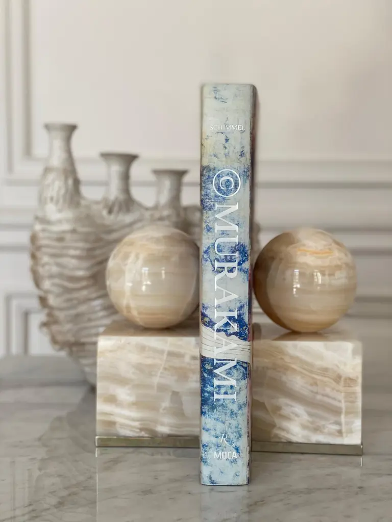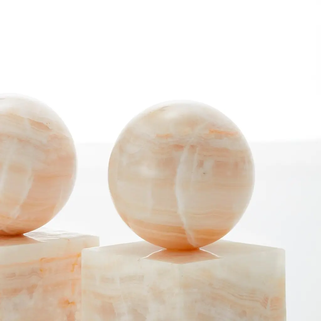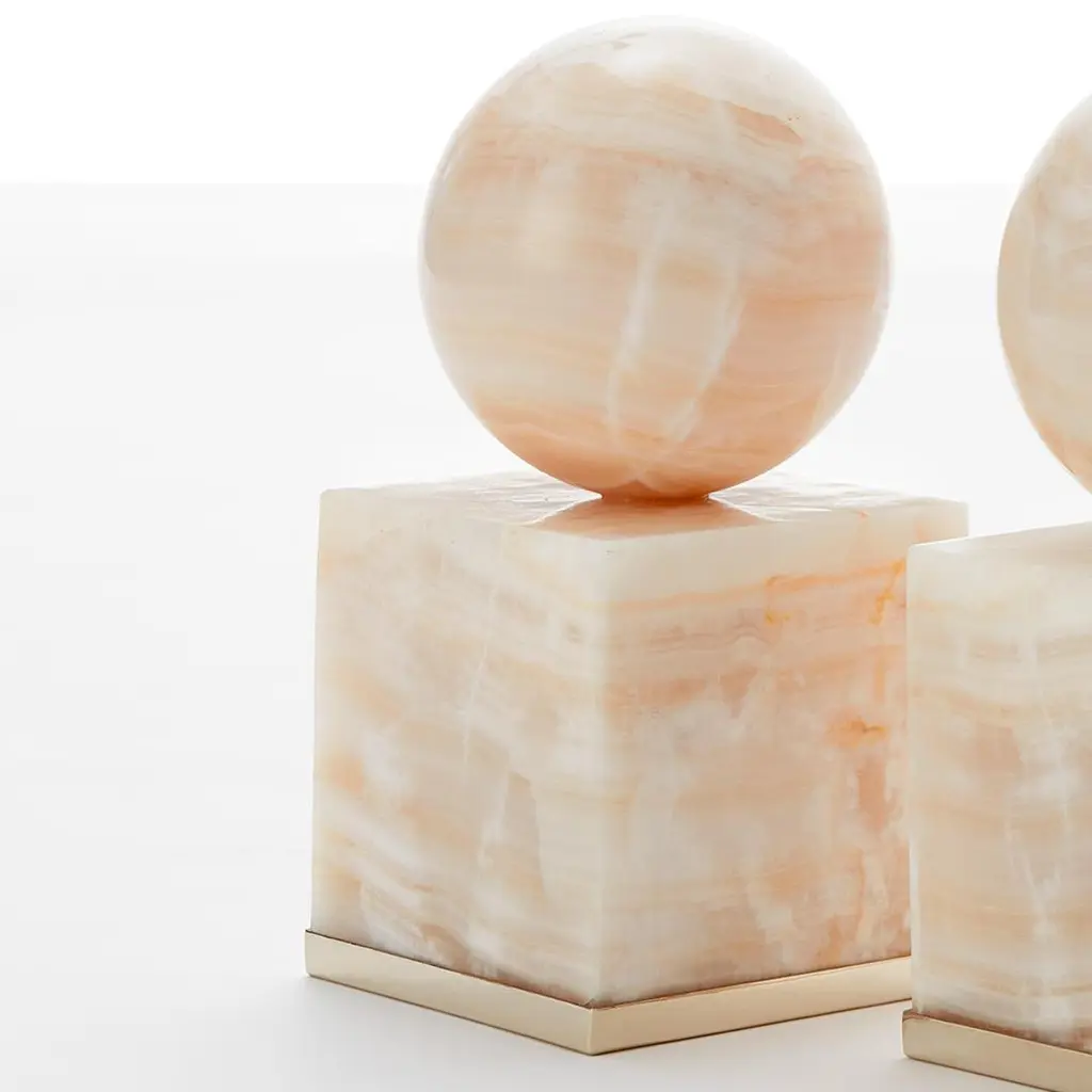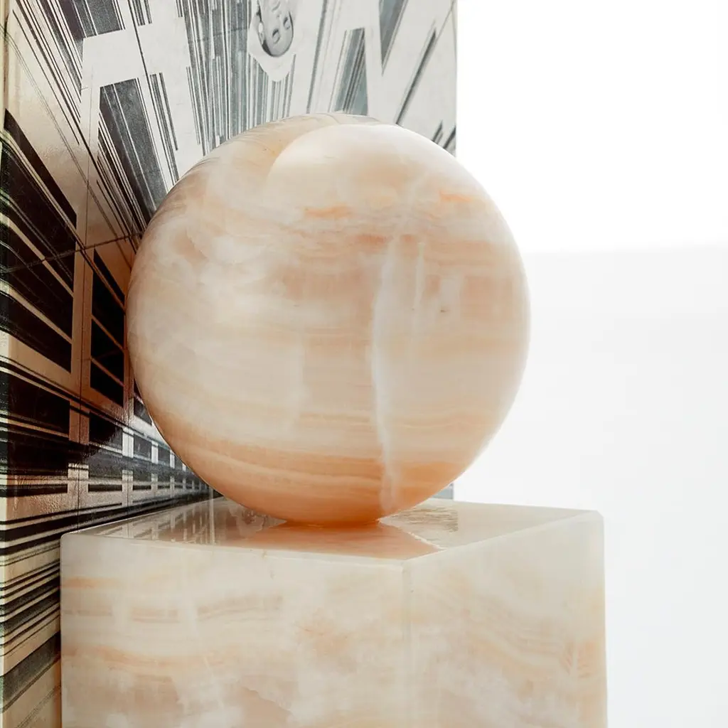 Cuyo bookends are solid heavy beatiful pieces of geometrical onyx stone, moustly in square base and round top. Very sharm for a personal library.Our pieces are made by hand. One of a kind.All natural stones may vary in color.