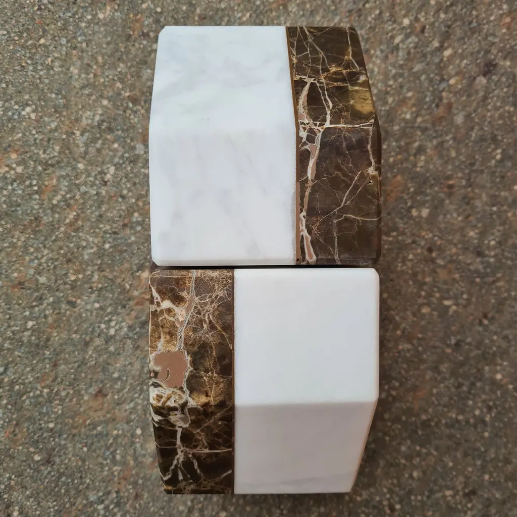 Breaking away from conventional design, these D-ENDS bookends from the Matched collection highlight a sustainable approach to luxury. Made from reclaimed dark Emperador and white Carrara marble, their geometric form is both striking and adaptable. Used as bookends or decorative accents, they embody modern elegance and thoughtful craftsmanship, reflecting the art of repurposing fine materials.