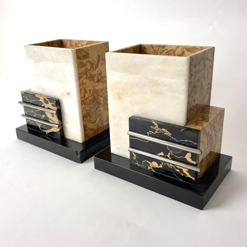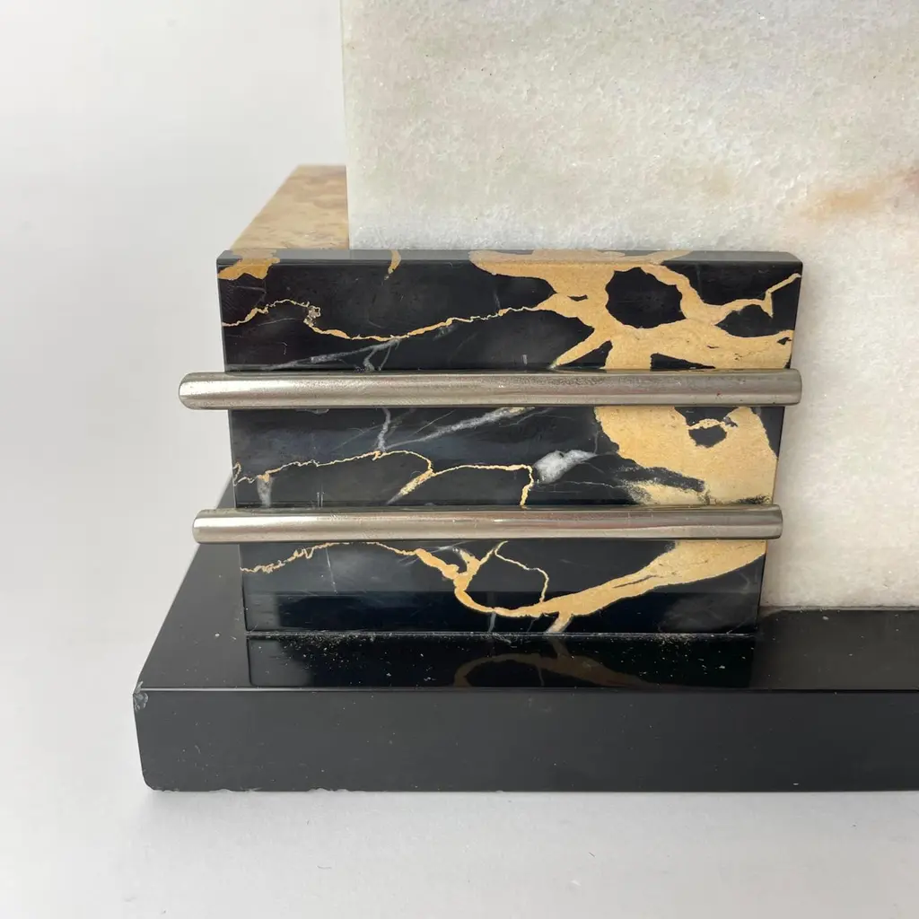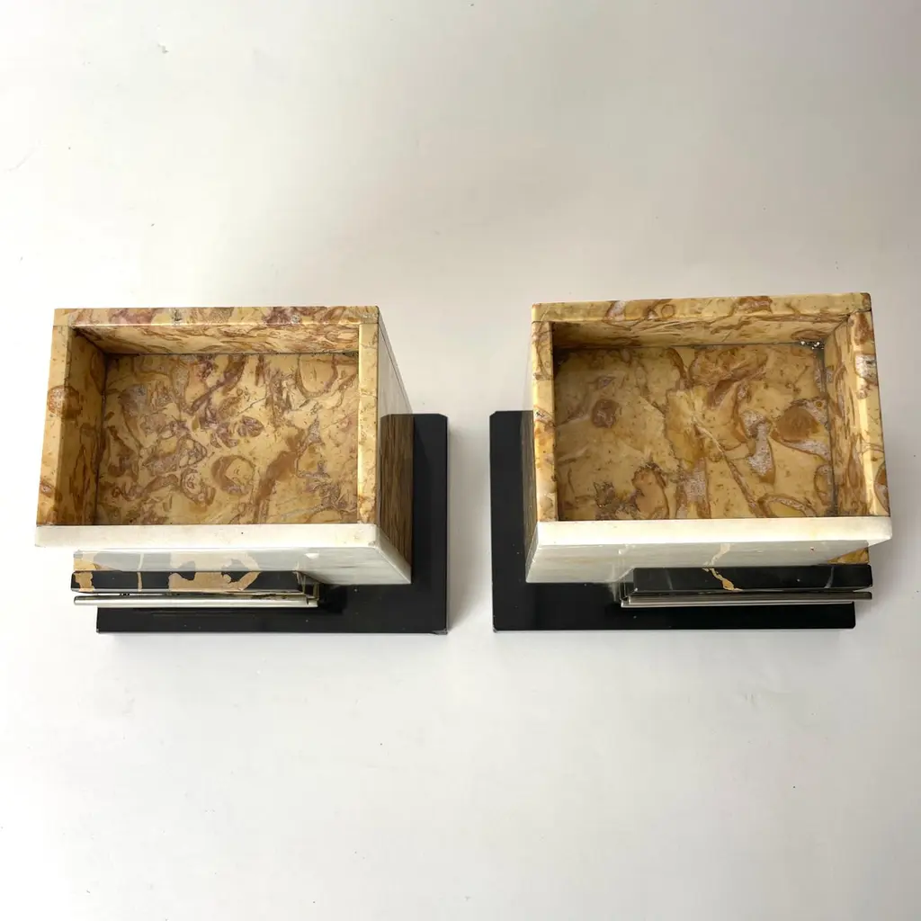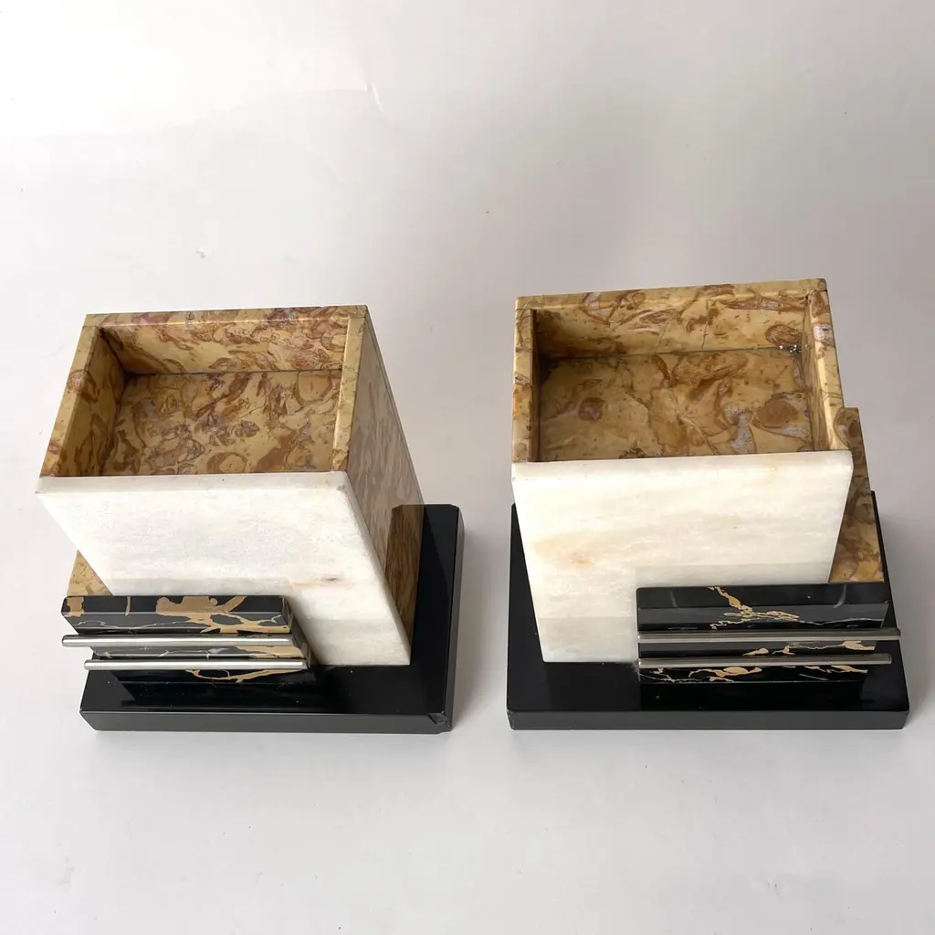 Elegant Decorative Sculptural Pieces usable for storage of e.g. cufflinks or as bookends. 1920s Art Deco, made of Marble and Chrome.These highly decorative and elegant pieces, in total consisting of four different kinds of exclusive marble, are emblematic of Art Deco form based design, reflecting a fascination for the pure volume and authenticity of materials. Atop a base of solid black marble stands the main marble volume, which has yet another volume slightly protruded from the main volume, this one in a black marble with yellowish streaks along with horizontal chrome elements. The front of the main volume is made of a white and clear marble, while the remaining three sides are made of marble of a more marbled quality. Highly decorative and usable as solely decorative pieces, they can serve a multitude of purposes, including exclusive storage for cufflinks and the like, or as bookends. Wear consistent with age and use. Slight losses in the marble base, however these losses do not retract from the overall impression of the pieces.