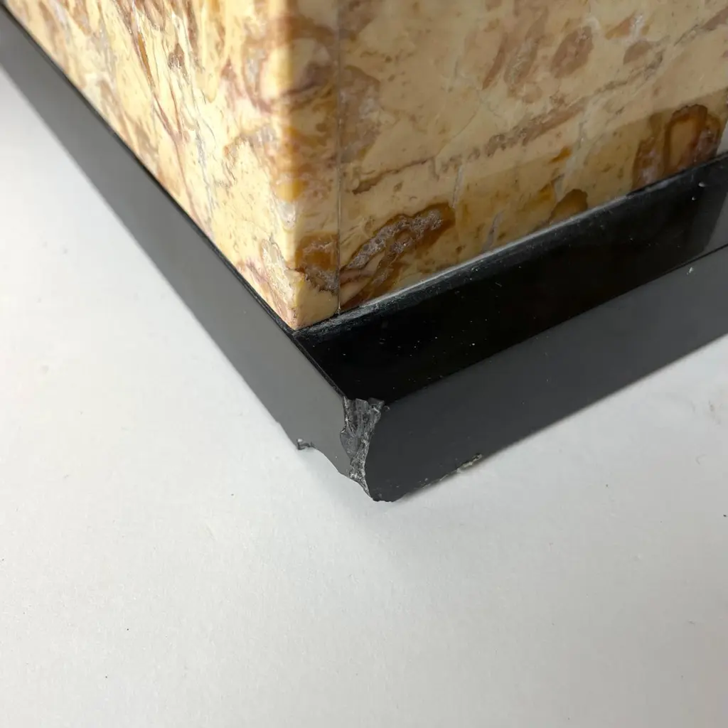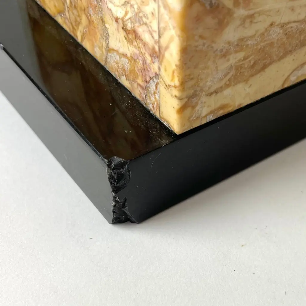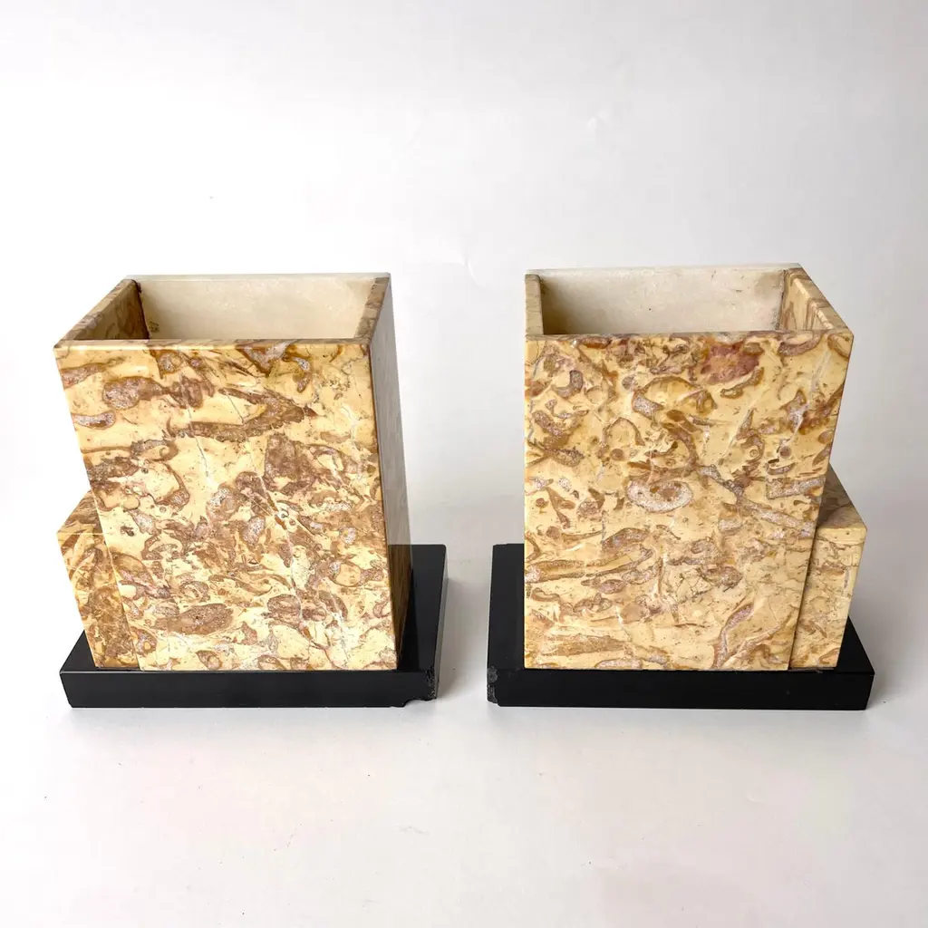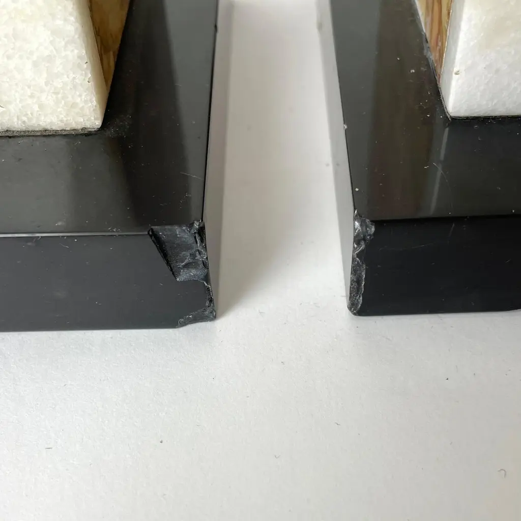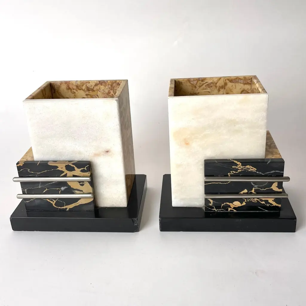 Elegant Decorative Sculptural Pieces usable for storage of e.g. cufflinks or as bookends. 1920s Art Deco, made of Marble and Chrome.These highly decorative and elegant pieces, in total consisting of four different kinds of exclusive marble, are emblematic of Art Deco form based design, reflecting a fascination for the pure volume and authenticity of materials. Atop a base of solid black marble stands the main marble volume, which has yet another volume slightly protruded from the main volume, this one in a black marble with yellowish streaks along with horizontal chrome elements. The front of the main volume is made of a white and clear marble, while the remaining three sides are made of marble of a more marbled quality. Highly decorative and usable as solely decorative pieces, they can serve a multitude of purposes, including exclusive storage for cufflinks and the like, or as bookends. Wear consistent with age and use. Slight losses in the marble base, however these losses do not retract from the overall impression of the pieces.