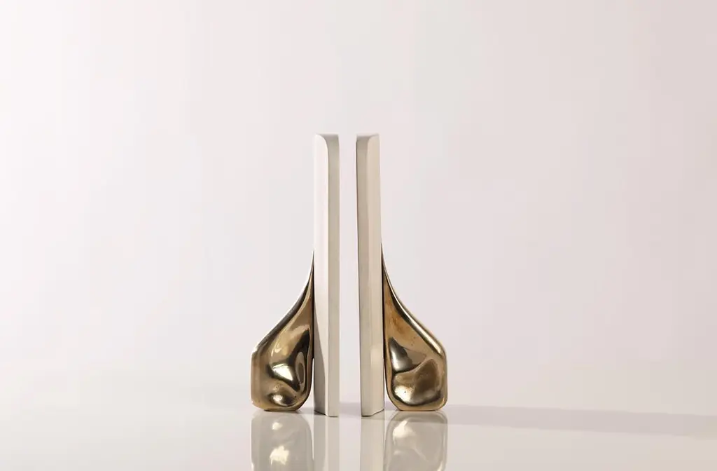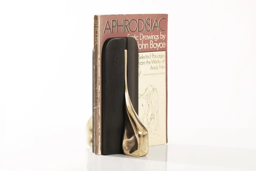 Carved wood and cast bronze bookend. Available in:Ebonized Walnut Bleached Maple Natural Walnut