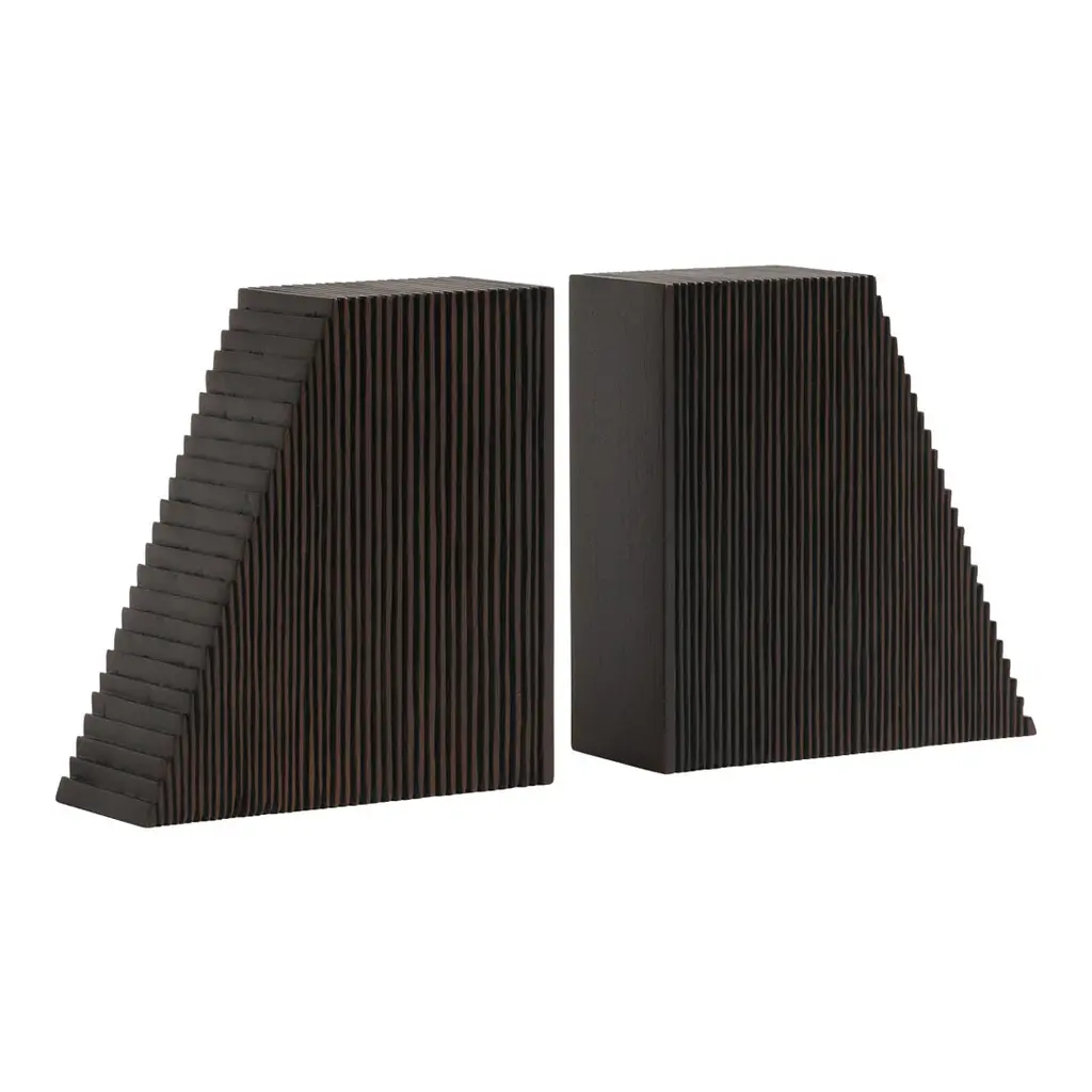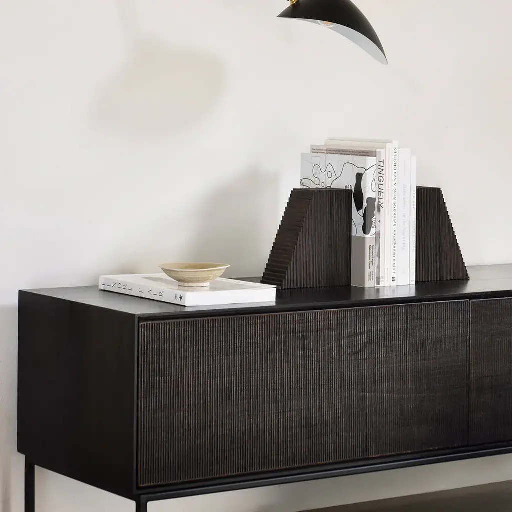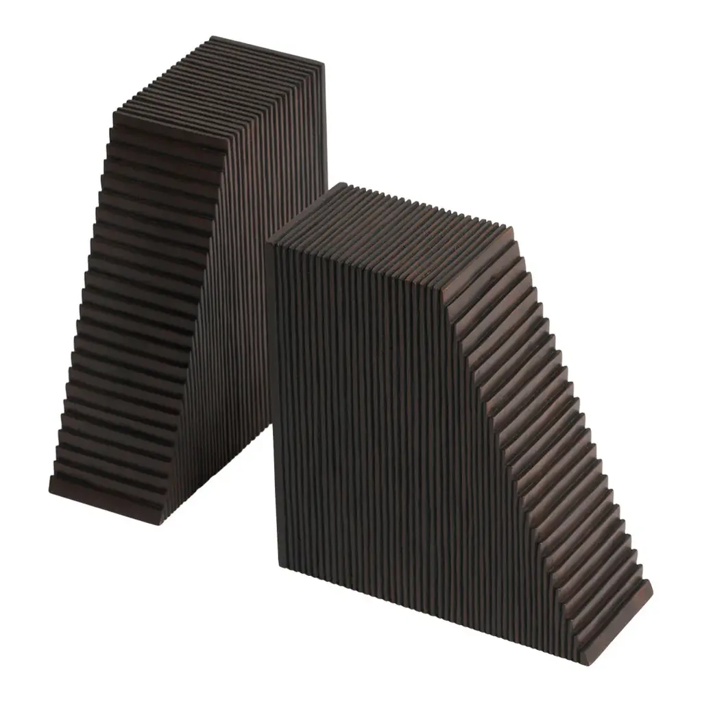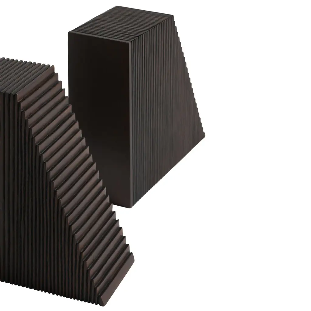 The Grooves book ends are soulful to say the least. Every single line you see is hand carved, making each piece truly unique. Small imperfections are part of the story, even more so: they enhance Grooves' character. The result is a slightly different surface every time, each with its own rhythm and dynamics. Made from solid mahogany finished with a dark brown varnish, these book ends complement the wider Grooves collection.Made from dark brown tainted mahogany with a varnish finish.