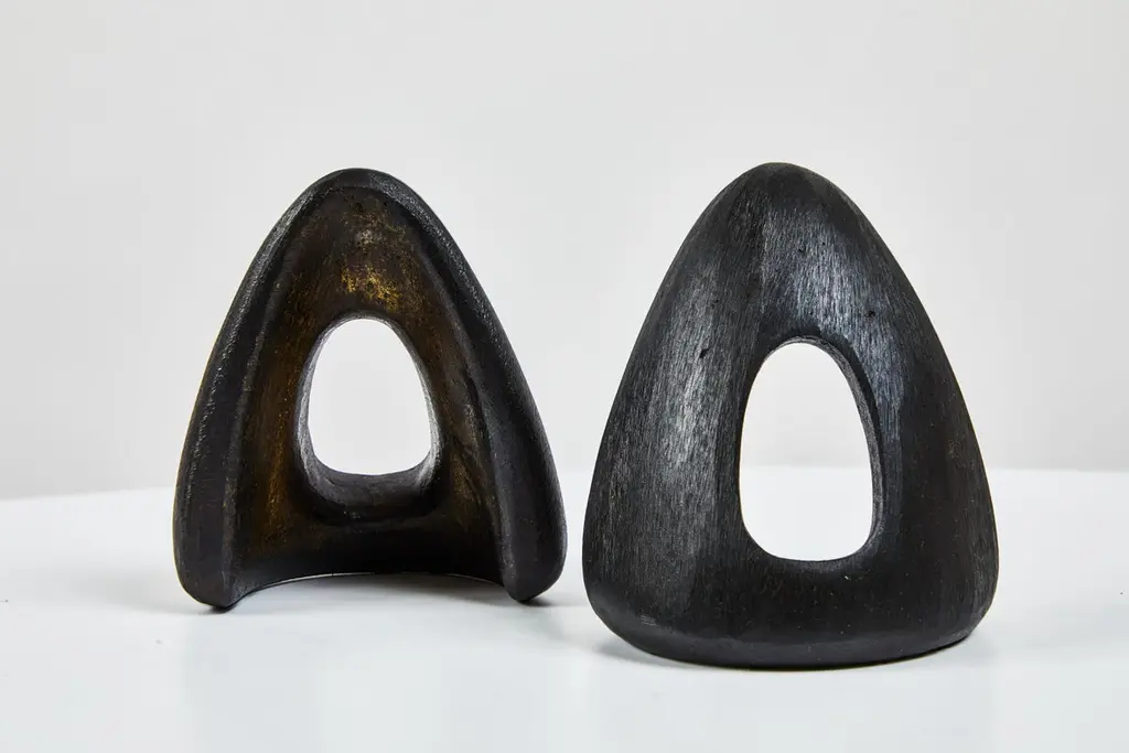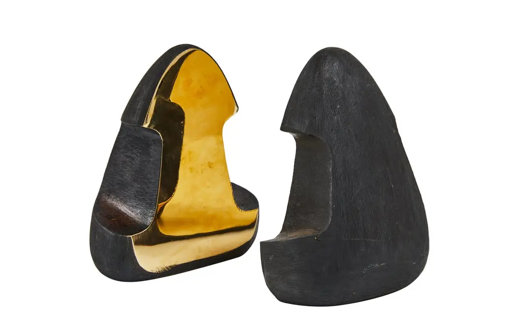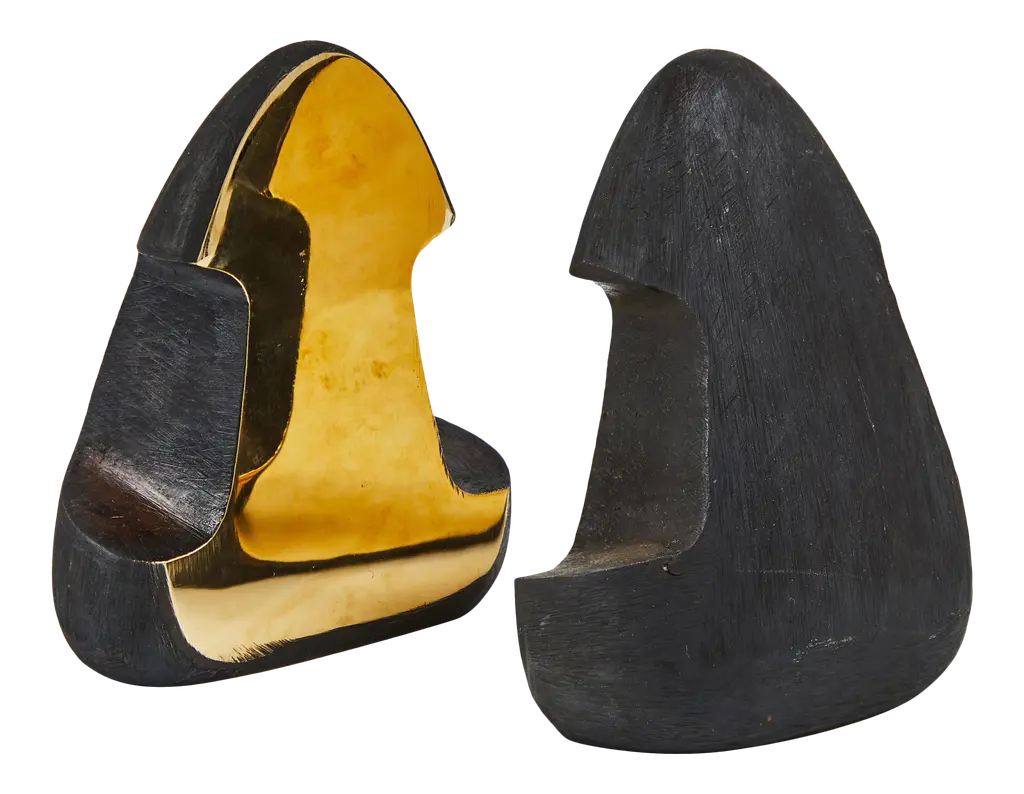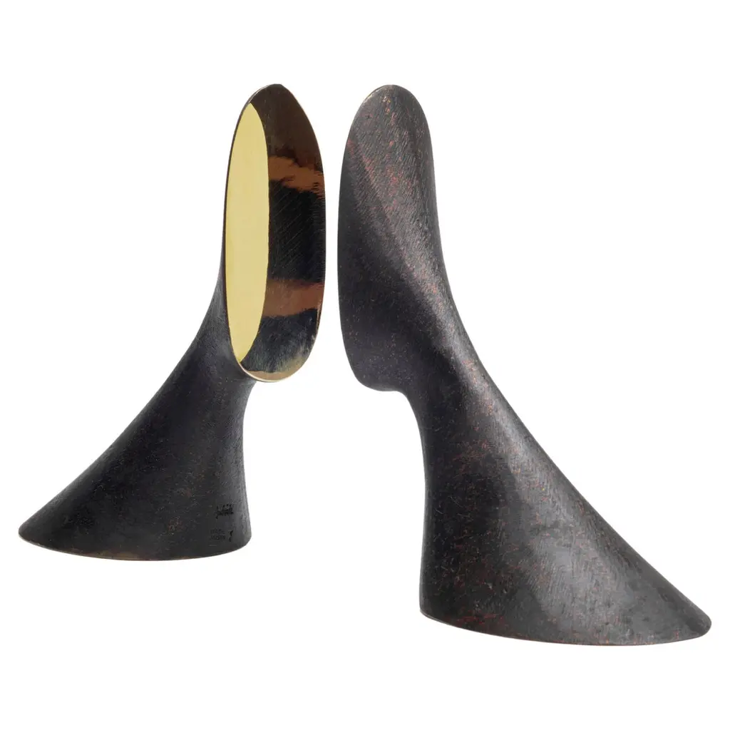 Grouping of six Carl Auböck brass bookends. Includes one pair each of models #4635, #4636 and #4637. Designed in the 1950s, these incredibly refined and sculptural bookends are executed in patinated and polished brass. Price is for the set of six bookends. Two sets in stock ready to ship. Available in unlimited quantities. Please note that in-stock availability is subject to change at any time. Allow additional 3-4 weeks for items not in stock. Can take up to 8 weeks. Produced by Carl Auböck IV in the original Auböck Werkstätte in the 7th district of Vienna using the same exacting standards, high-quality materials, original molds and techniques of his legendary grandfather. Auböck's design career was long and varied, reaching its pinnacle of prestige at the Triennale di Milano in 1954, where he received four gold medals in recognition of his iconic work.Please note that only one representative example of each item is shown in the images. Finish varies from item to item due to the handmade nature of their fabrication and due to the unique chemical patination process, which is meant to simulate 80-100 years of exposure of brass to sunlight.Made to order. All sales are final.