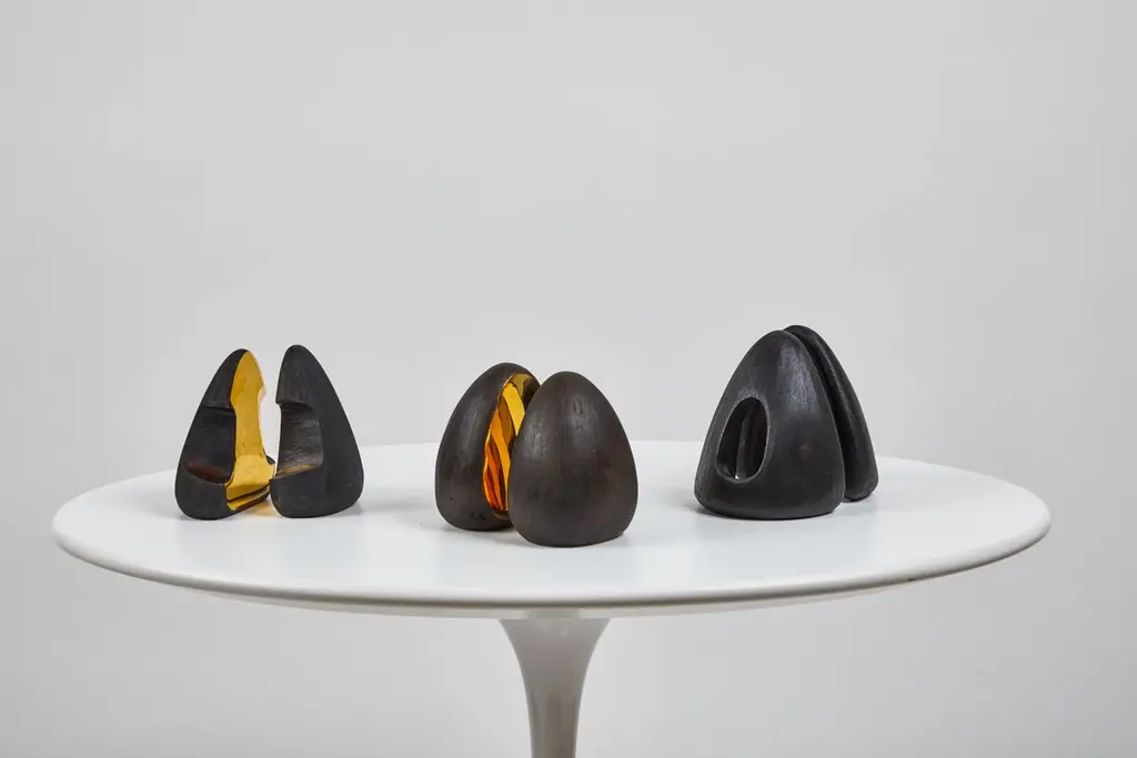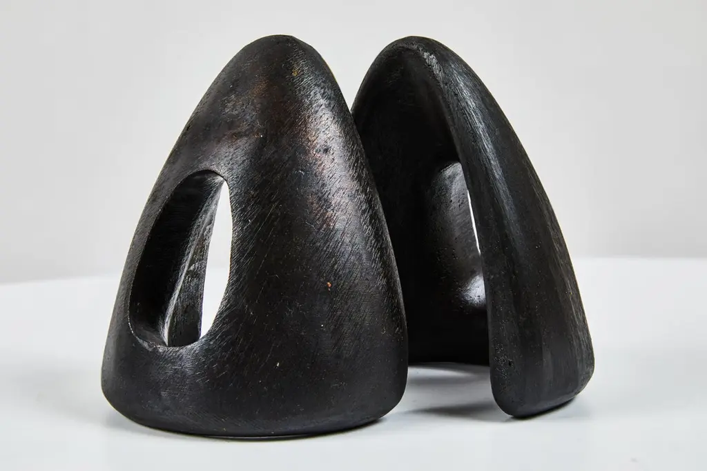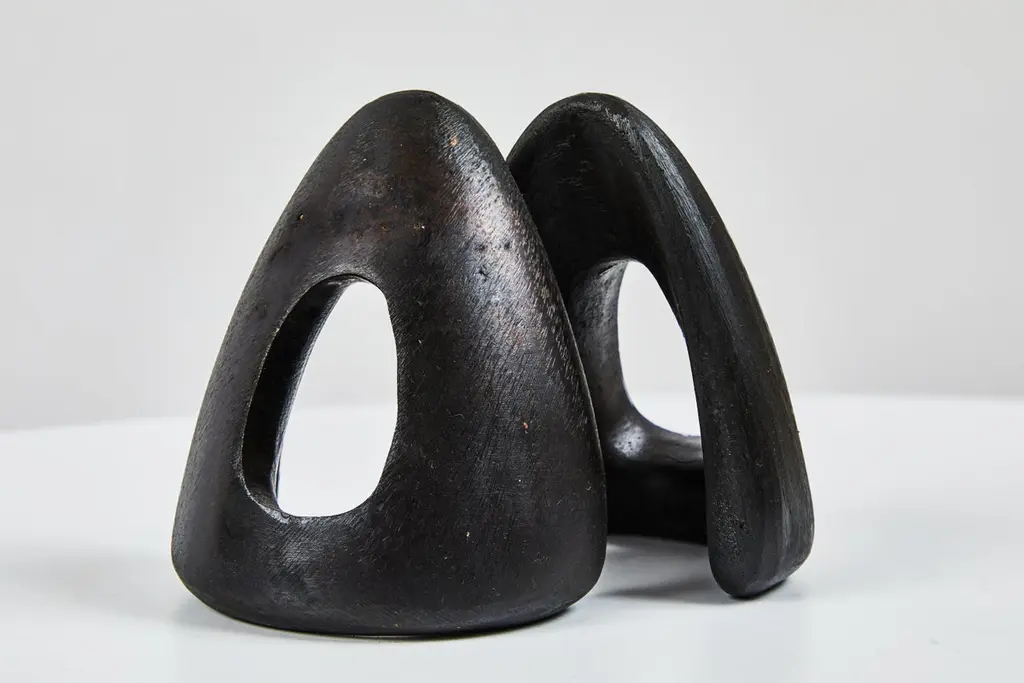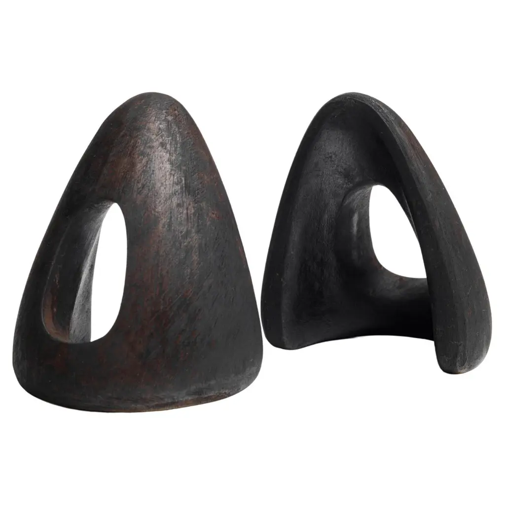 Grouping of six Carl Auböck brass bookends. Includes one pair each of models #4635, #4636 and #4637. Designed in the 1950s, these incredibly refined and sculptural bookends are executed in patinated and polished brass. Price is for the set of six bookends. Two sets in stock ready to ship. Available in unlimited quantities. Please note that in-stock availability is subject to change at any time. Allow additional 3-4 weeks for items not in stock. Can take up to 8 weeks. Produced by Carl Auböck IV in the original Auböck Werkstätte in the 7th district of Vienna using the same exacting standards, high-quality materials, original molds and techniques of his legendary grandfather. Auböck's design career was long and varied, reaching its pinnacle of prestige at the Triennale di Milano in 1954, where he received four gold medals in recognition of his iconic work.Please note that only one representative example of each item is shown in the images. Finish varies from item to item due to the handmade nature of their fabrication and due to the unique chemical patination process, which is meant to simulate 80-100 years of exposure of brass to sunlight.Made to order. All sales are final.
