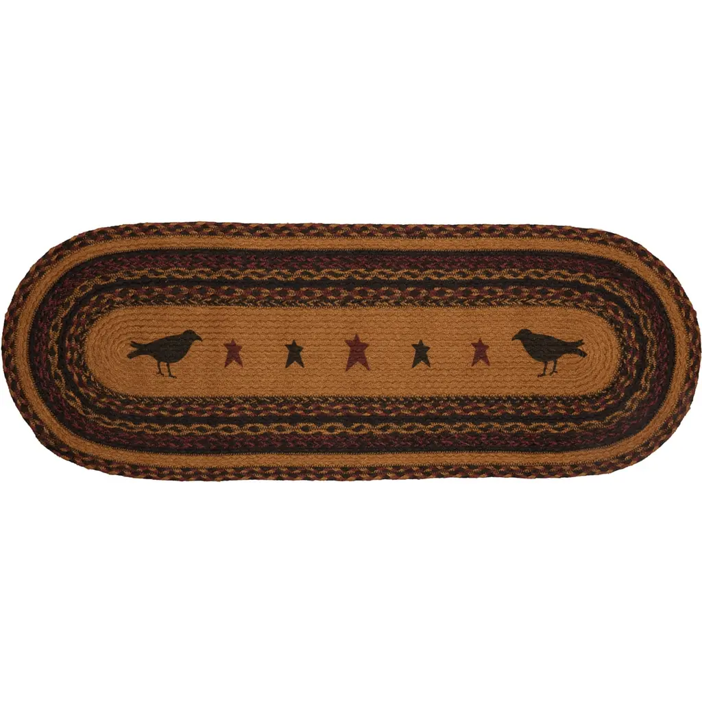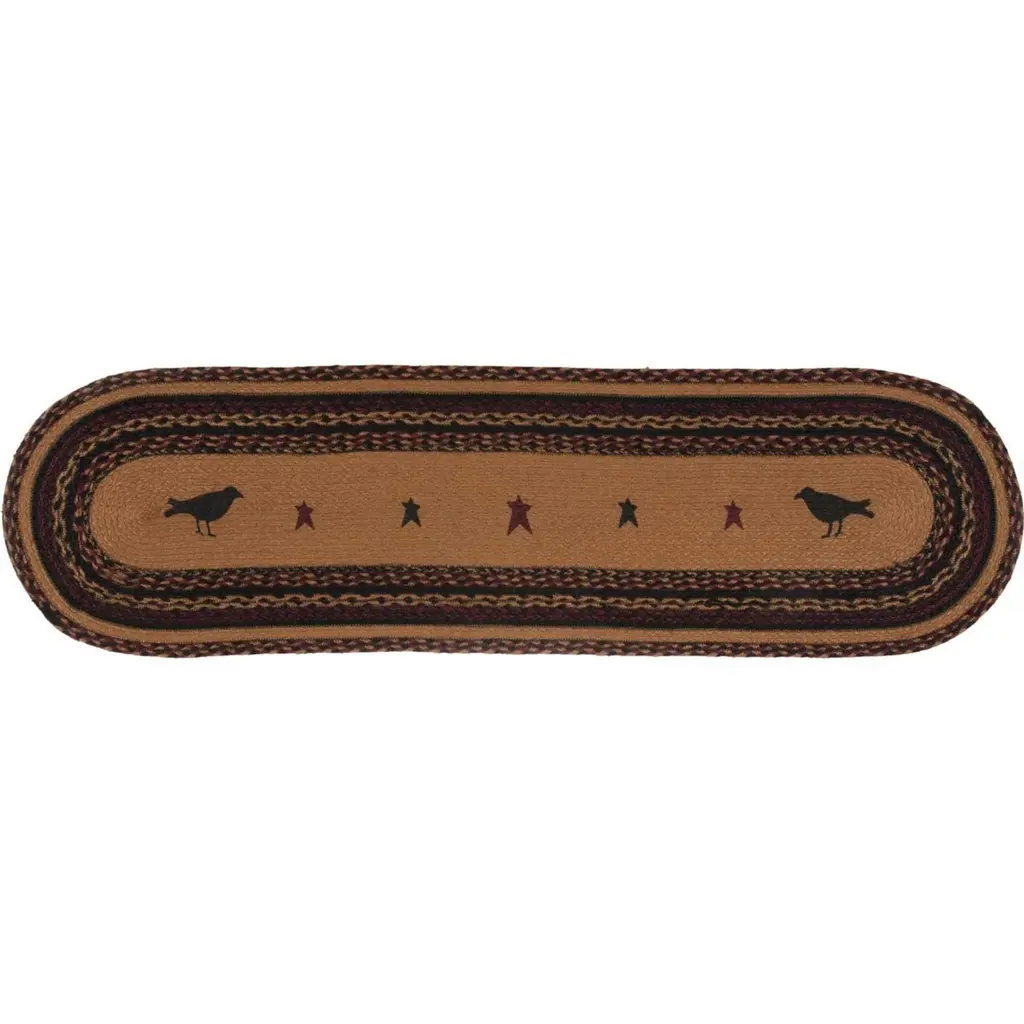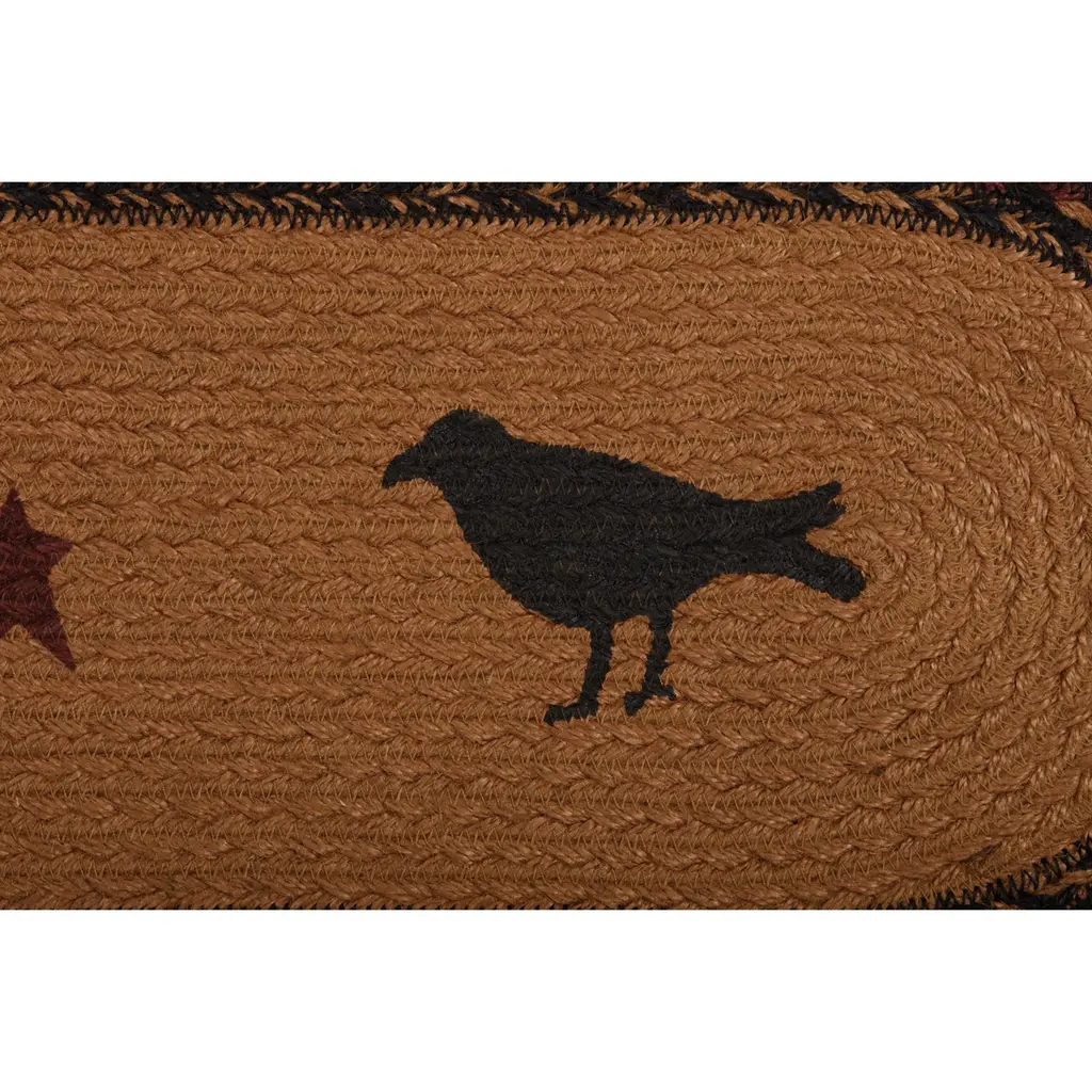 The Heritage Farms Crow Jute Runner Oval lifts its colors from the bedding set to complete a quietly primitive look throughout the entire house. Crow stenciling bookending primitive stars adds a homey flair to this runner.Features PREMIUM CONSTRUCTION: with over two decades experience crafting goods for American homes, our items are built to last for years to come.PRIMITIVE DECOR: traditional style that compliments any primitive or Americana home.QUALITY MATERIAL: made with durable 100% jute for a proper look and feel.PRIMITIVE PALETTE:This table runner contains concentric solid and mixed braids of mustard tan, black, and burgundyPRIMITIVE CROW & STAR: Black crow on each end with burgundy and black primitive stars stenciled in betweenREVERSIBLE: Reverses to same as front but without stencilsDURABLE & STRONG: Machine stitching holds braiding together even with increased wear and tearBRAIDED: Machine braided, Machine stitchedSpecifications Material: 100% JuteColors: Mustard Tan, Raven Black, BurgundyManufacturer Country: IndiaCare: Spot CleanSizes Available 13" x 36" - 1 lb13" x 48" - 1.3 lb* To prevent colors from bleeding do not use chemicals or wet clean this item. A rug pad is recommended to keep your surfaces safe from color bleeding and abrasiveness of the jute fibers.