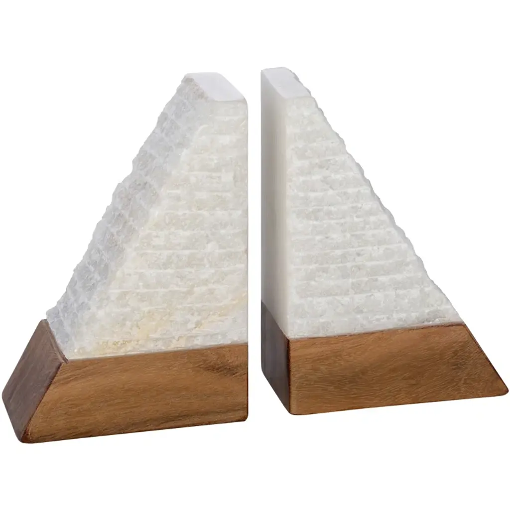 Classic literature. Inspired by pre-Columbian Mayan architecture, these bookends showcase a stepped pyramidal shape carved from craggy white stone. Wooden bases add organic contrast – and contribute to a substantial weight that holds up even the heaviest hardcovers.
