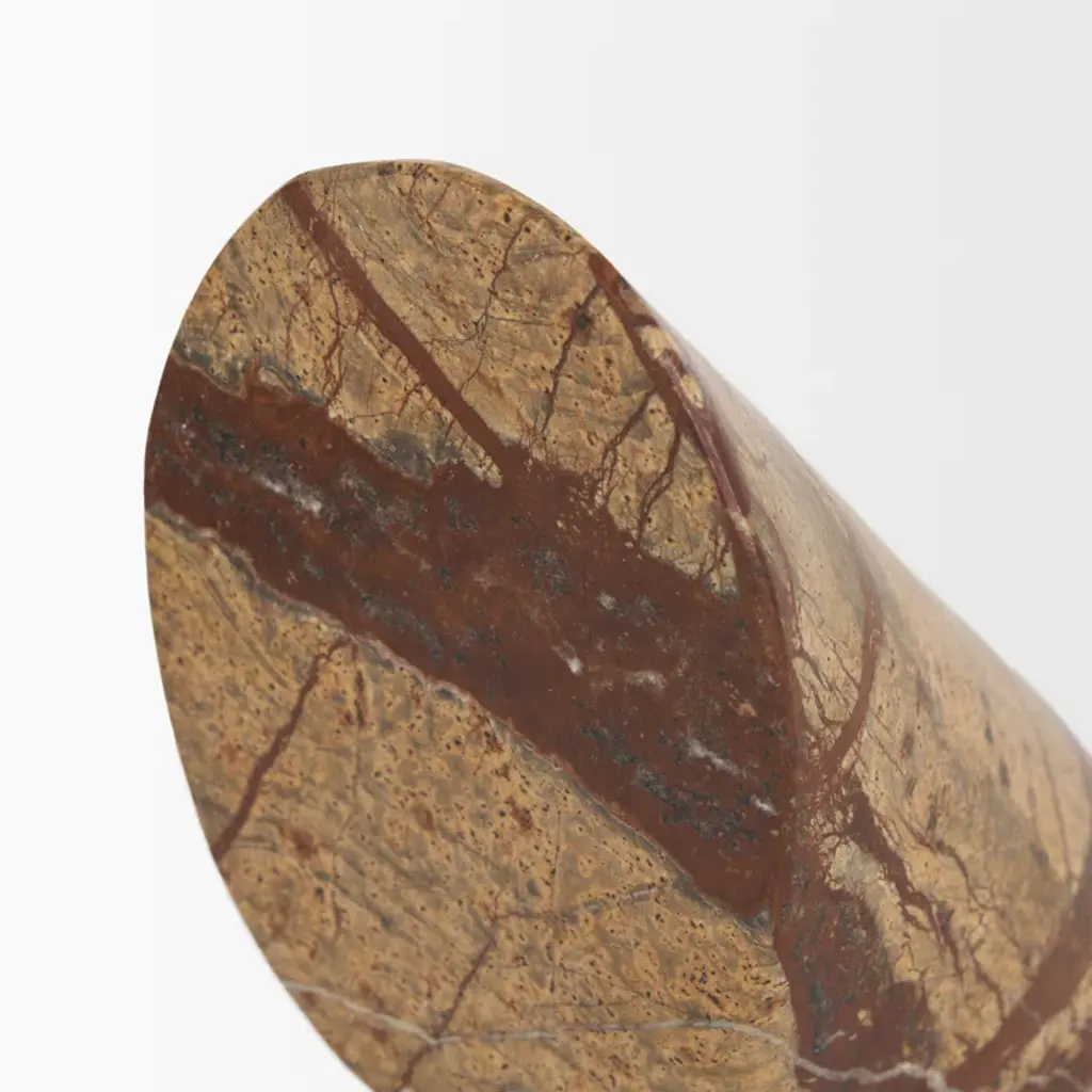 A set of bookends meticulously crafted from distinctive forest Marble, a swirl of browns, beiges, grays, and other intriguing undertones. Its beauty and wide variations make each set feel like a one-of-a-kind object. Its rounded angle creates a captivating illusion, giving the impression of a subtle protrusion from the surface they grace.