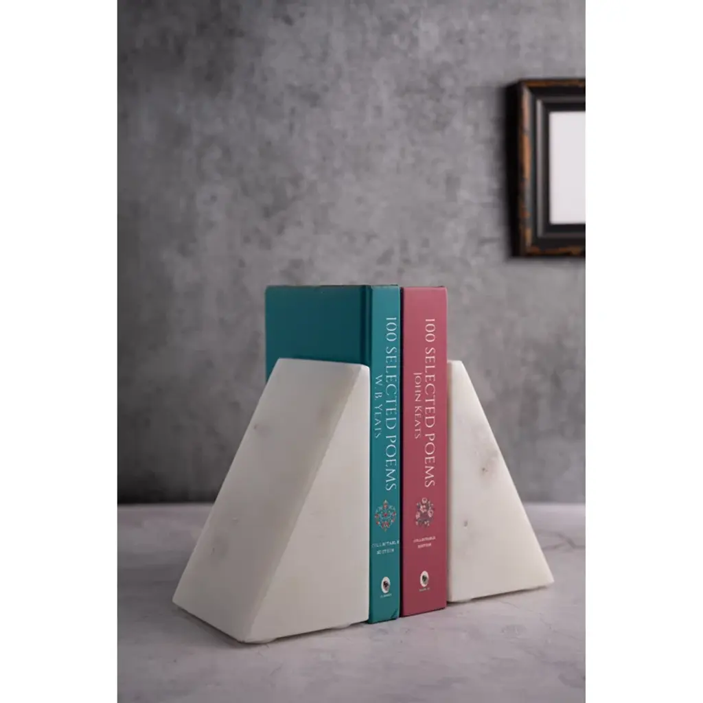 Story structure. This set of bookends is crafted from marble, so these bookends are substantial enough to hold a heavy reading in place. Together this set form a triangular shape that lends a satisfying arc to your shelves, and these bookends' cloudy gray veining adds dimension and organic detail.