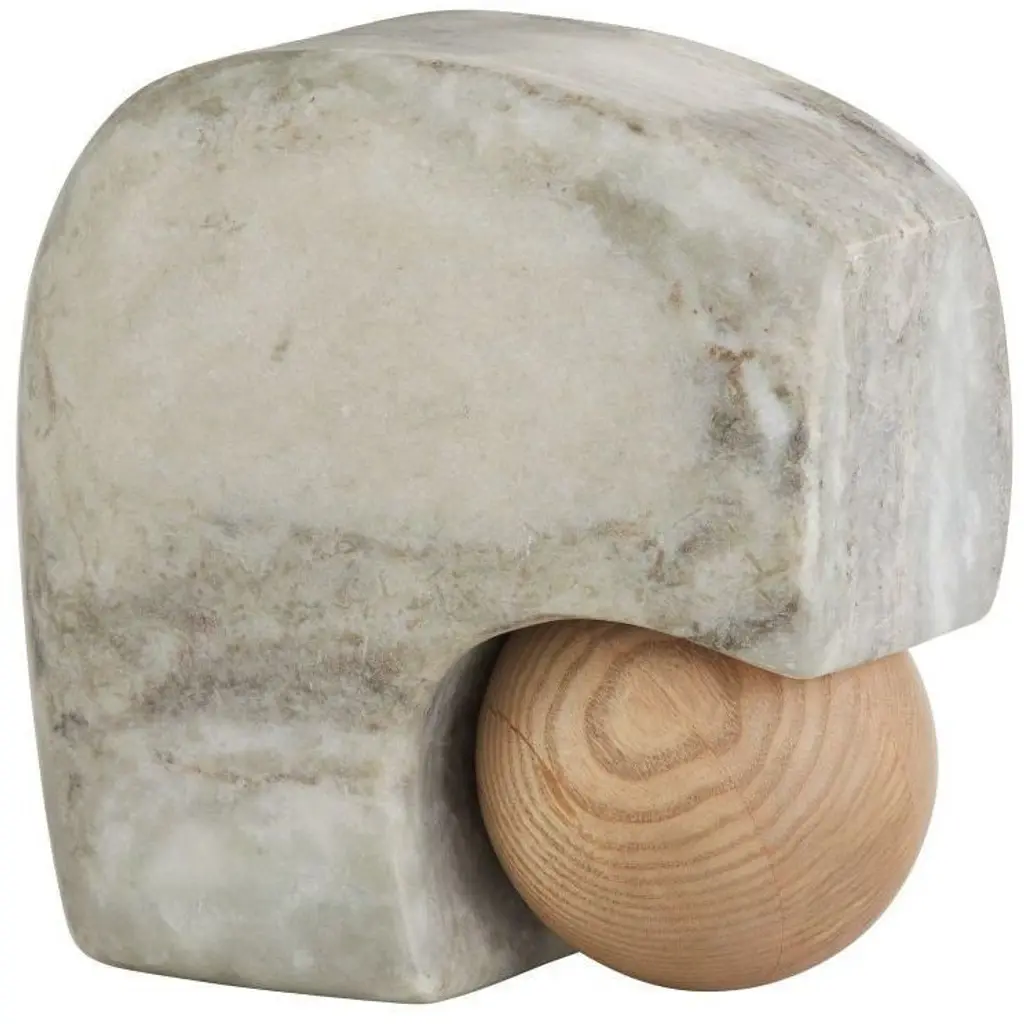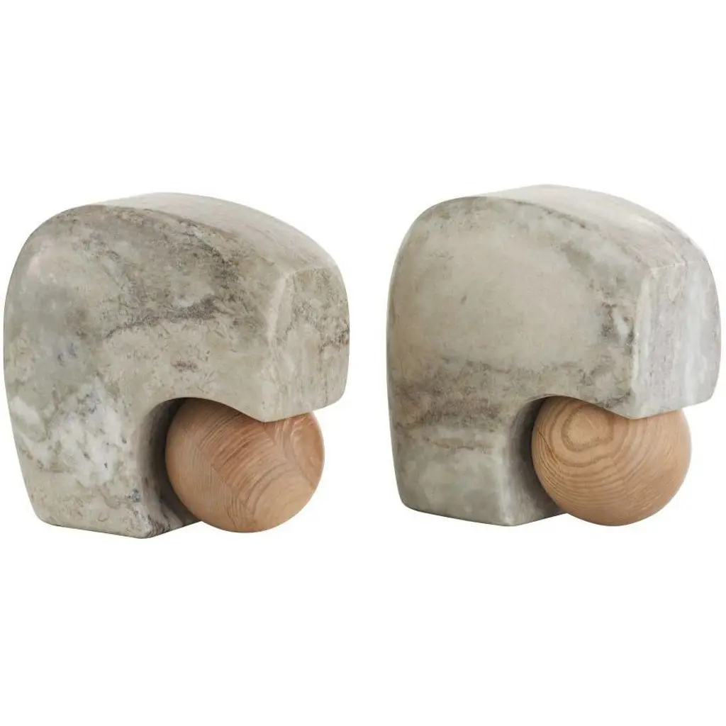 Pairing solid materials and soft forms, grey marble seems to melt over polished natural oak spheres to create the Melt Bookends. The pieces express an enveloping, fluid quality found throughout Workshop/APD's collection. Finish will vary.