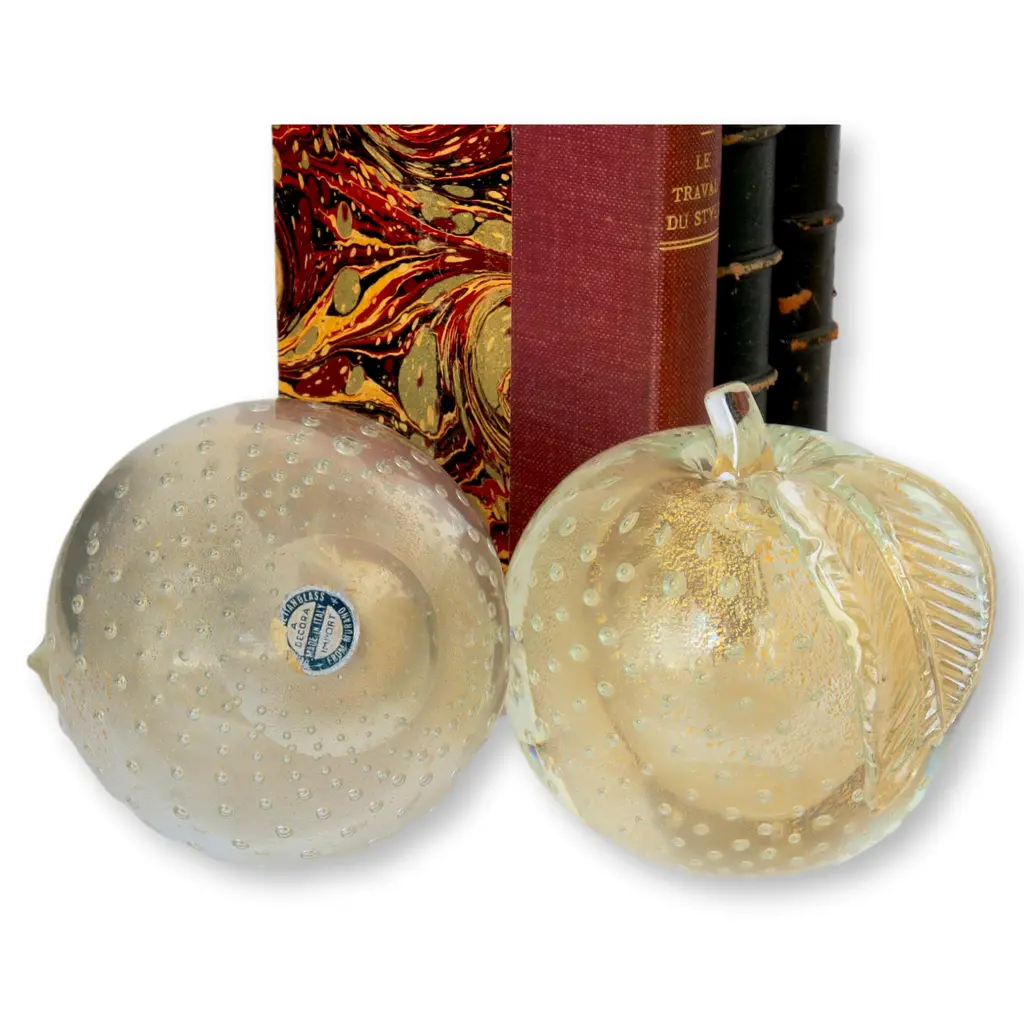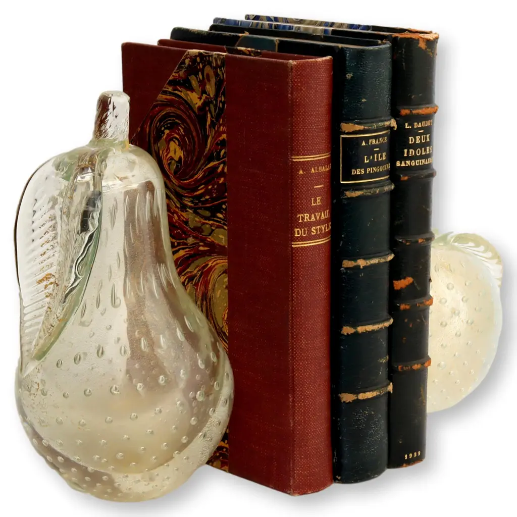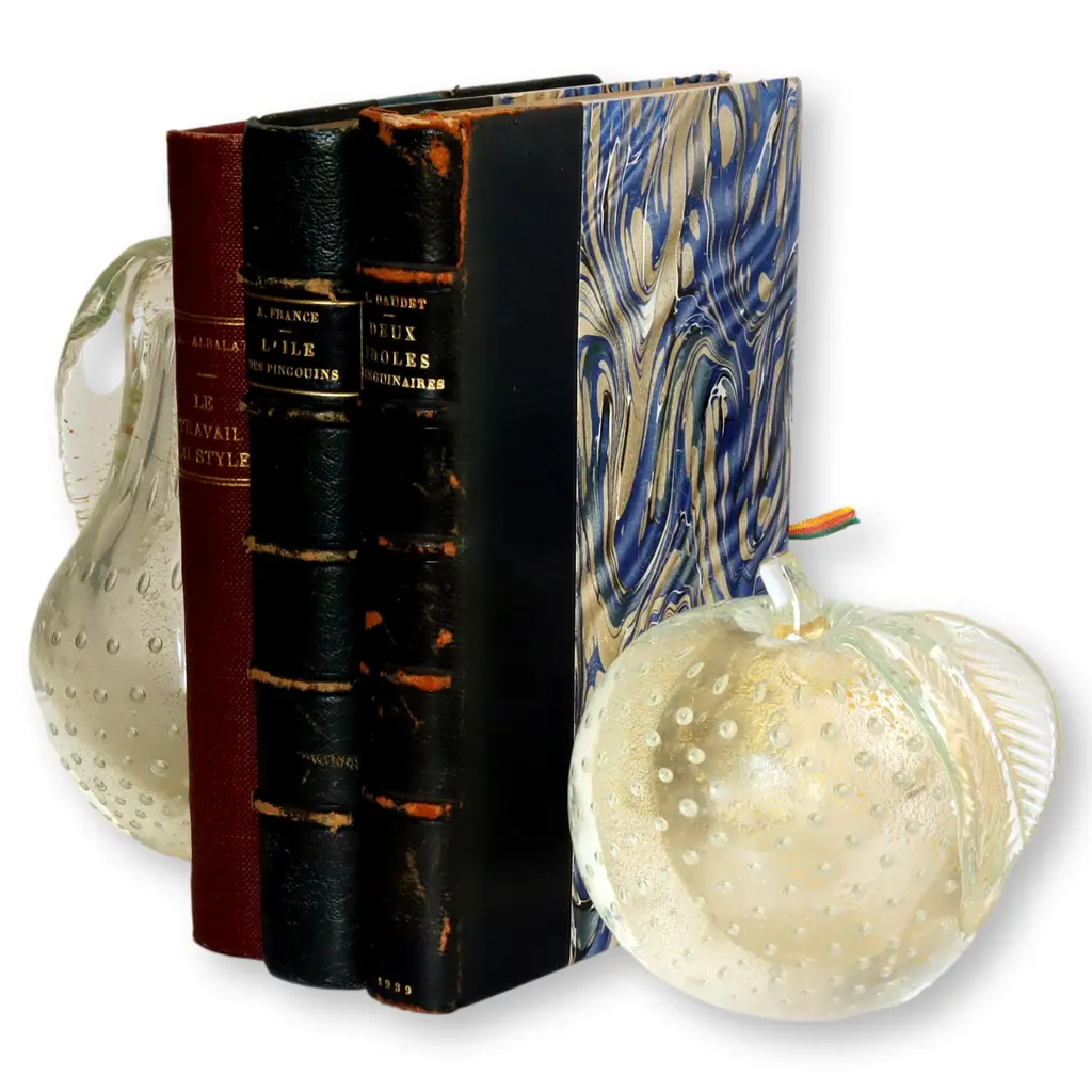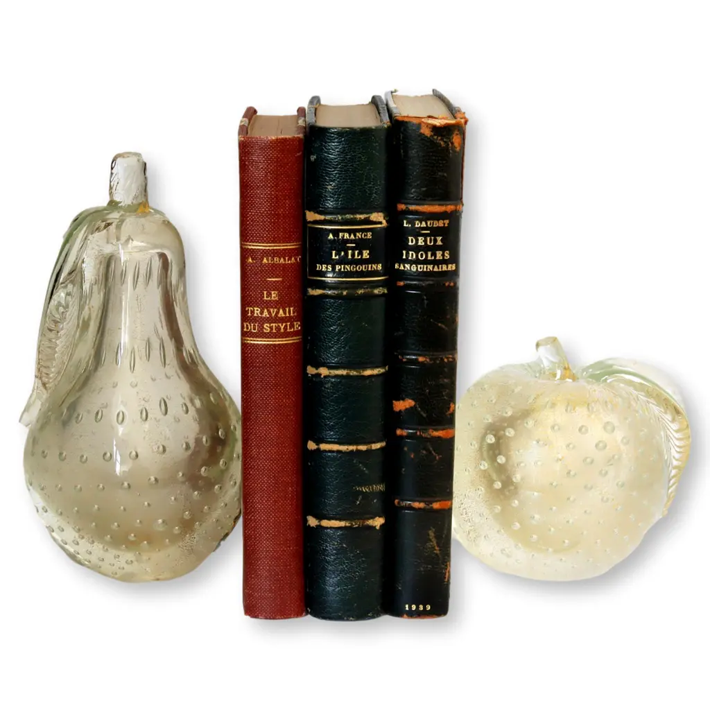 Midcentury hand-blown Murano glass apple and pear bookends. Each has a flat surface to place against books and hold them securely together. Champagne color with bubbles and gold flakes. Dimensions: pear, 3.5"L x 3.5"W x 6.5"H; apple, 4"L x 4"W x 4"H. Maker's mark on underside of pear. Books not included.