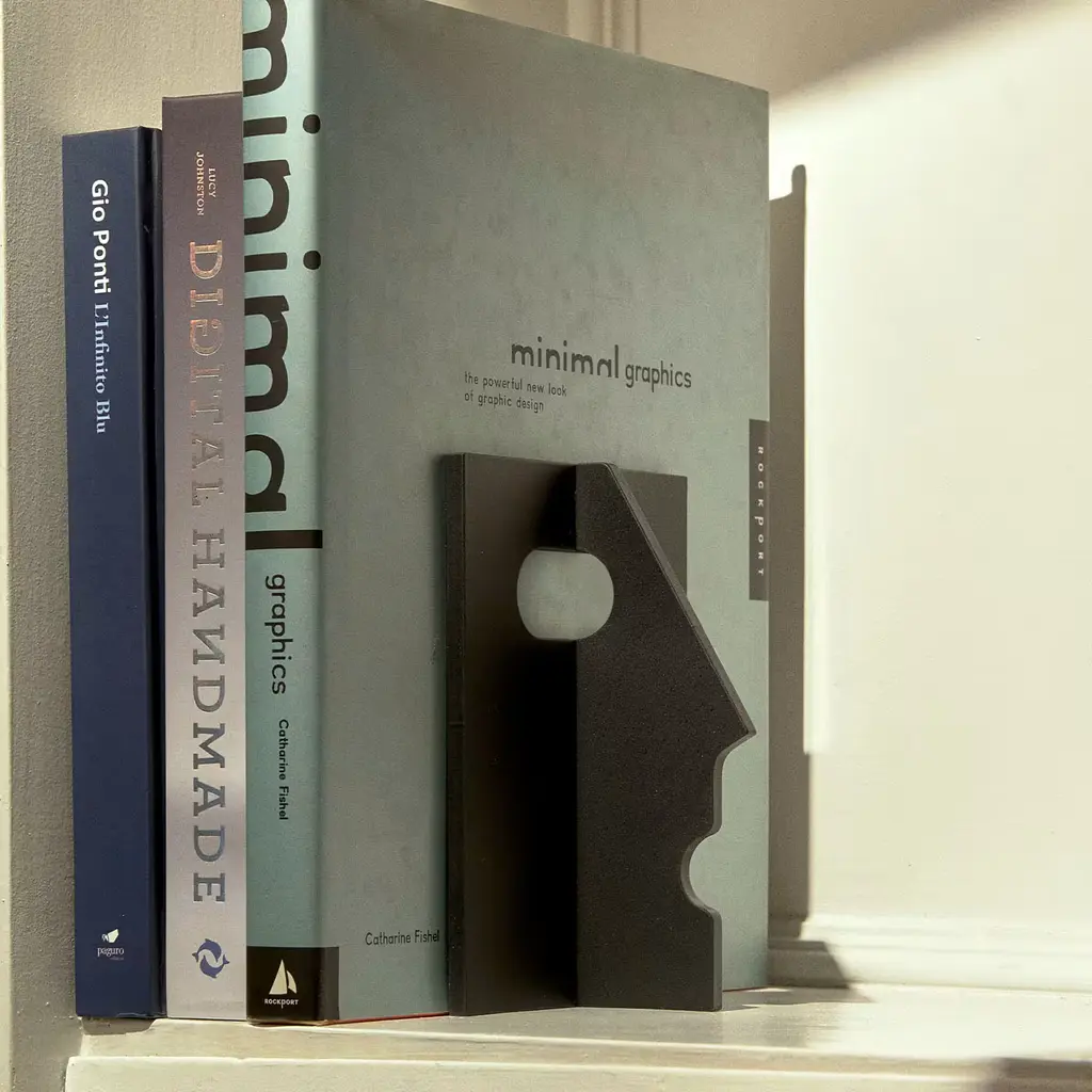 Mister T emerges from a construction staple: the 'T' section of a beam repurposed into a steel bookend. Shedding its structural role, it adopts a dual ornamental and functional purpose. The defined face, endowed with weight and shape, adeptly supports and organizes books and magazines.