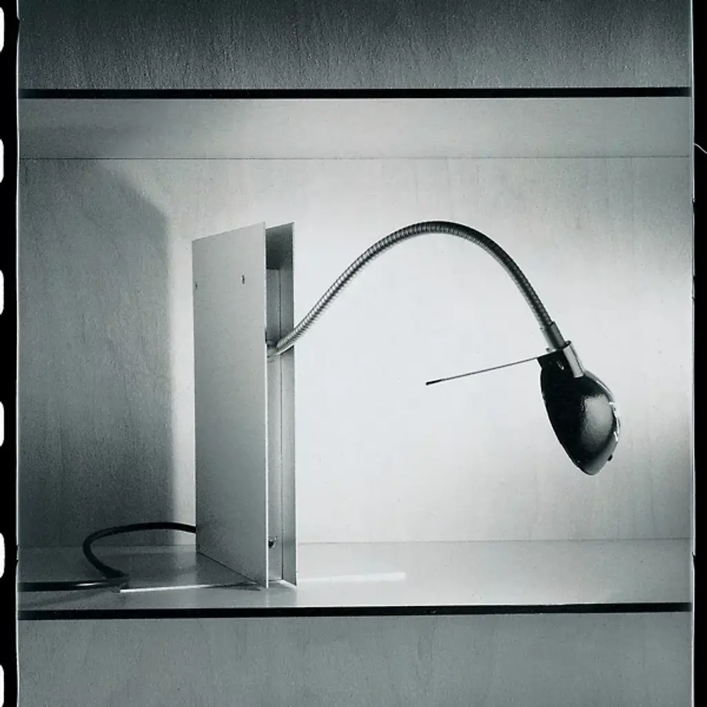 Sexy and studious, the Ingo Maurer Oskar Task and Bookend Light was designed by Maurer to both hold books in place when they're on a shelf and illuminate their pages when they're being read. The slim, rectangular aluminum transformer base fits in seamlessly with a row of books. From this, an adjustable metal arm projects for perfectly positioned reading light.