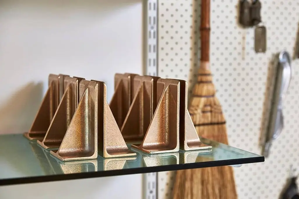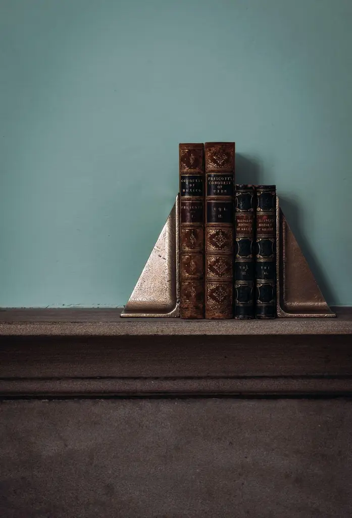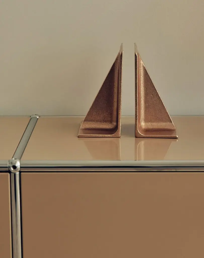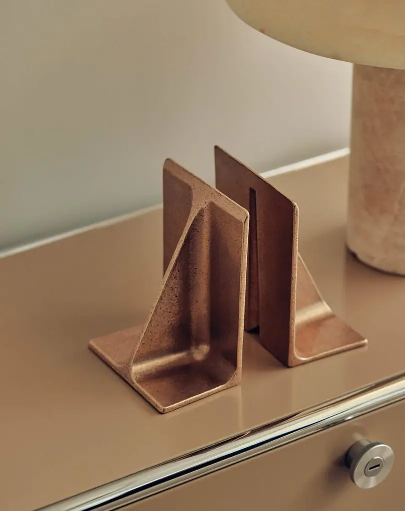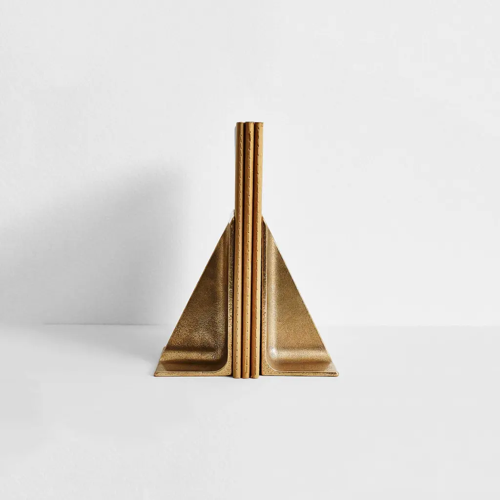 Pair of 2 Small Fin Bronze Bookends by Henry WilsonDimensions: W 8 x D 6 x H 13 cmMaterials: BronzeFin bookends come in two sizes. Each is made, finished, and polished in Sydney, Australia, using sand-casted gunmetal bronze. Their weight and size can support the heftiest of editions.Fins are used in casting to strengthen shapes and help brace corners. The fin imprints the front and back of the casting, further refining the amount of material required. The gentle taper to the face and base of your bookend hints at how it’s made.Fin bookends are manufactured in small batches, so slight variations will occur from piece to piece. Production marks may include slight pour ripples or surface pitting. They will arrive with a bright finish but will oxidize and darken over time to reveal a distinctive patina. Simply use a metal polish to restore a like-new finish.Dimensions small: mm. 60 x 80 x 130 HAlso available in large 75 x 117 x 156 HHenry Wilson's work combines rational, democratic utility with an element of sculptural expression. Our products have clear form and function, but it’s important that they also have feeling. We are interested in the awkward beauty that comes from something made by hand. We would like to explore how imperfection can be introduced into an industrial process to make something at a scale that retains a sense of individual charm.Permanent collections and exhibitions- Museum of Applied Arts and Sciences, Sydney, Australia- Art Gallery of Western Australia, Perth, Australia- 'Sempering' XXI Triennale, MUDEC, 2016, Milan, Italy.