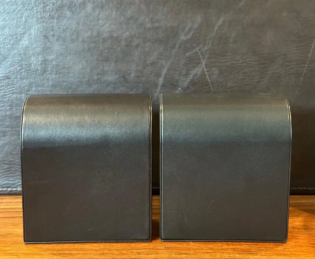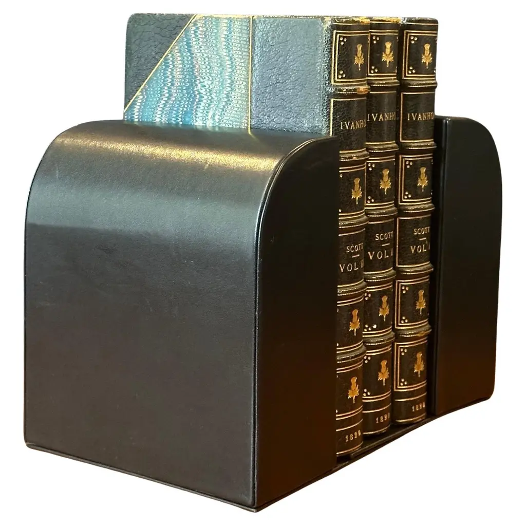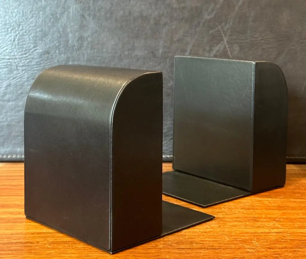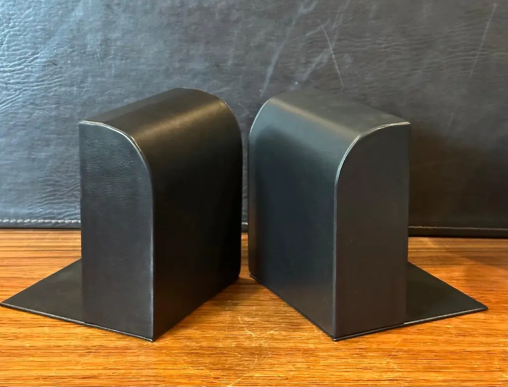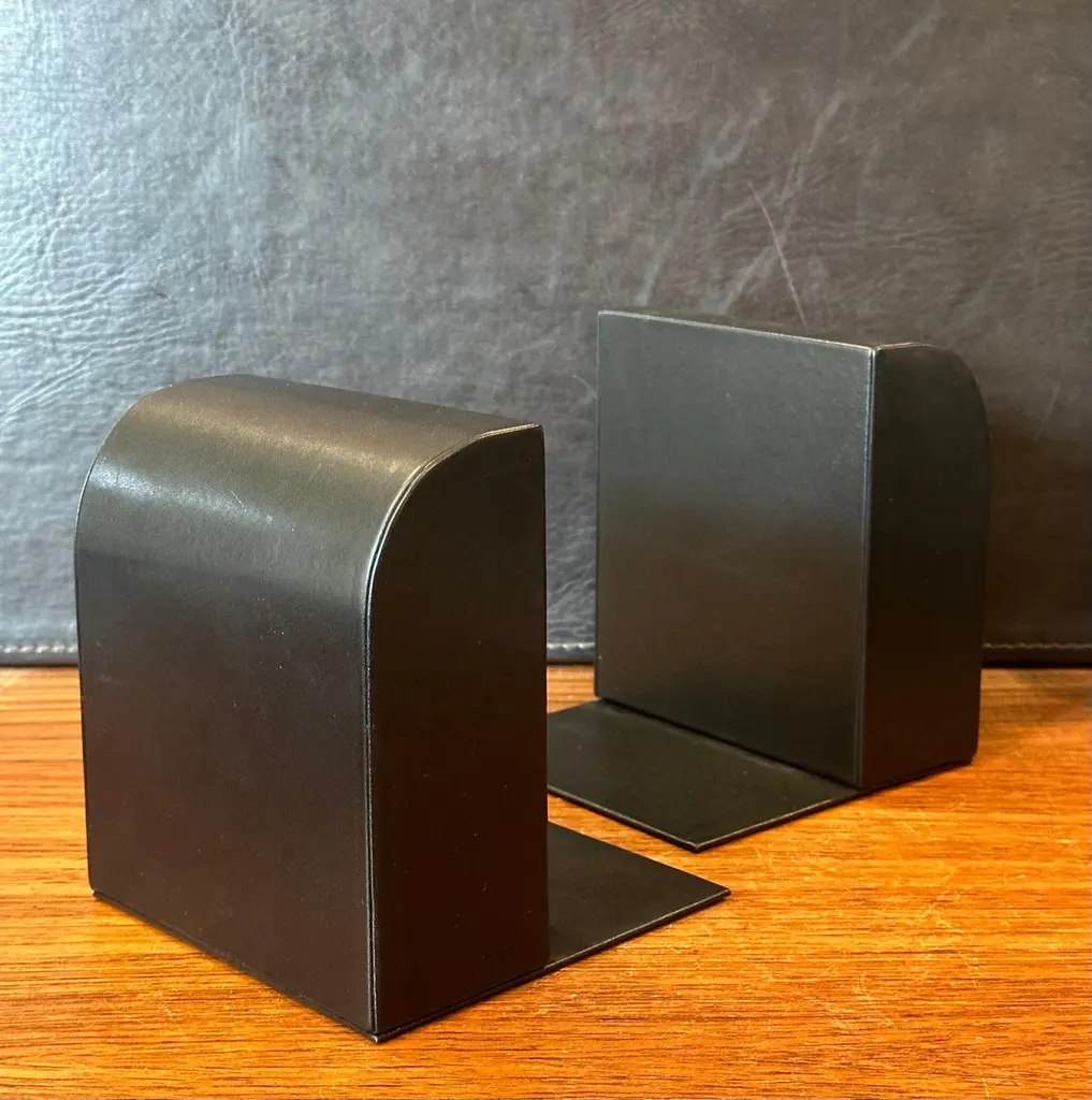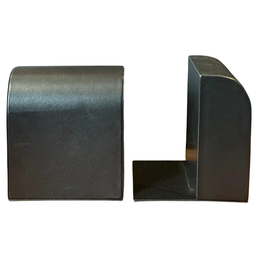 Classic pair of black leather bookends by Stuart Kern, circa 1990s. The bookends are in like new condition and measure 10.75"W x 5.5"D x 6"H. Very nice high quality pair! Two sets available. #3995