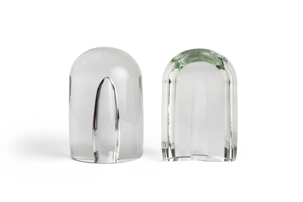 The Portal design is a simple exercise in optics and color. The clear color and reflective light are diffused by a surface etching on the top third of the interior of each bookend. A single channel is carved and brought to an optical polish on the interior of each bookend allowing an effect that distorts reflections from different viewing angles.Each set is made by the hand of the artist in Brooklyn, NY.