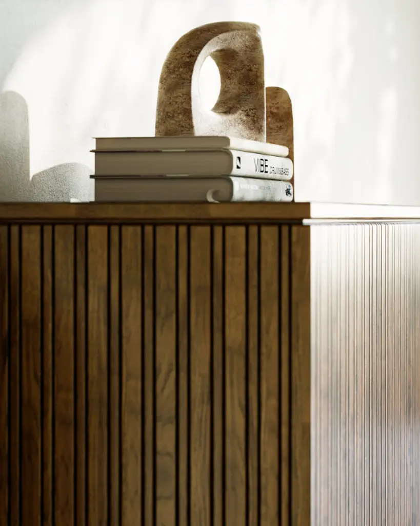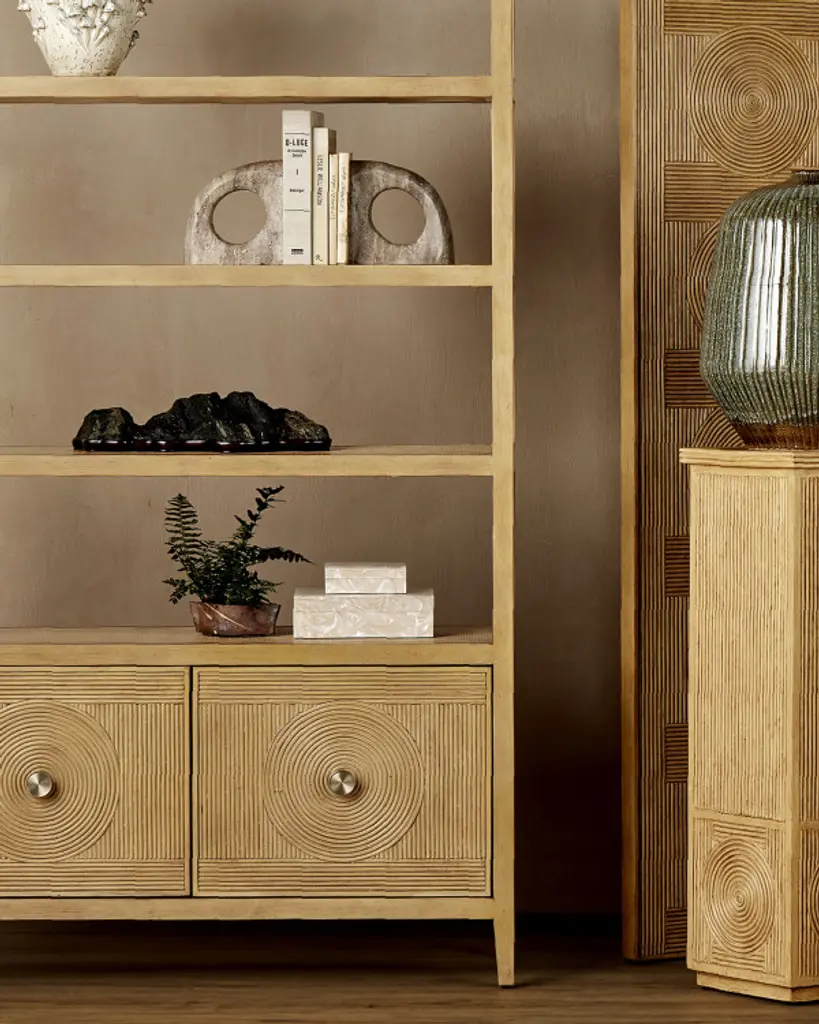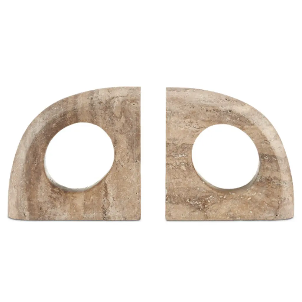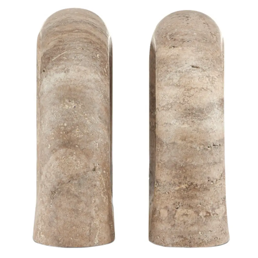 The Russo Travertine Object Set is crafted from titanium travertine, featuring surfaces with a dynamic pattern that distinguishes it from other travertine stones. These sculptural pieces are versatile, designed to also function as bookends. Due to the natural stone material, the pitting and veining on these objects will vary, making each piece unique.