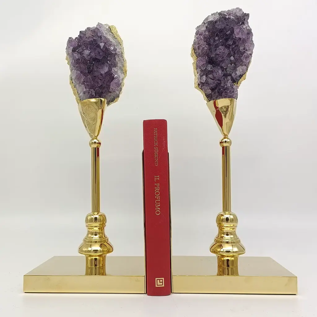 Pair of bookends featuring a 24 Kt gold-plated brass base and stand, topped with natural amethyst druse enriched with 24 Kt gold detailing. Each piece measures 15 cm by 11 cm at the base with a height of 38 cm. The polished finish enhances the luxurious combination of raw gemstone texture and gleaming metal, making this an elegant addition to any office or lifestyle desk setup.