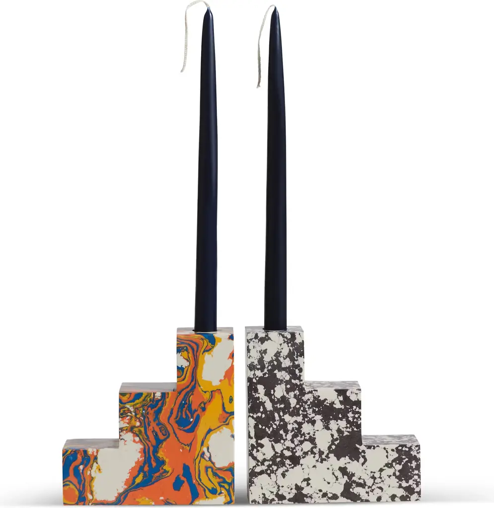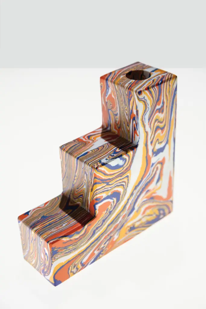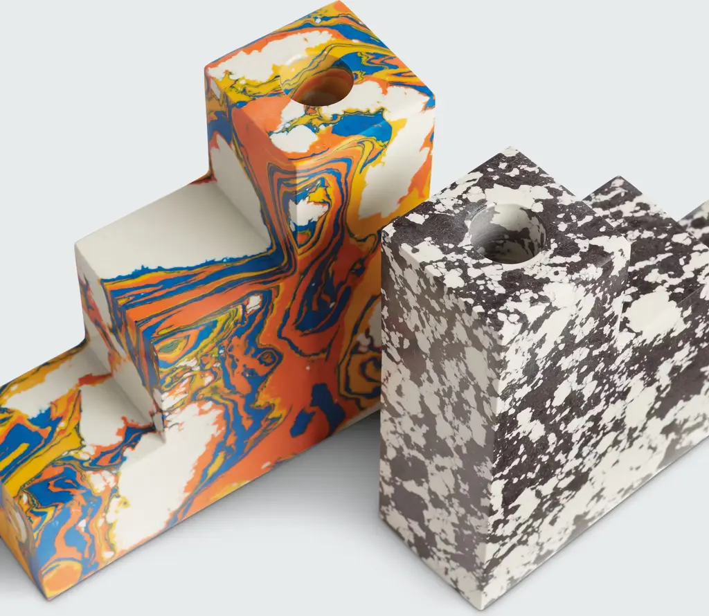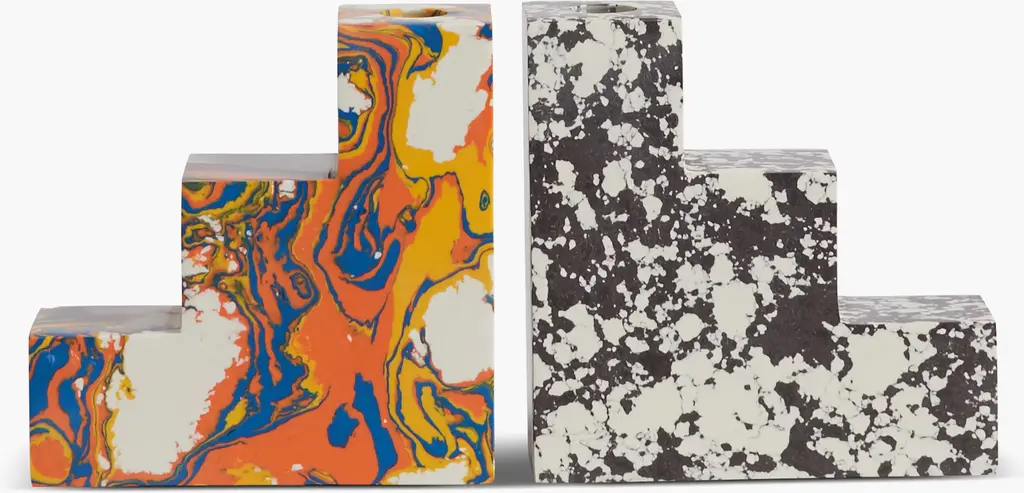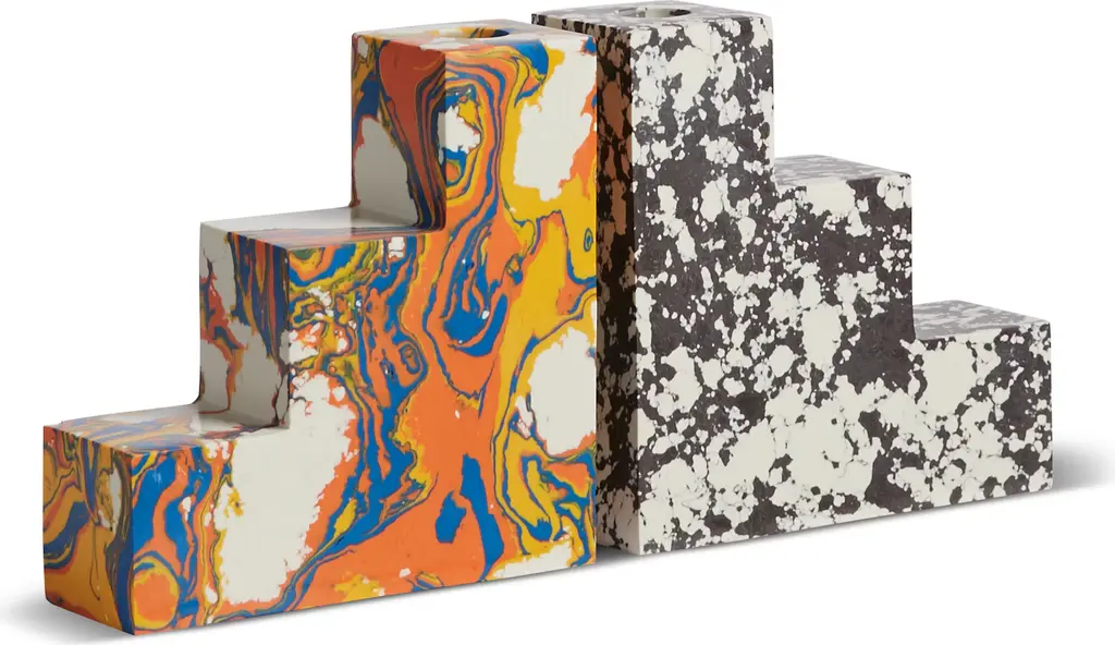 Swirl Stepped Bookends (2019) by Tom Dixon are bold, sculptural bookends (or candleholders) with striking silhouettes, coloration, and personality. They're made using recycled powdered marble mixed with pigment and resin to create solid, heavy blocks that are then hand cut and turned on a lathe. Each piece features unique patterns due to the pigmentation and pouring process. Each bookend can hold a single candle; candle not included. Made in India.