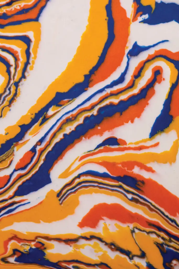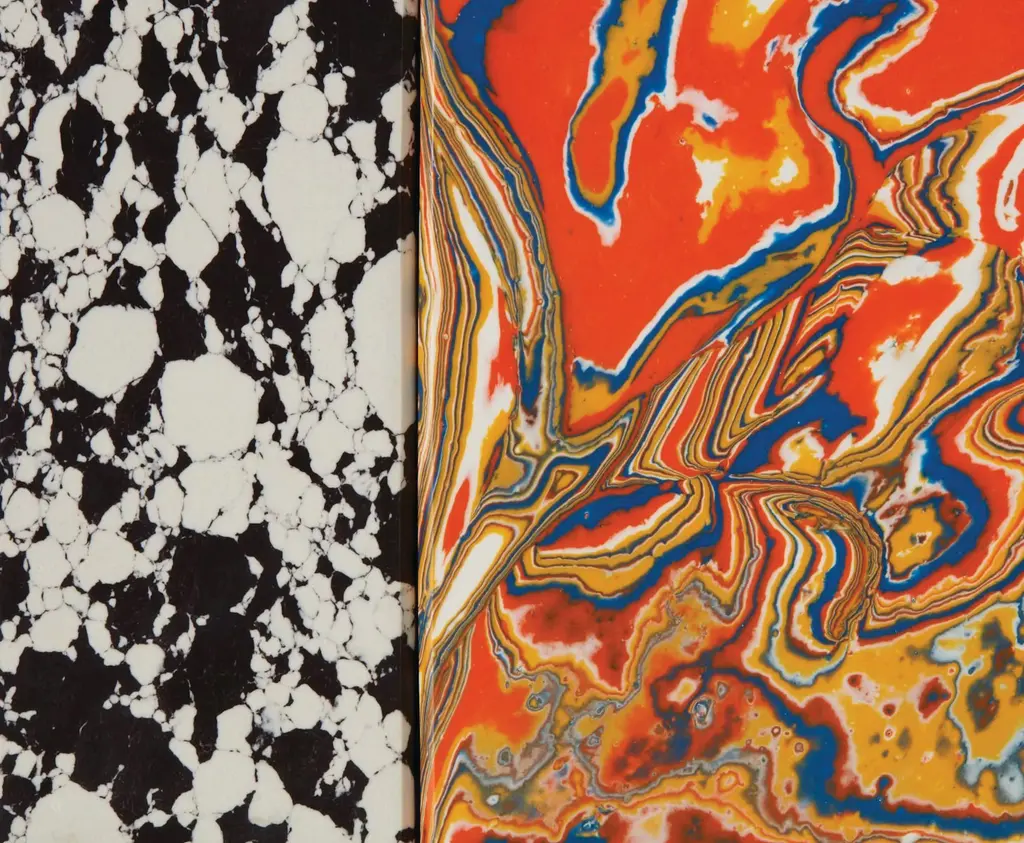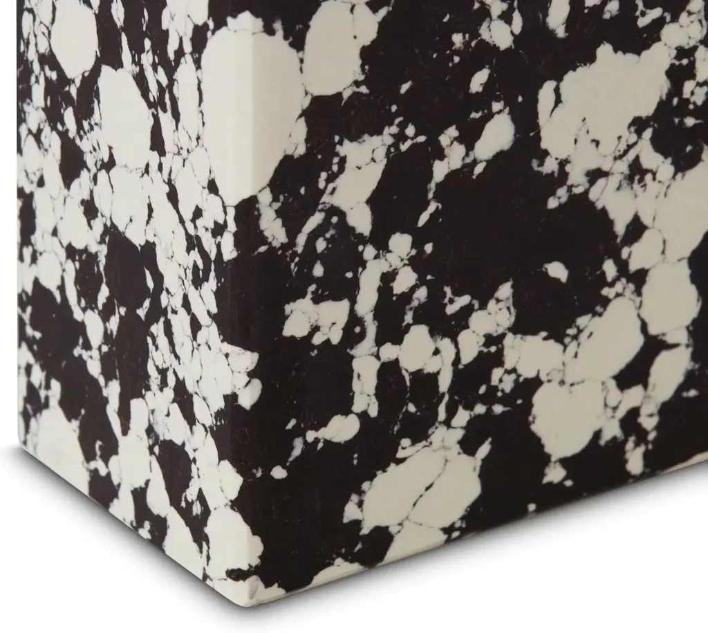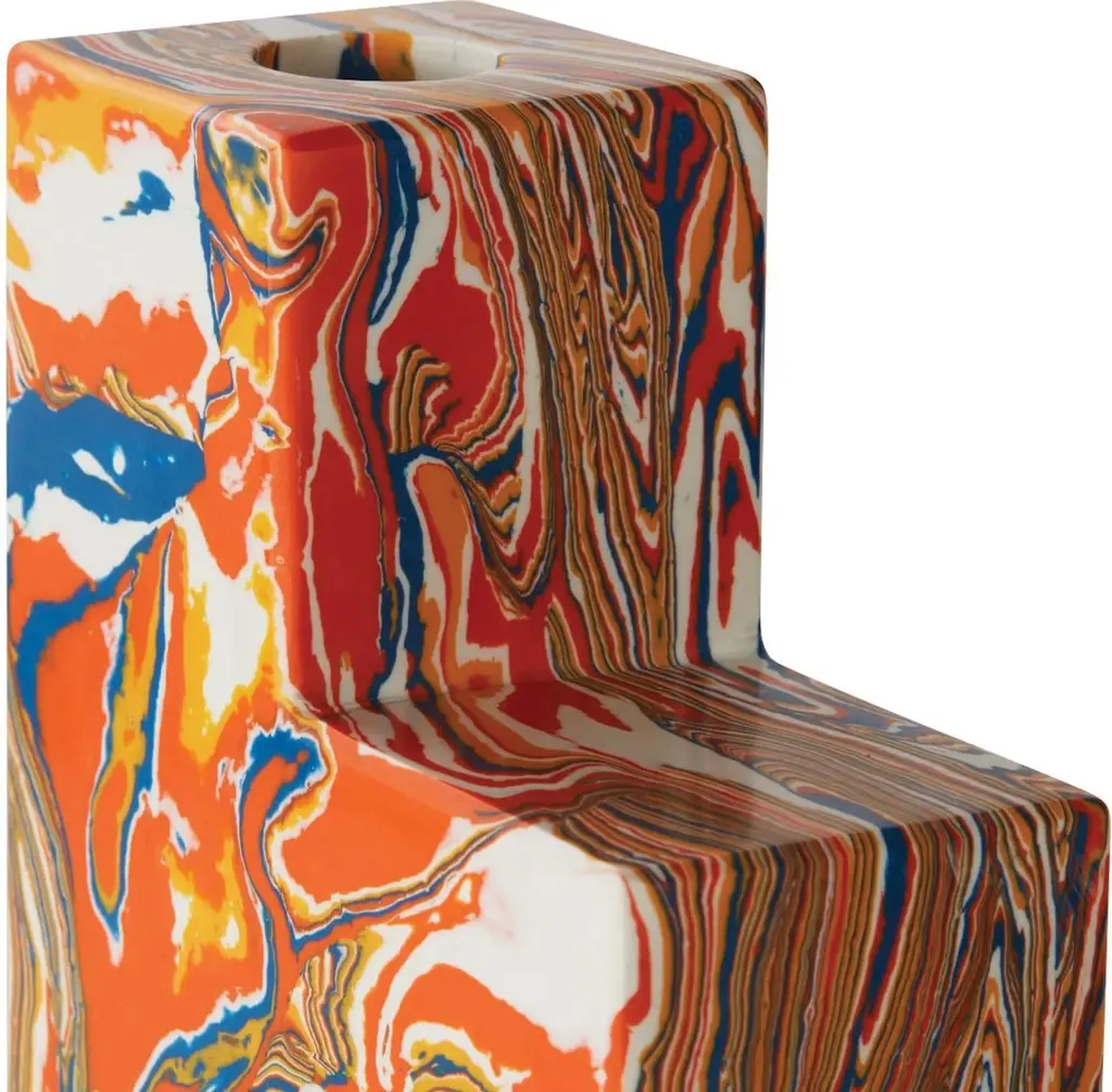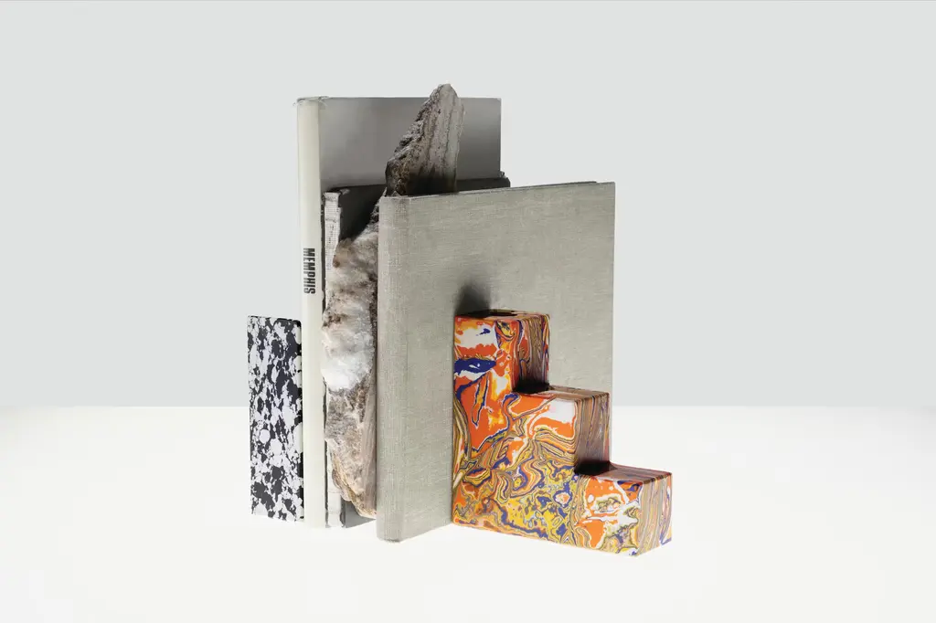 Swirl Stepped Bookends (2019) by Tom Dixon are bold, sculptural bookends (or candleholders) with striking silhouettes, coloration, and personality. They're made using recycled powdered marble mixed with pigment and resin to create solid, heavy blocks that are then hand cut and turned on a lathe. Each piece features unique patterns due to the pigmentation and pouring process. Each bookend can hold a single candle; candle not included. Made in India.