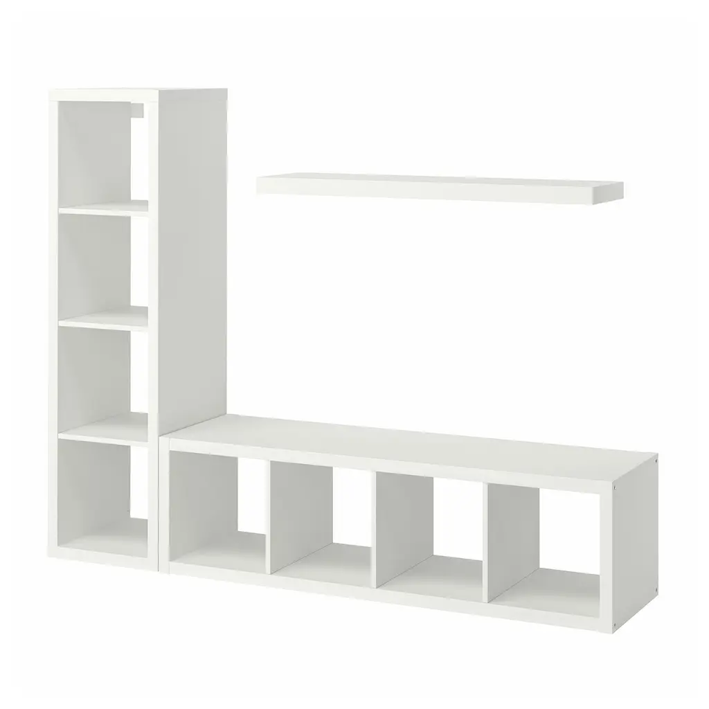 KALLAX / LACK Storage combination with shelf - white 74 3/8x15 3/8x57 7/8 ". LACK wall shelf becomes one with the wall thanks to the concealed mounting hardware. This furniture must be secured to the wall with the enclosed wall anchoring device. May be completed with KALLAX insert, sold separately.