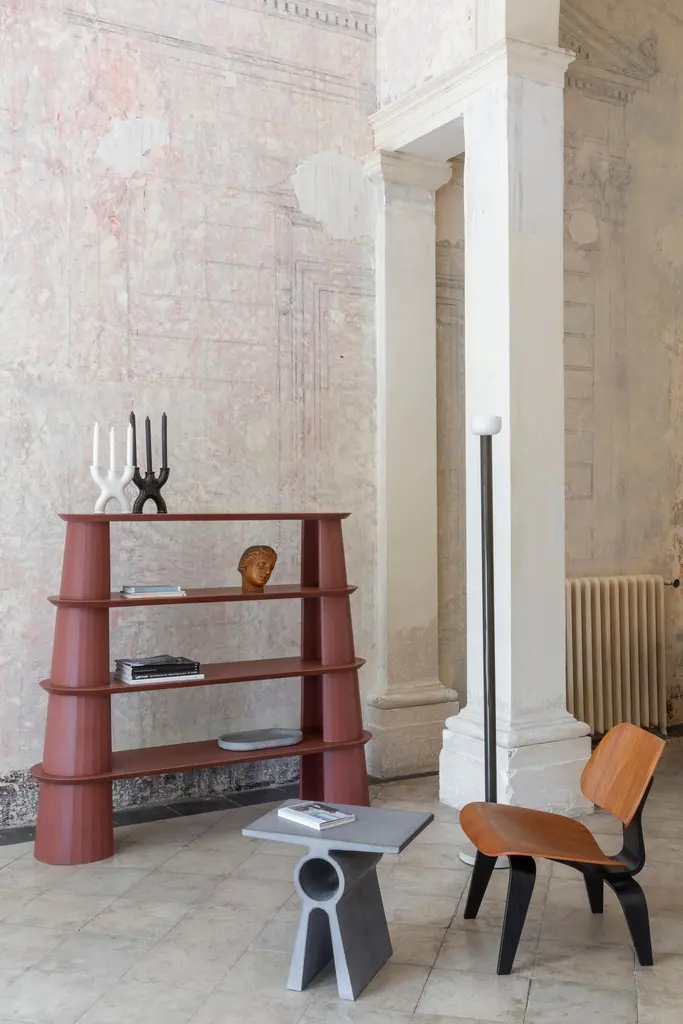 Bookcase part of a collection of modular system in ultra-high performing cement mortar. UHPC tabletop and base colored in the mixture and sandblasted. Available in eight different colors: Brick, silver, powder, cream, fir, dark, chocolate, ink and ultra marine. Each item is hand treated and is protected with water repellent products to reduce the absorption of oily substances and to minimize the making of stains.Surrealism, primitivism, metaphysics and brutalism. Art together with architecture and design build a scenario of inspirations and continuous references through which the material rises to an expressive language, ready to welcome and rework formal suggestions of different origins.Fusto is the series that introduces the new design approach. As in classical architecture, Fusto is the column that holds tables, consoles, bookcases and pedestals. Volumes and proportions are integrated in a timeless geometry, enriched with facets that make the color vibrate in a game of lights and shadows.Fusto is eternal architecture.Our products are easily recognizable by the exclusive treatment of the material and the passionate quest for lightness and style.The artisanal handicraft, the use of modern materials and innovative techniques, with a completely “Made in Italy” production, further enhances the prestige of Italian design.