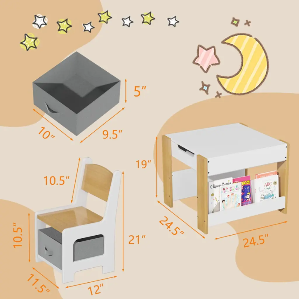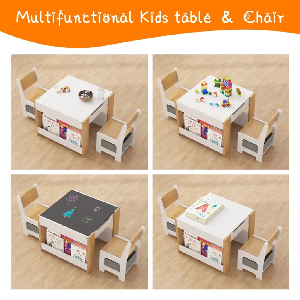 About Us:We always incorporate children's needs and parents' expectations into every detail. This Kids Table and Chair Set combine creativity, functionality, and quality, aiming to inspire children's imagination and learning interests. This Kids Table Set shows our prioritization of comfort and practicality in our products, aiming for minimalistic yet stylish designs and providing a humanized experience to create a joyful, healthy, and safe learning environment for children. Feature:This versatile kids' table transforms for drawing, building blocks, learning, and storing toys.The tabletop reverses to reveal an erasable surface for mess-free creativity.The craft table features a large storage compartment, chairs with removable drawers, and 2 bookshelves under the table for kids' items.This kids' art desk is CPC certified, ideal for home, kindergarten, playroom, and nursery! Specification:Material: MDFTable Size: 24.41" x 24.41" x 18.9"Chair Size: 11.81" x 11.42" x 20.87" Packing list:1 x table2 x chairs1 x hardware pack1 x instruction manual Note:Please follow the installation instructions step by step. Before starting, make sure you have all the parts you need. Prior to assembly, this package contains sharp edges and sharp points. Keep away from children until assembled.Refrain from placing heavy items or applying excessive pressure on the kids art table to prevent deformation or damage.Use a damp cloth to gently wipe the table surface.