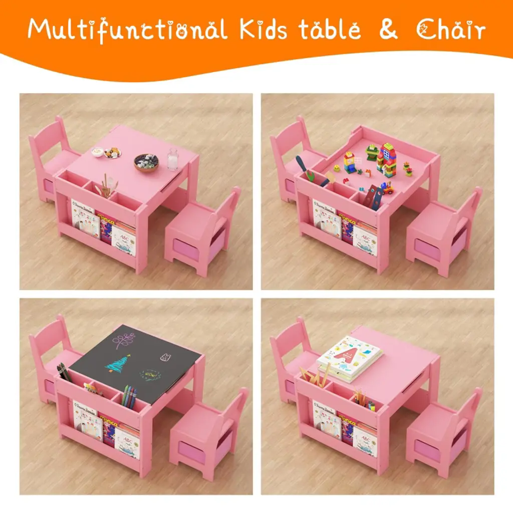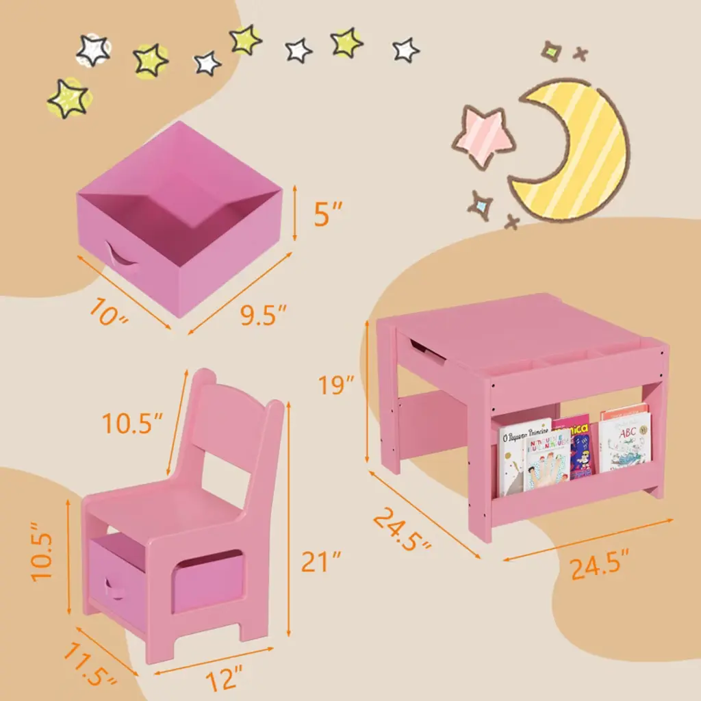 About Us:We always incorporate children's needs and parents' expectations into every detail. This Kids Table and Chair Set combine creativity, functionality, and quality, aiming to inspire children's imagination and learning interests. This Kids Table Set shows our prioritization of comfort and practicality in our products, aiming for minimalistic yet stylish designs and providing a humanized experience to create a joyful, healthy, and safe learning environment for children. Feature:This versatile kids' table transforms for drawing, building blocks, learning, and storing toys.The tabletop reverses to reveal an erasable surface for mess-free creativity.The craft table features a large storage compartment, chairs with removable drawers, and 2 bookshelves under the table for kids' items.This kids' art desk is CPC certified, ideal for home, kindergarten, playroom, and nursery! Specification:Material: MDFTable Size: 24.41" x 24.41" x 18.9"Chair Size: 11.81" x 11.42" x 20.87" Packing list:1 x table2 x chairs1 x hardware pack1 x instruction manual Note:Please follow the installation instructions step by step. Before starting, make sure you have all the parts you need. Prior to assembly, this package contains sharp edges and sharp points. Keep away from children until assembled.Refrain from placing heavy items or applying excessive pressure on the kids art table to prevent deformation or damage.Use a damp cloth to gently wipe the table surface.