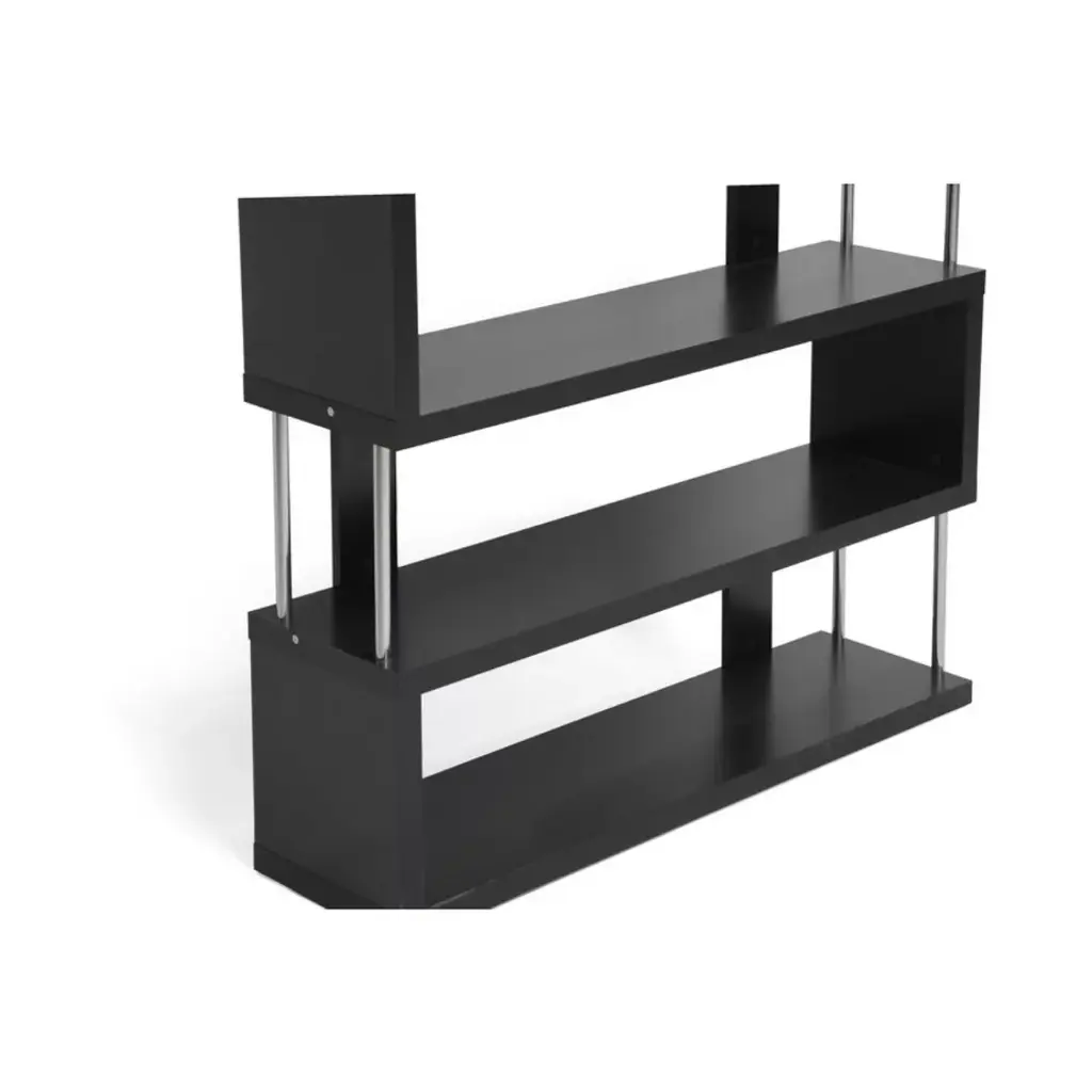 This artsy, modern bookcase gets you organized with style. Our Barnes Bookcase is made of faux wood grain paper veneer over and engineered wood frame and features chromed steel side supports. Not only does this modern display shelf house books, but it is also the perfect place to show off your prized vases, décor, and home accents. The Barnes Bookcase is Malaysian-made, requires assembly, and should be dry dusted. Separately offered is the Barnes Bookcase with six shelves. 38 inches high x 43 inches wide x 11 inches deep 38" high x 43" wide x 11" deep