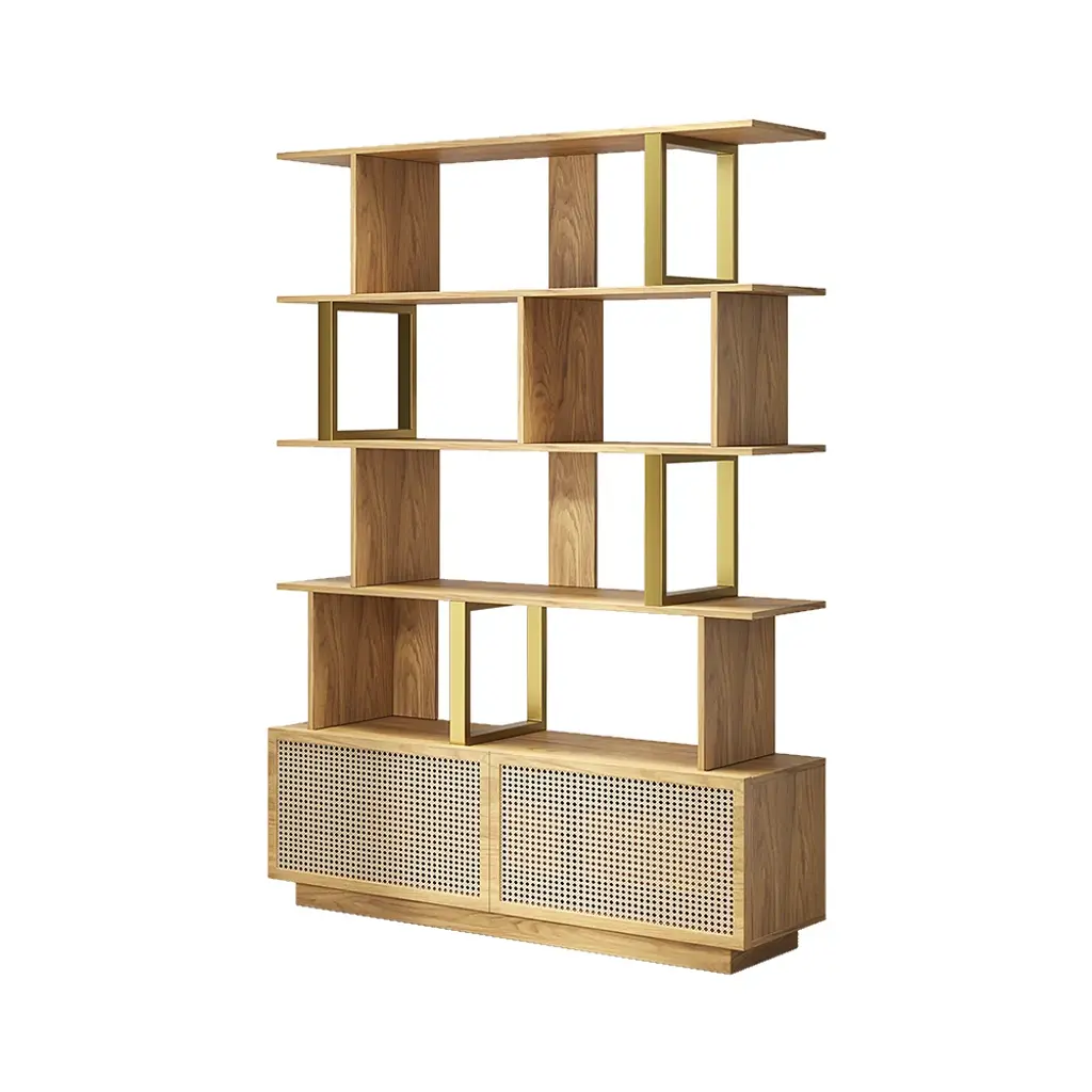 This natural wood bookshelf features five tiers and two doors for organized storage. The gold finish accents add modern elegance to any room's decor.
