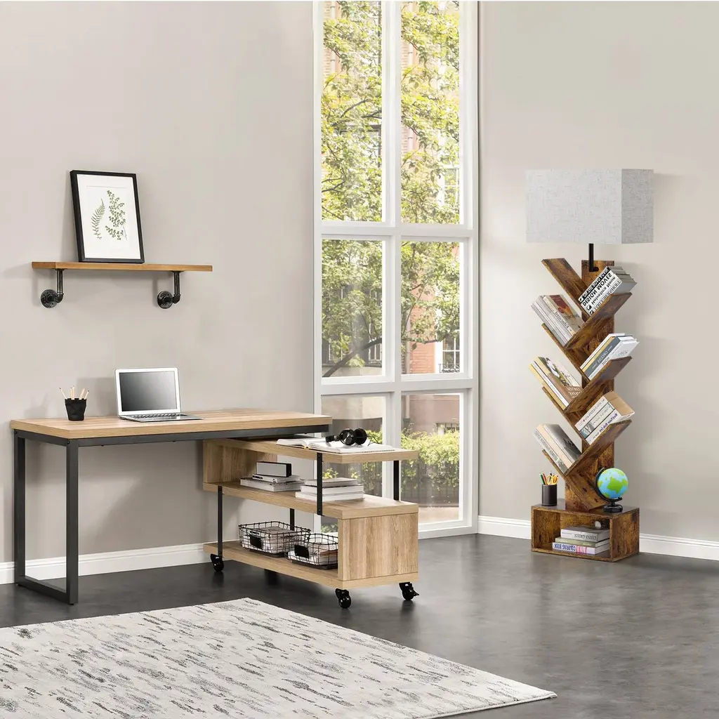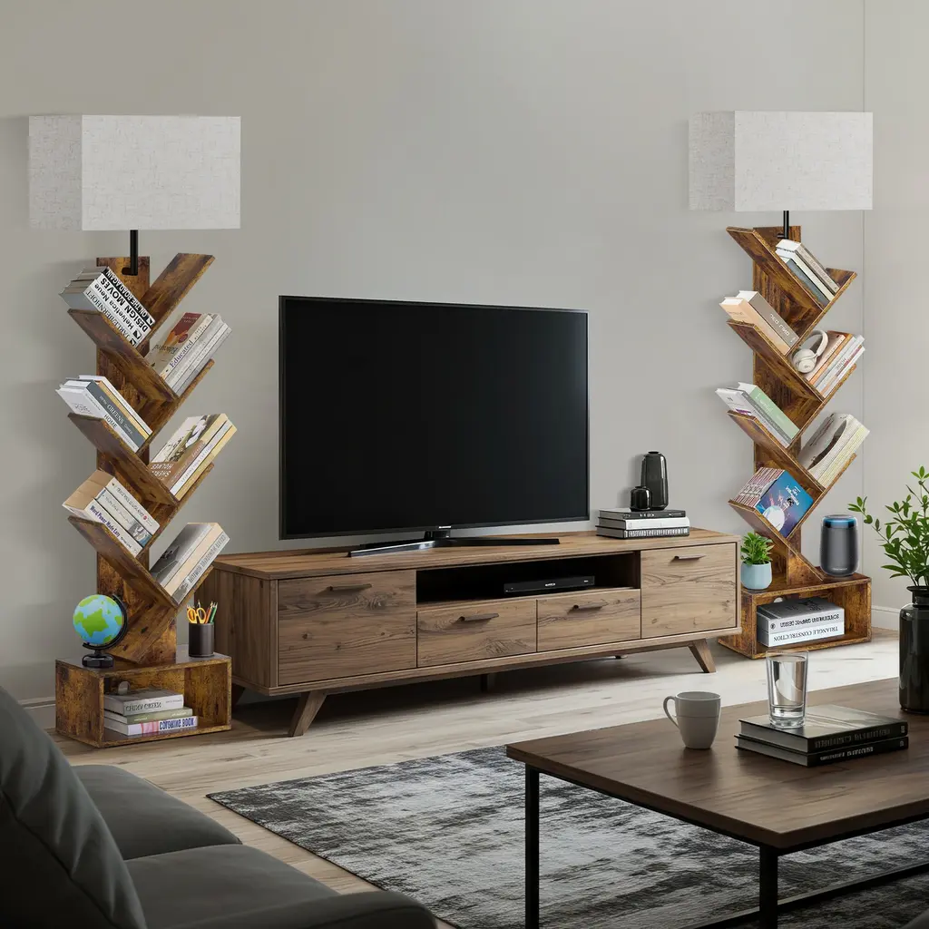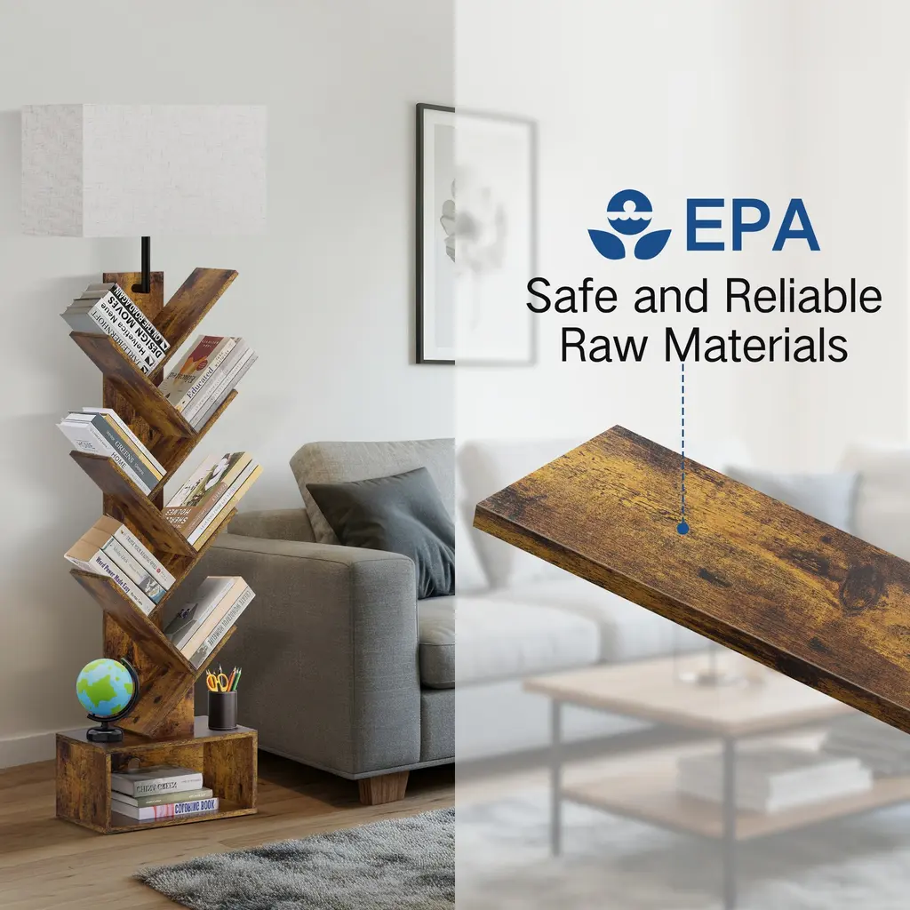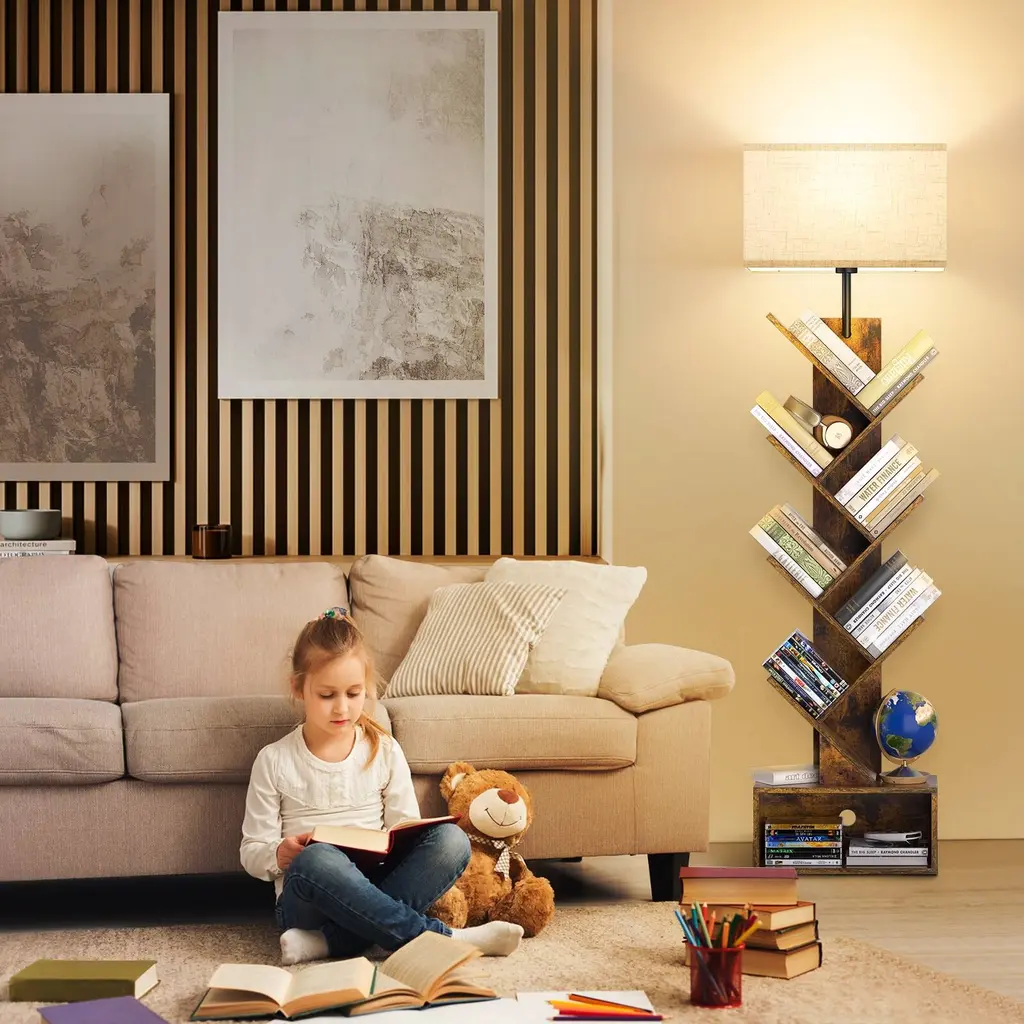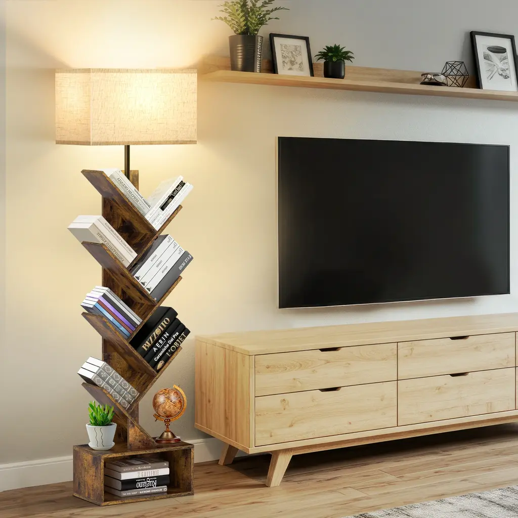 The bookshelf combines contemporary design with vintage colours for modern décor The bookshelf features a unique tree design with a spacious bottom drawer and sturdy base representing the roots of the entire bookshelf. There are 7 storage areas for a large number of books while adding style and appeal to your space. Featuring a full open display design for clear display and easy reading, it is suitable to be placed anywhere in your home, such as living room, bedroom, playroom, entryway and balcony.Features 🌟 Specifications 📐 Color Option🌟
