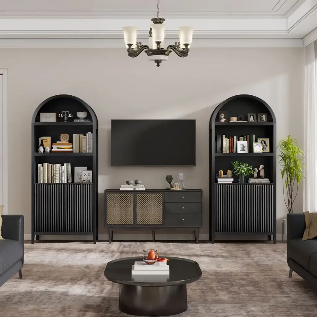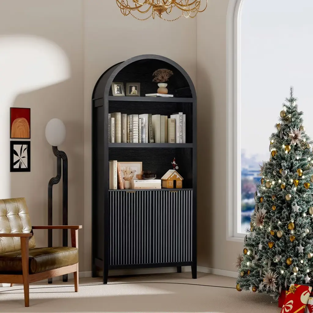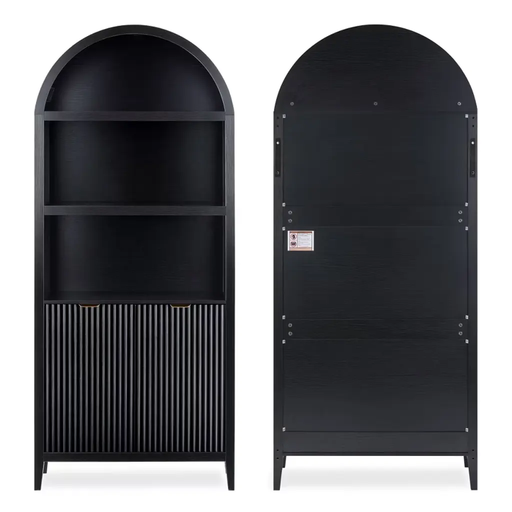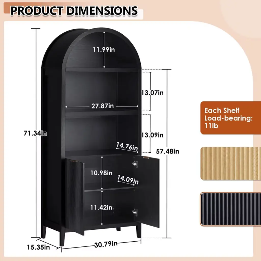71 Inch Black Arched Bookshelf Storage Cabinet With Doors, Oak Finish, 3 Open & 2 Adjustable Shelves, Robot Vacuum-friendly For Home Or Office